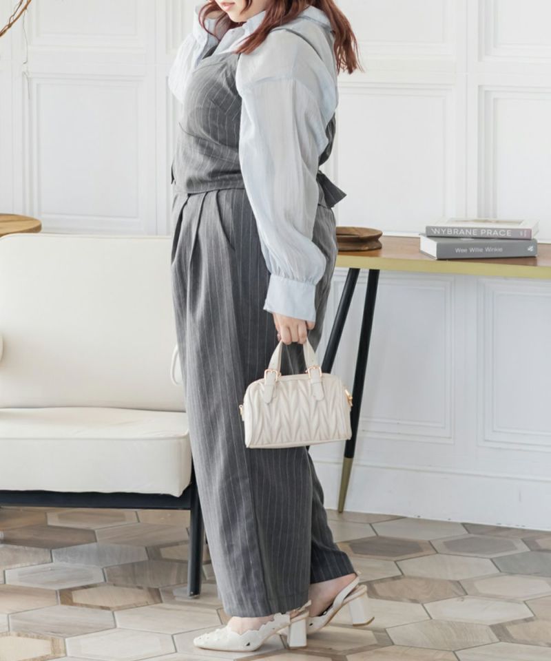 3Lを着用してちょうどいいサイズでした。程よくゆとりがありつつすっきり見えるシルエットで、楽ちんな着心地です!今っぽいストライプ柄がポイントで、トレンドっぽい可愛い系のトップスとも、シンプルなトップスとも相性がいいのでおすすめです。オールシーズン使える便利なワイドパンツです!さらっとした落ち感素材にストライプ柄をのせたワイドパンツは、脚のラインを拾わずリラックスして着られるのに、きちんと見えするのも嬉しい!後ろウエストゴムでストレスフリーに穿けて、長時間のお出かけにも快適です◎