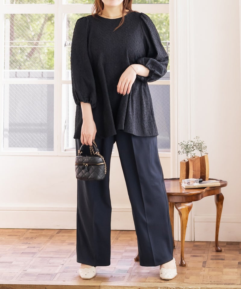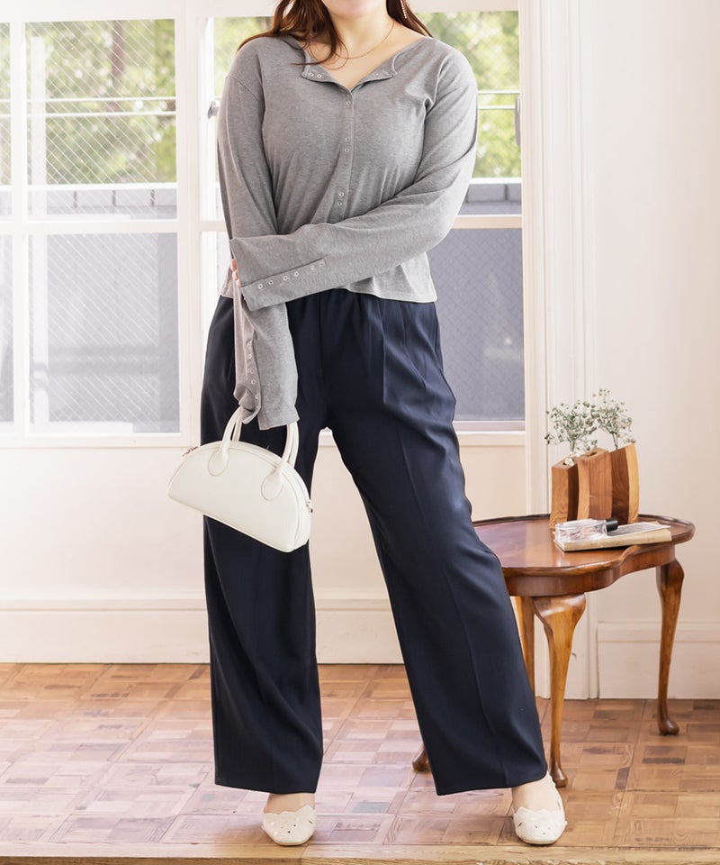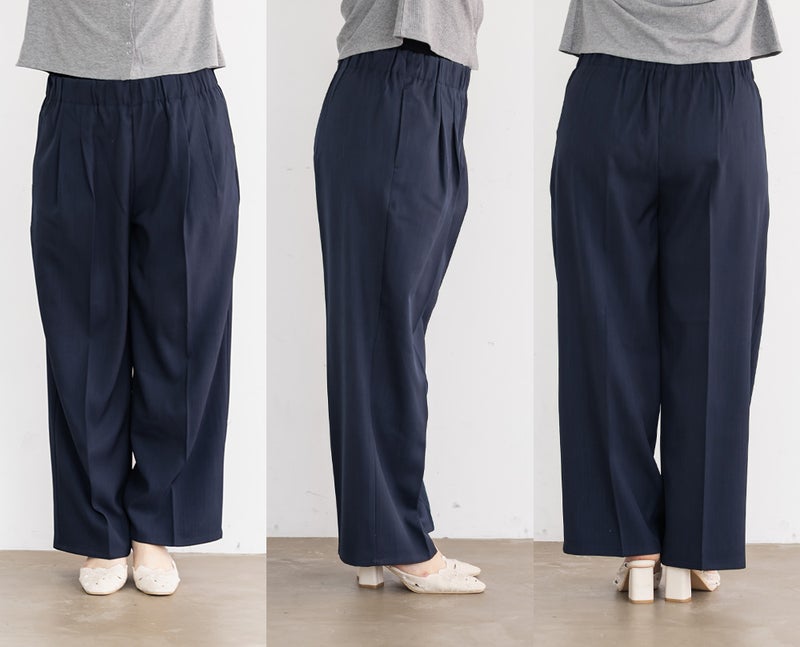3Lサイズを着用しました。ウエストは程よくフィットし、全体的にちょうどいい着心地でした。ダブルタック入りでお腹まわりにゆとりがありつつ、センタープレスが縦のラインを強調してくれるので、すっきりとした印象に仕上がります♪