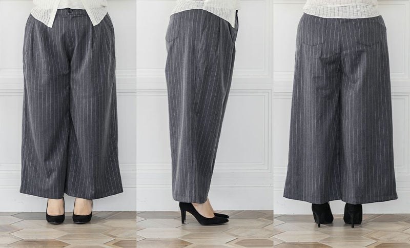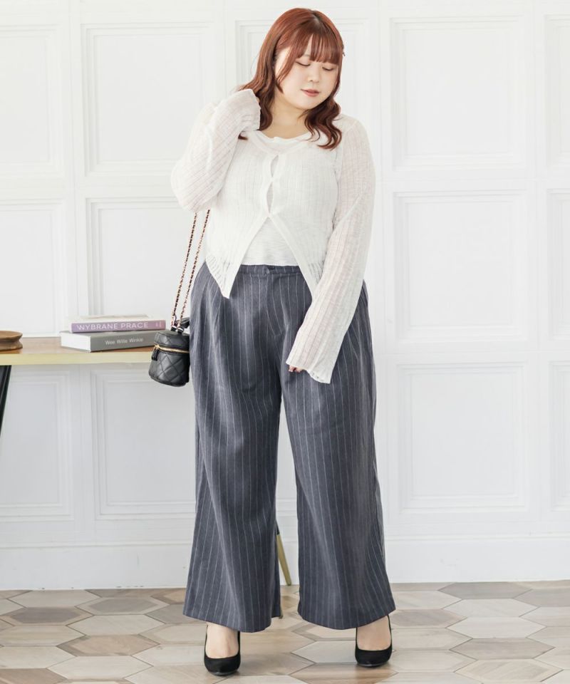 3Lを着用してちょうどいいサイズでした。程よくゆとりがありつつすっきり見えるシルエットで、楽ちんな着心地です!今っぽいストライプ柄がポイントで、トレンドっぽい可愛い系のトップスとも、シンプルなトップスとも相性がいいのでおすすめです。オールシーズン使える便利なワイドパンツです!さらっとした落ち感素材にストライプ柄をのせたワイドパンツは、脚のラインを拾わずリラックスして着られるのに、きちんと見えするのも嬉しい!後ろウエストゴムでストレスフリーに穿けて、長時間のお出かけにも快適です◎