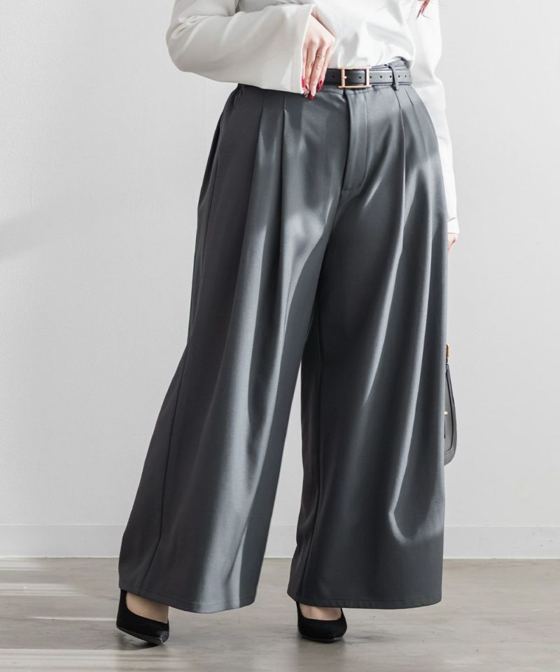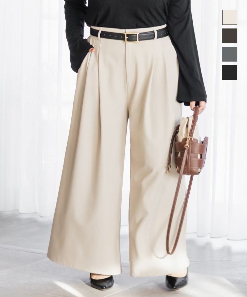 【design】お腹や腰回りをすっきりとさせて、足を長く見せるタックデザインがポイントのワイドパンツ。前にも後にもタックを入れる事で、気になる部分をカバーしつつ縦長効果をプラスしてスタイルアップできるデザイン。【material】シワになりづらい特性の布帛素材。ケアしやすくてオールシーズン使える素材感。程よくしっかりとした生地感だからボディラインも拾いづらい。【styling】普段使いはもちろん、お仕事やちょっとしたフォーマルシーンにも使えます。パンプスともスニーカーとも相性のいい、1枚あればコーディネートの幅が広がるアイテムです。