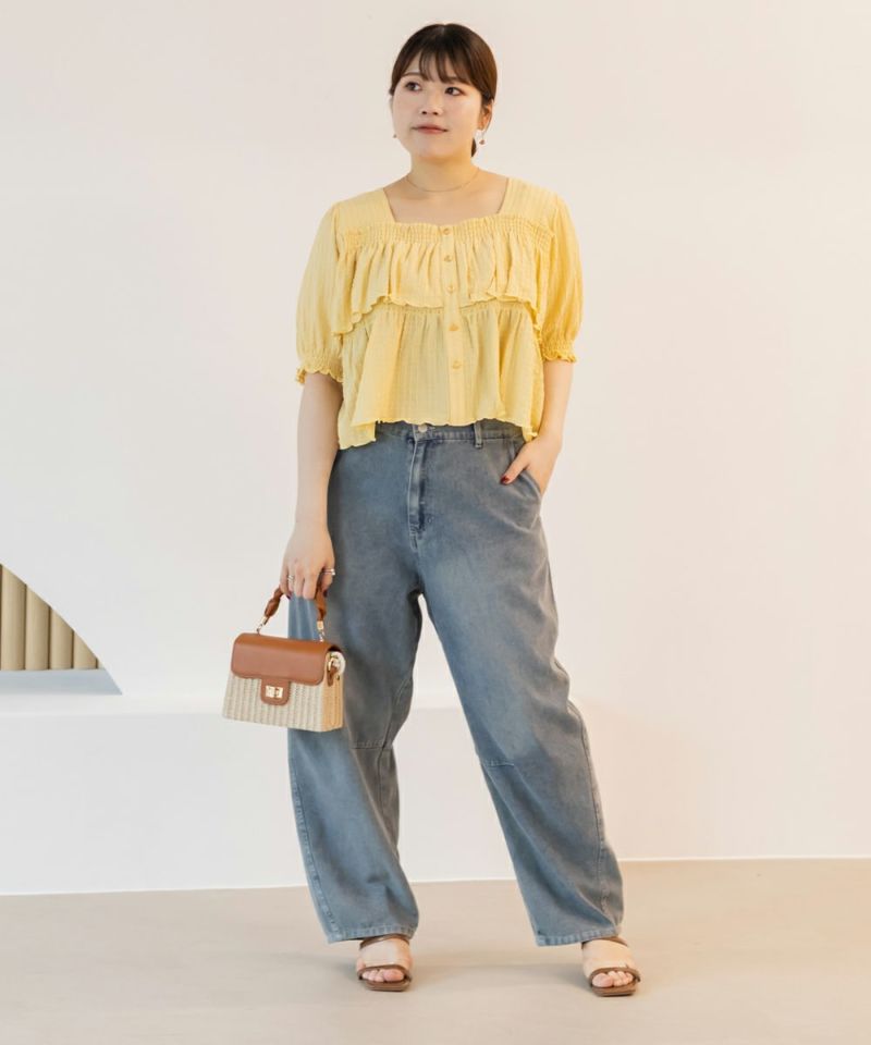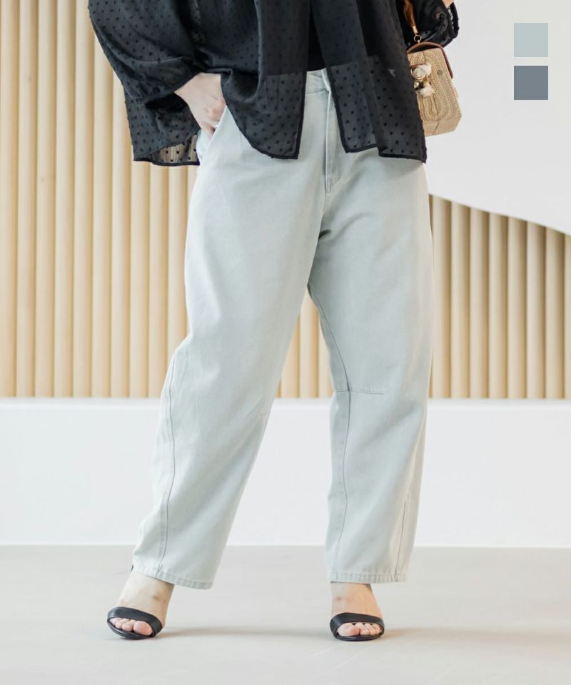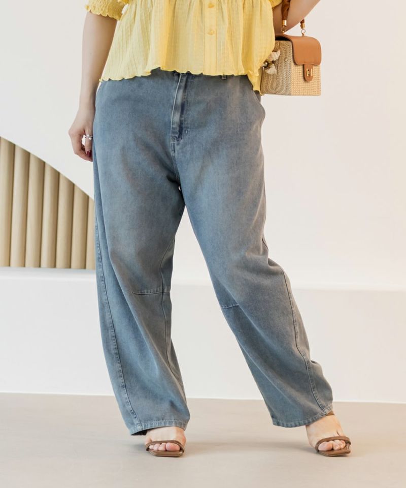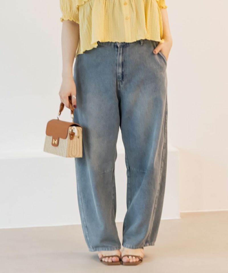 3Lを着てちょうどいいサイズでした。ウエストゴムなのでらくちんに着脱できました!トレンド感たっぷりのバレルレッグのワイドめなデニムパンツで、着るだけでお洒落な印象です◎涼し気な夏向きのデニムで快適に過ごせそうです♪カジュアルなデニムだけどキレイめにも合わせやすいシルエットでジャケットやシャツ・ブラウスと相性良くコーデできます!