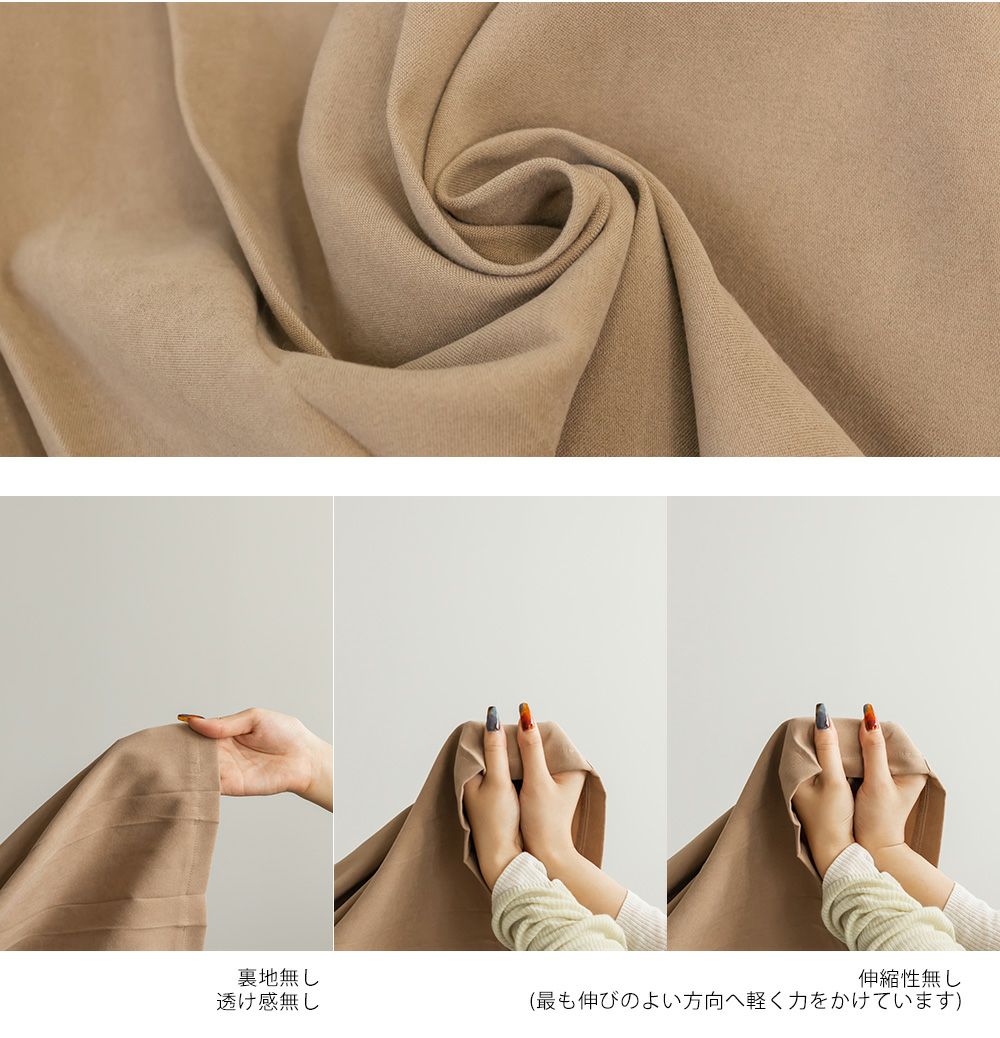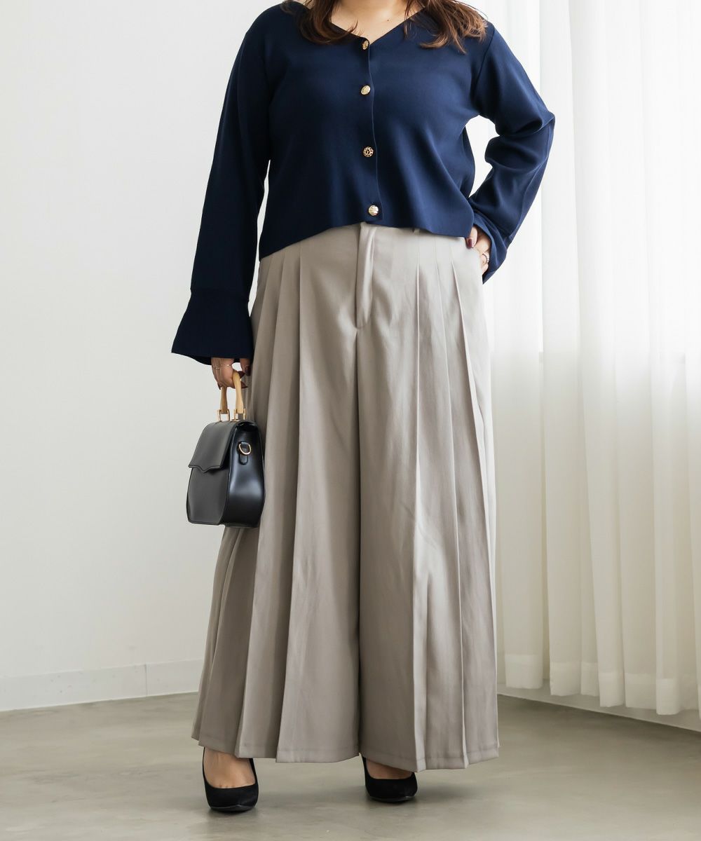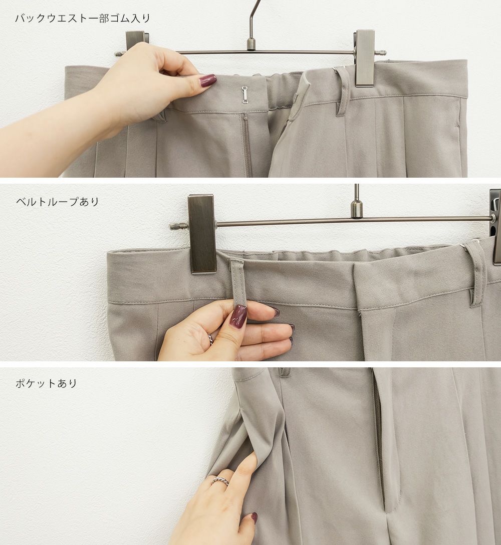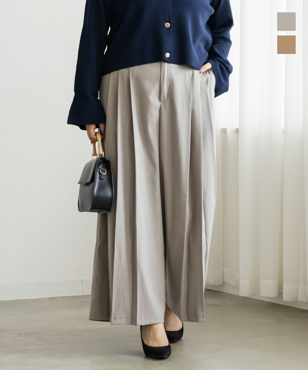 3Lを着用してちょうどいいサイズでした。程よくゆとりがありつつすっきり見えるシルエットで、楽ちんな着心地です!後ろウエストゴムでストレスフリーに穿けて、長時間のお出かけにも快適です◎季節感のあるスエードっぽい生地ですが、薄手で軽いので、動きやすさもありました。プリーツデザインがお洒落でシンプルなトップスとも相性がいいのでスタイリングに悩まず着回しが出来ます。オールシーズン使える便利なワイドパンツは脚のラインを拾いずらくリラックスして着られるのに、きちんと見えするのも嬉しいです。デイリーからお仕事までつかえる万能な1本です。