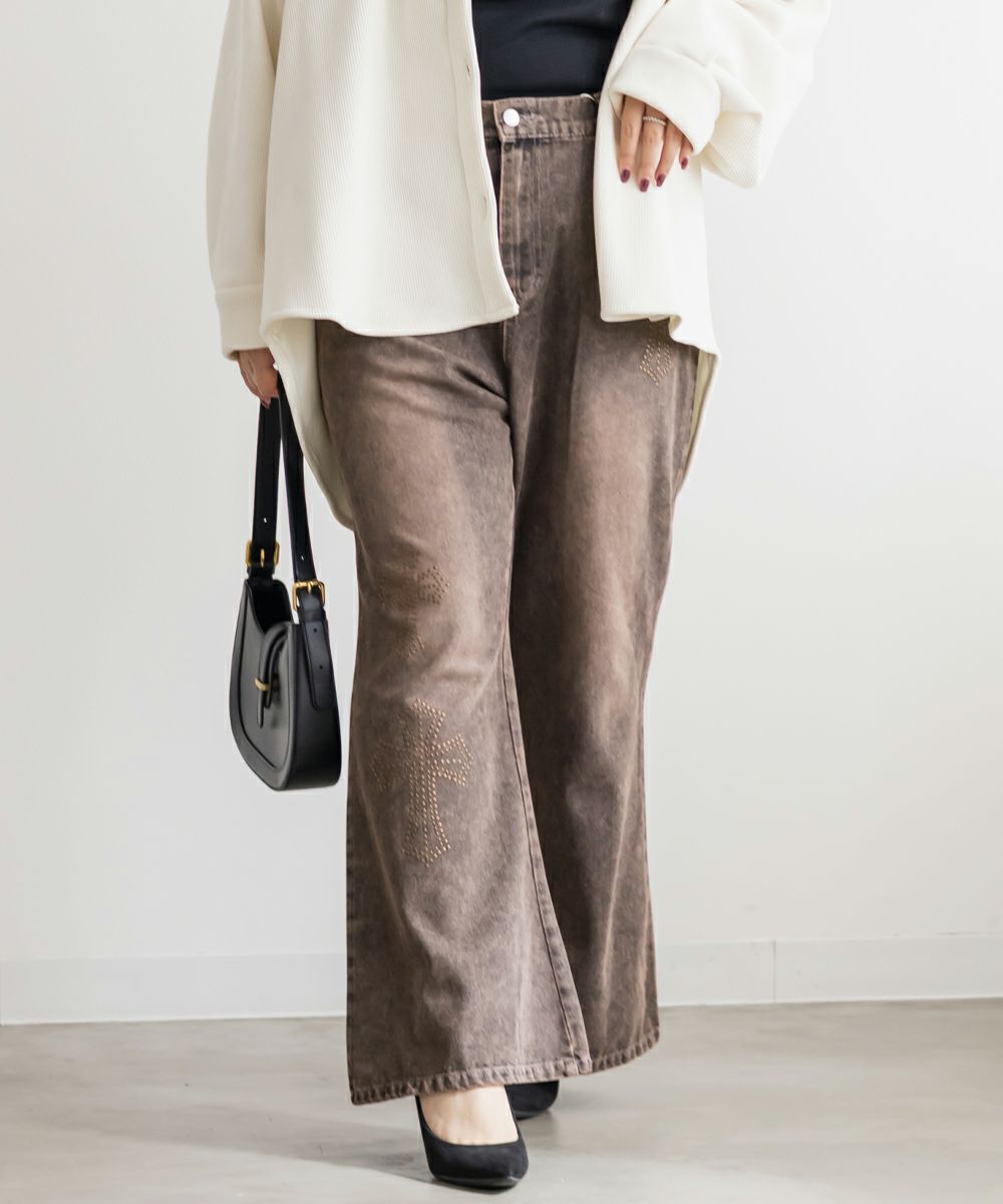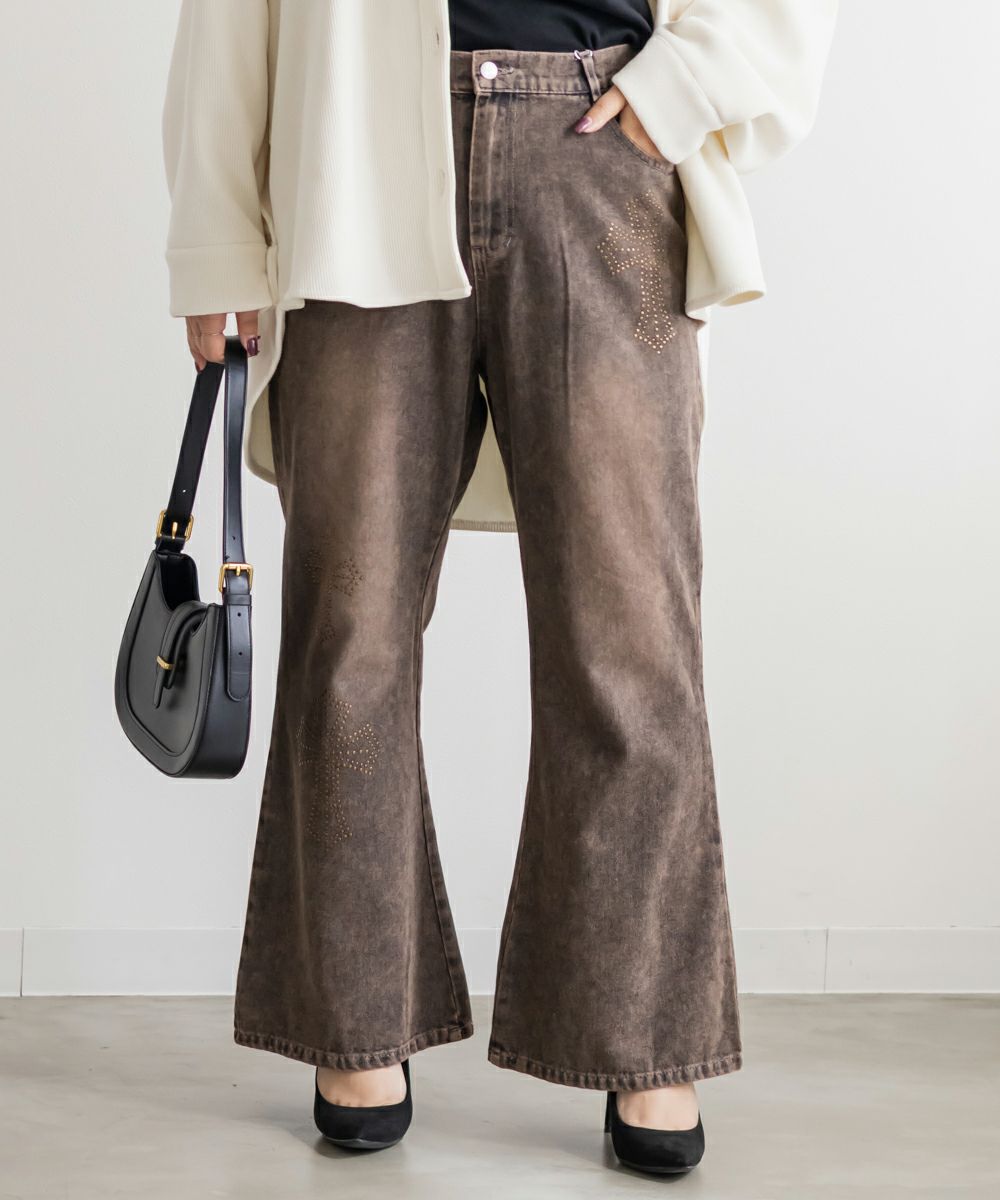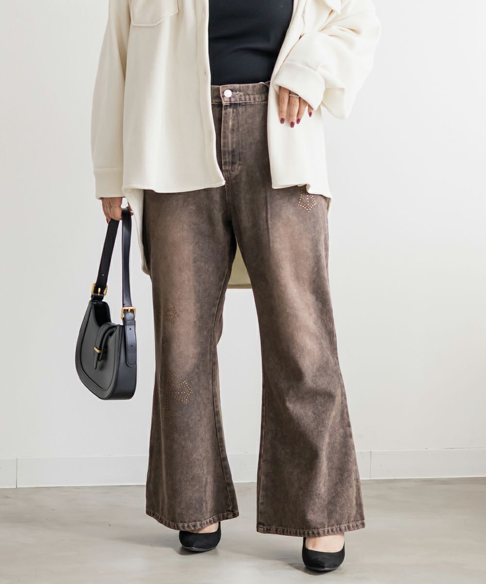 3Lサイズを着用して、ちょうどいいサイズ感でした! フレアシルエットが脚のラインをきれいに見せてくれて、スタイルアップ効果も抜群です!今っぽいスタッズのデザインがアクセントになっていて、シンプルトップス合わせでもおしゃれ見えが叶います◎ 生地は軽めのデニムで、動きやすさもあります。デニムの色味・加工感が可愛くて、スタイリングを格上げしてくれる1本です!