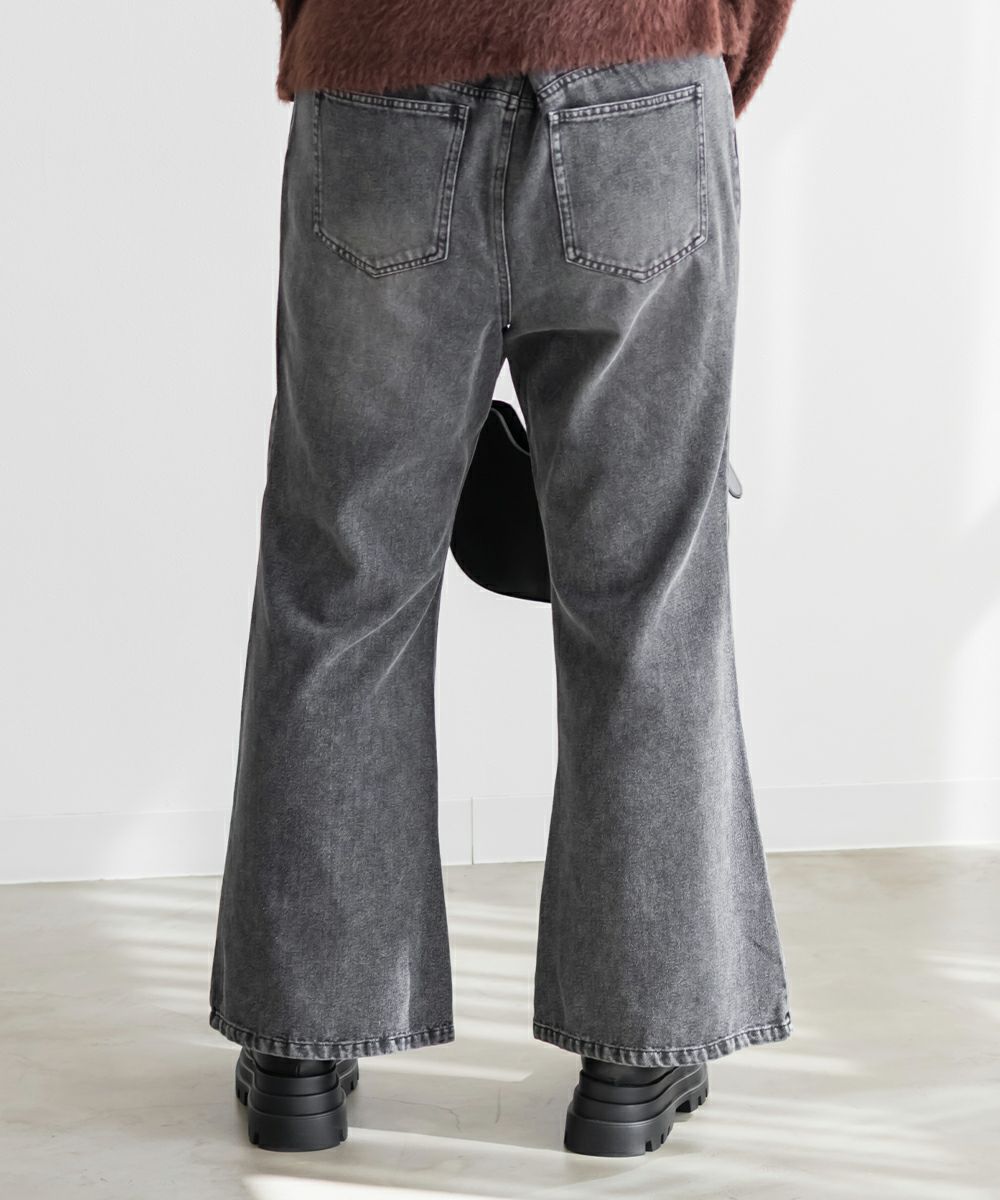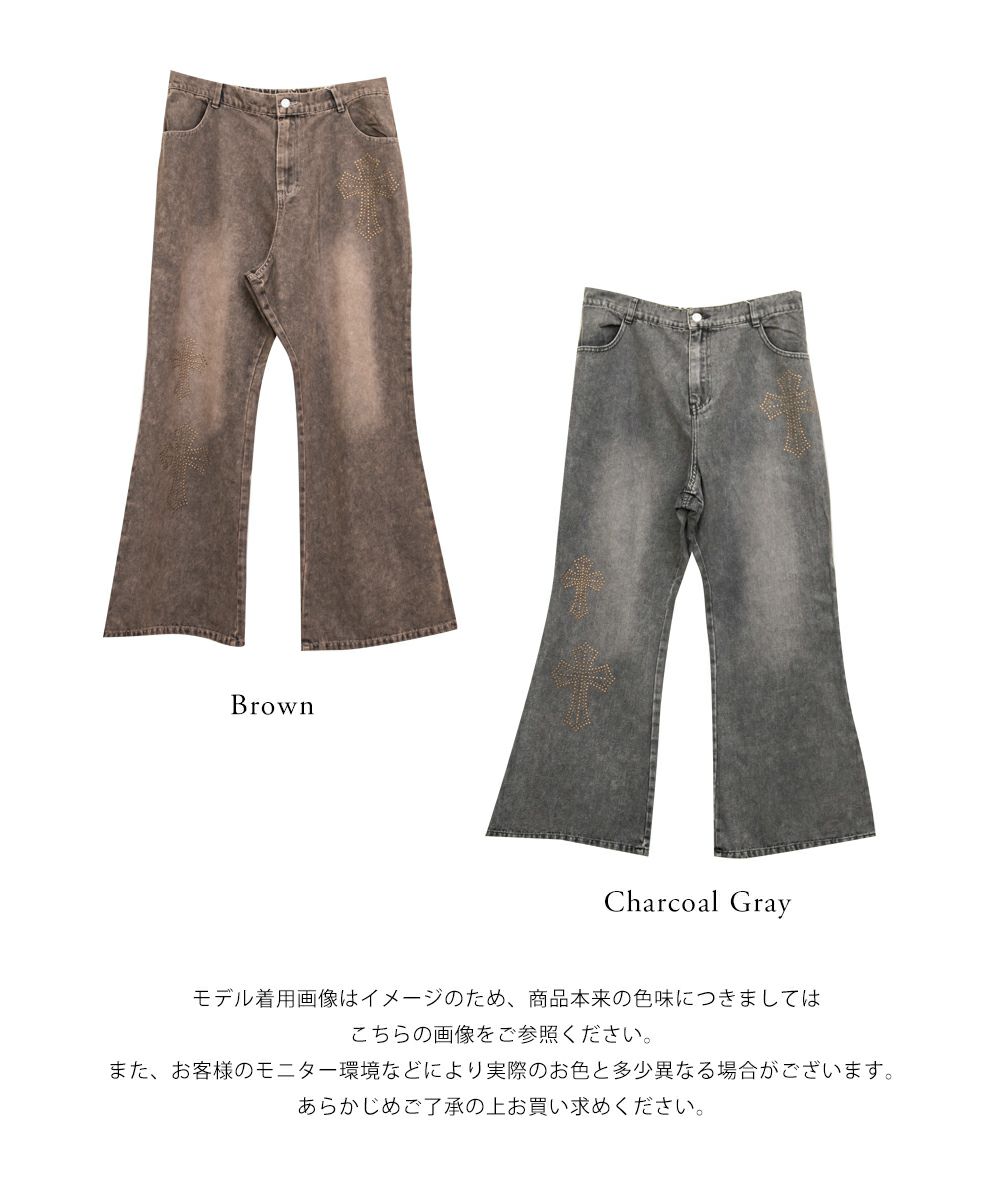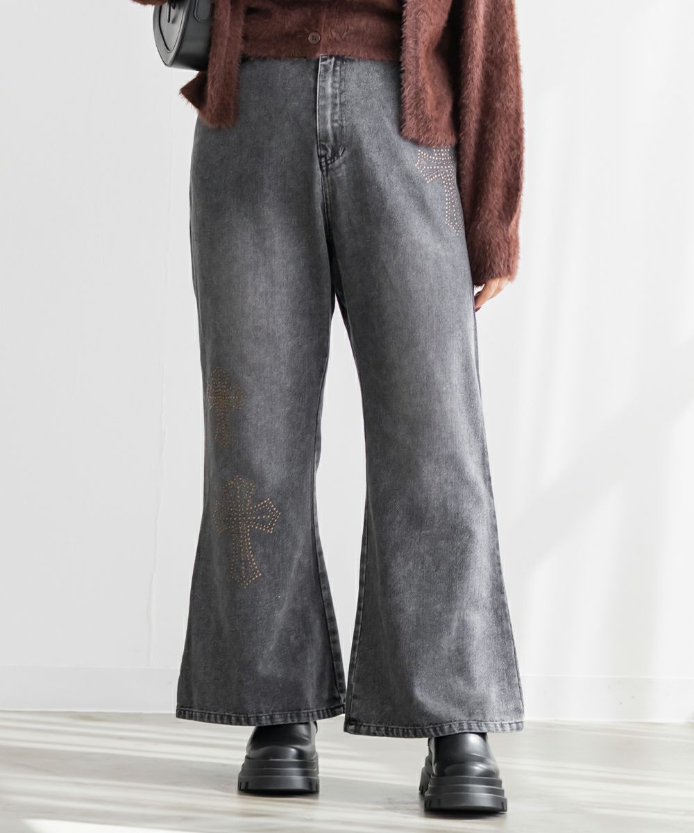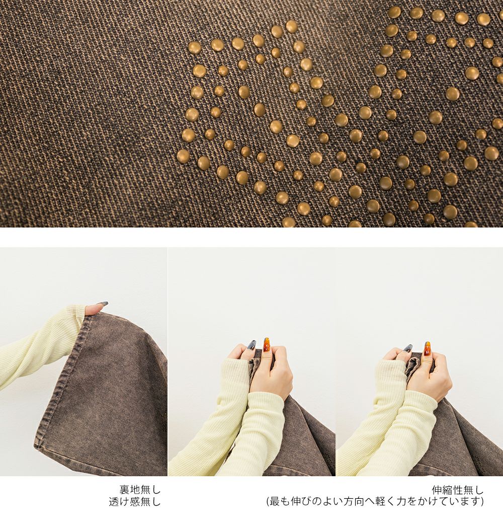 3Lサイズを着用して、ちょうどいいサイズ感でした! フレアシルエットが脚のラインをきれいに見せてくれて、スタイルアップ効果も抜群です!今っぽいスタッズのデザインがアクセントになっていて、シンプルトップス合わせでもおしゃれ見えが叶います◎ 生地は軽めのデニムで、動きやすさもあります。デニムの色味・加工感が可愛くて、スタイリングを格上げしてくれる1本です!