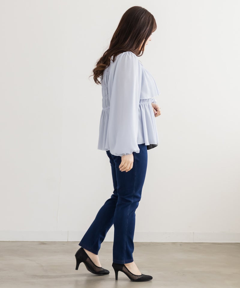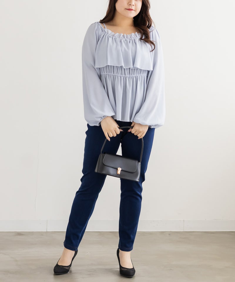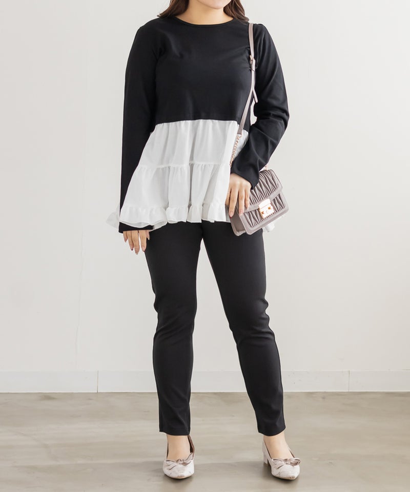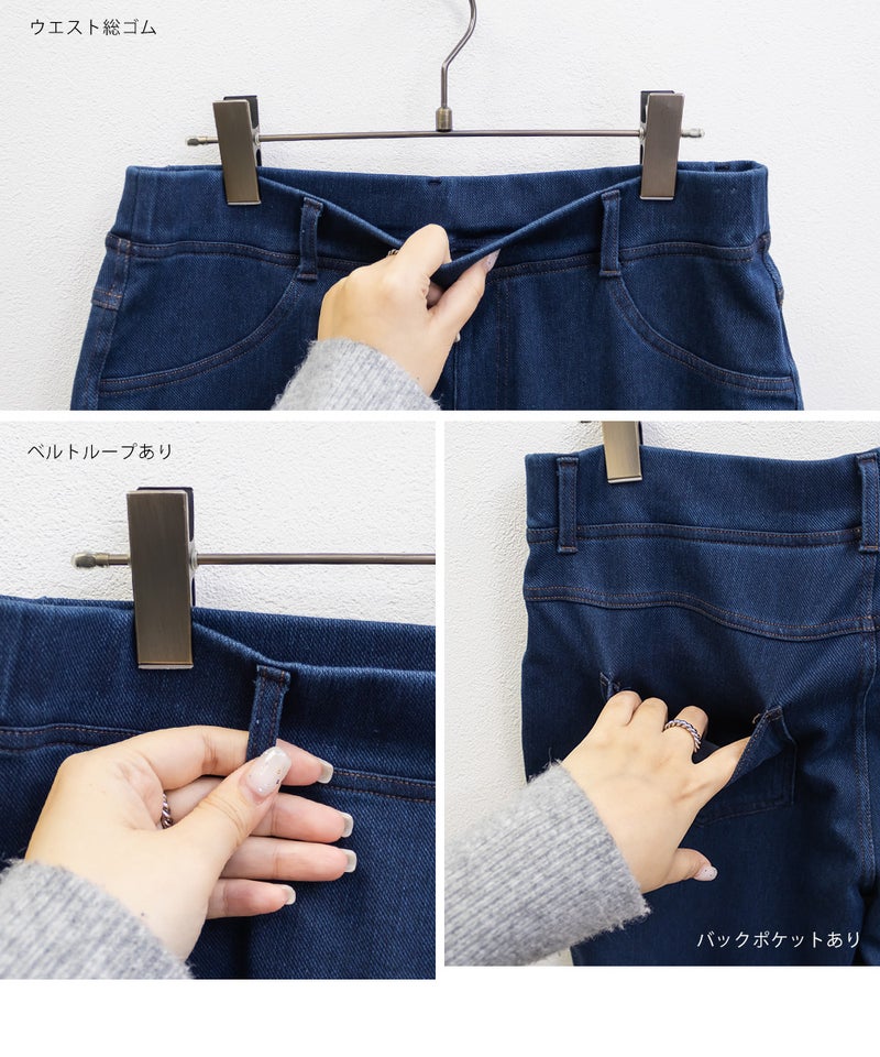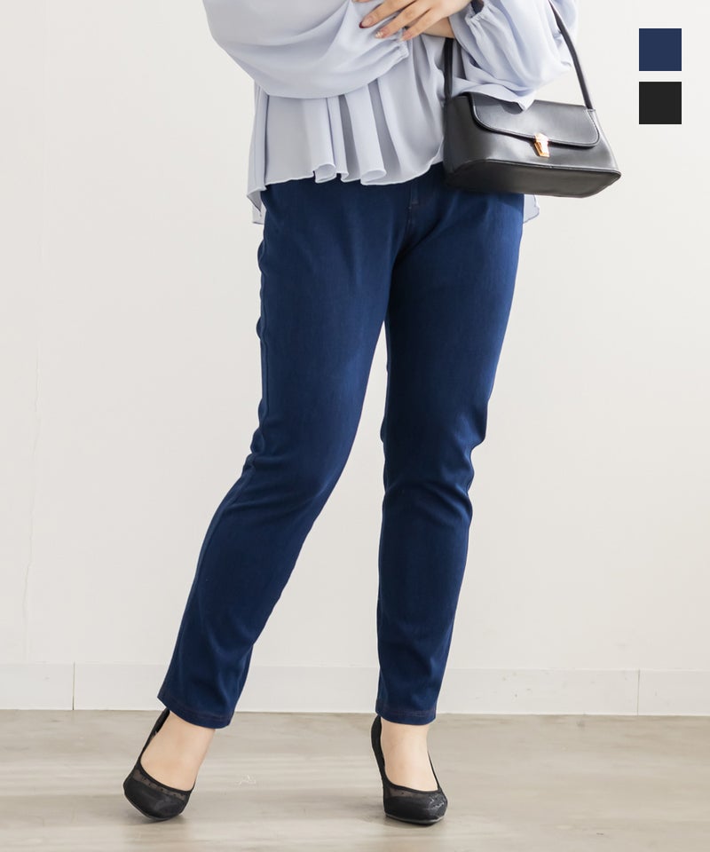 LLサイズを着用してジャストサイズでした。ウエストゴム仕様と伸びの良いストレッチ素材が動きやすくてノンストレスな着心地でした!フィットしたシルエットのスキニーパンツはスタイルアップ効果があり、華奢見えします!らくちんな生地感なのに、すっきりして見える美脚アイテムです!定番カラーで合わせやすく、ロングシーズン着用できます。
