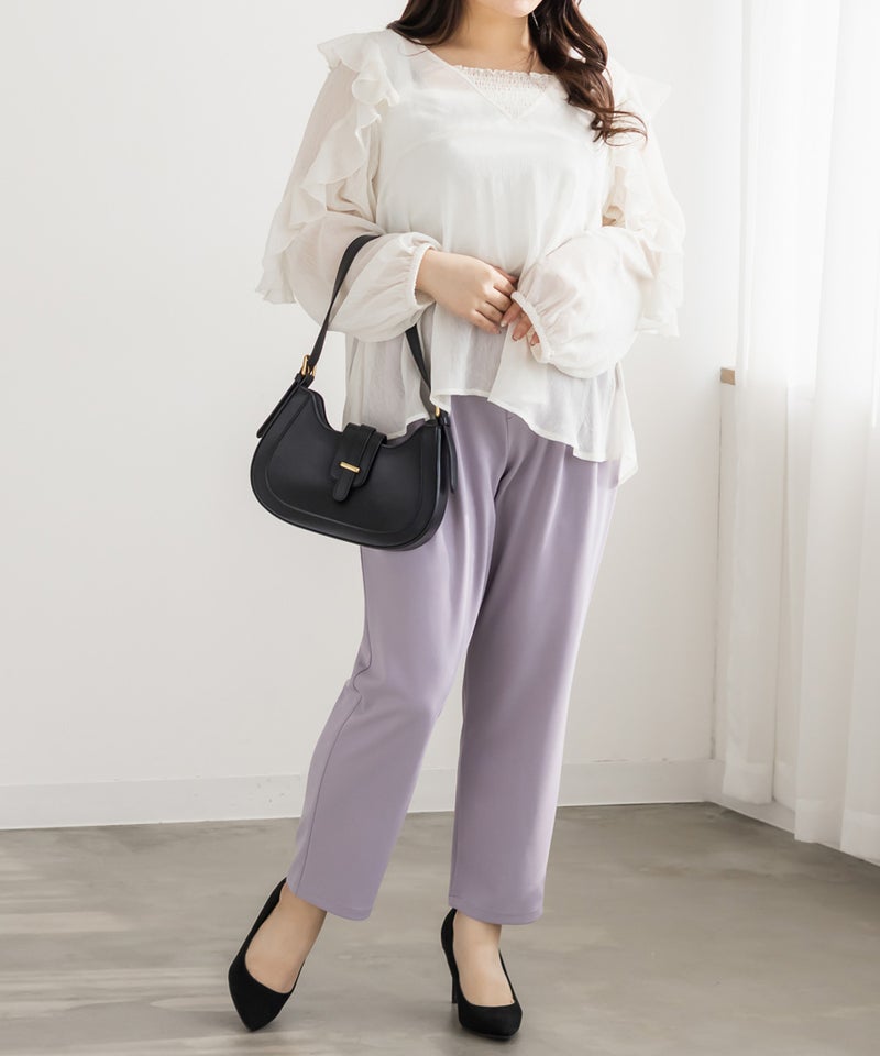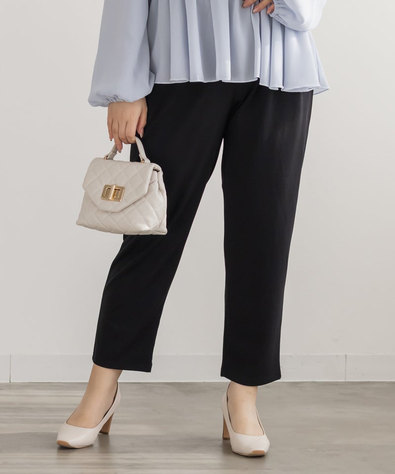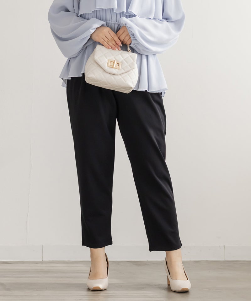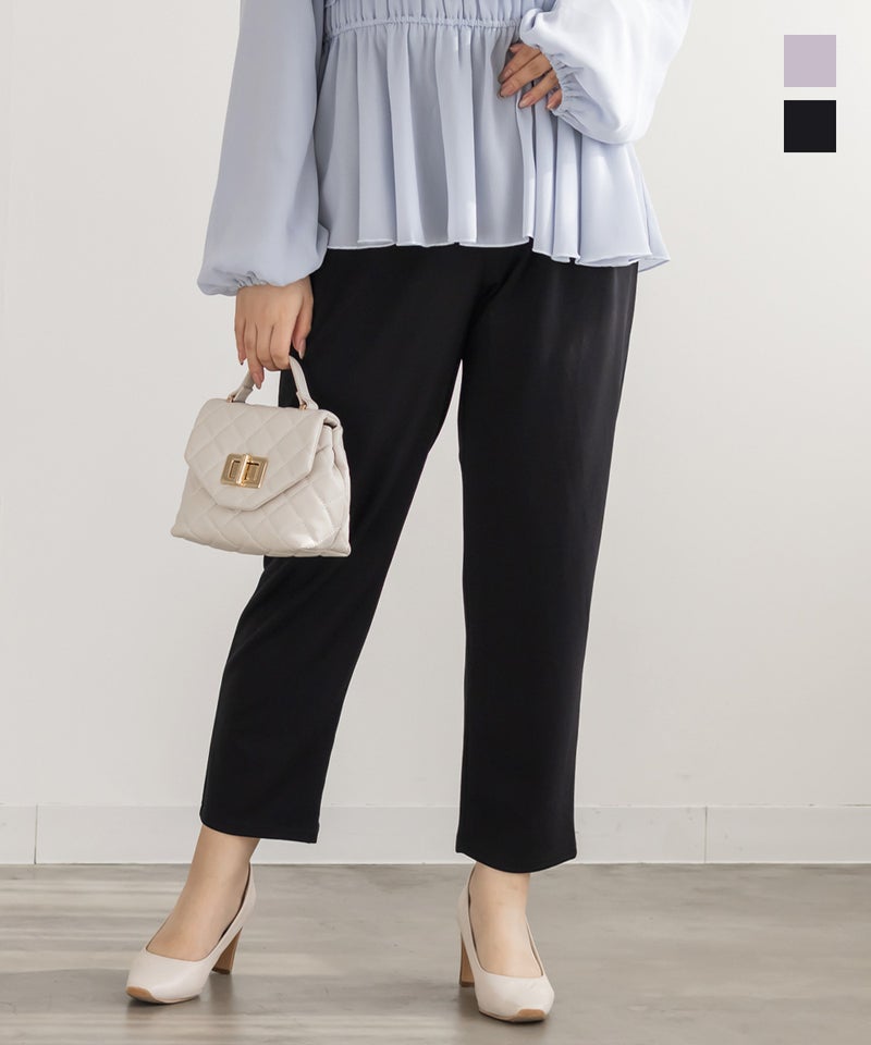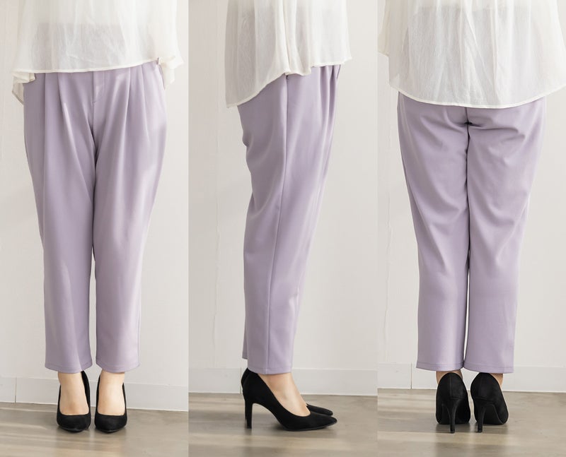LLサイズを着用してちょうどいいサイズ感でした。後ろはゴム仕様になっているので、らくちんに履くことできました!生地自体もやわらかくて、伸縮性もすごくいいので動きやすくノンストレスです。足元に向かってすっきり細くなるテーパードシルエットで美脚効果のある1枚です。オールシーズン着まわせるデザイン・生地感なので、普段使いはもちろん、お仕事や綺麗目な服装が必要なシーンでも活躍しそうです!
