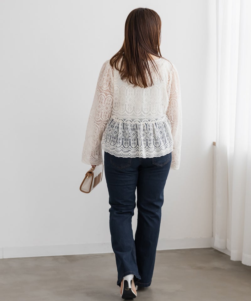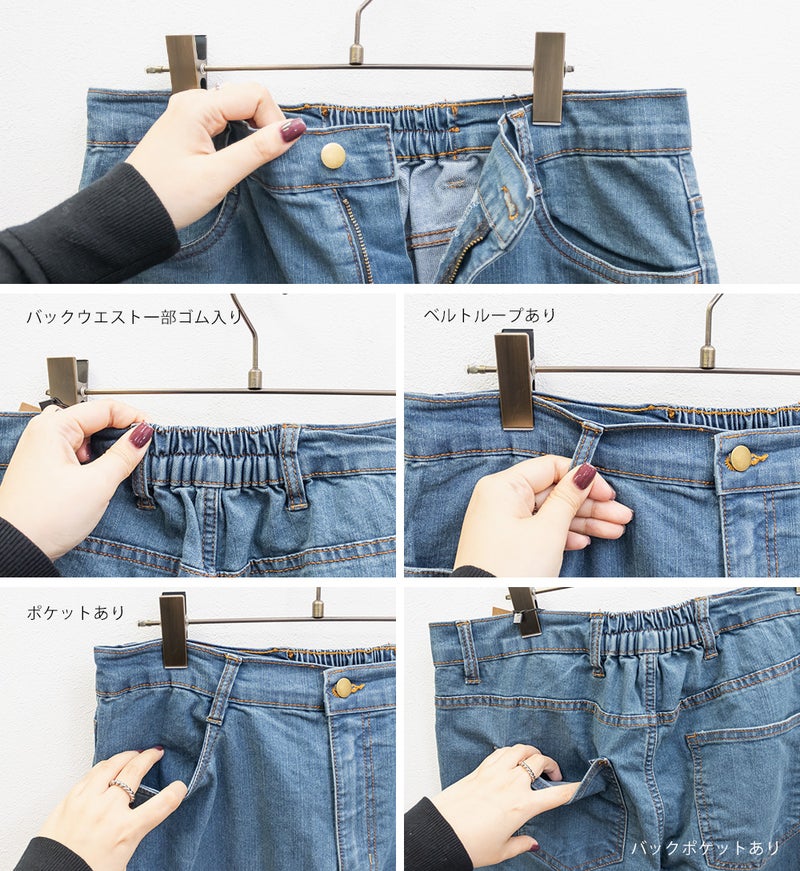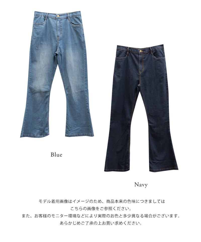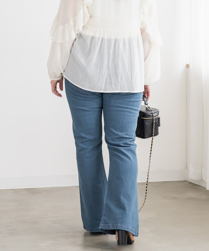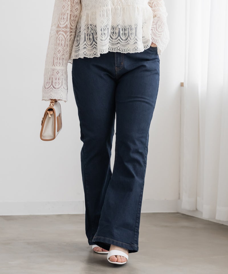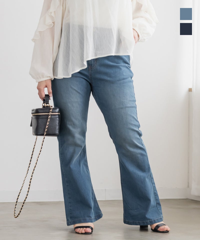 3Lサイズを着用してジャストサイズでした。デニムでもカジュアルになりすぎずに女性らしい印象になれるフレアシルエットで、ストレッチ性が抜群で窮屈感無くノンストレスに着用出来ました。美脚に見えるパンツでどんなトップスでも合わせやすい形なのが嬉しいです♪定番のデニムカラーでオールシーズン使えて1本あると便利なデニムパンツです。