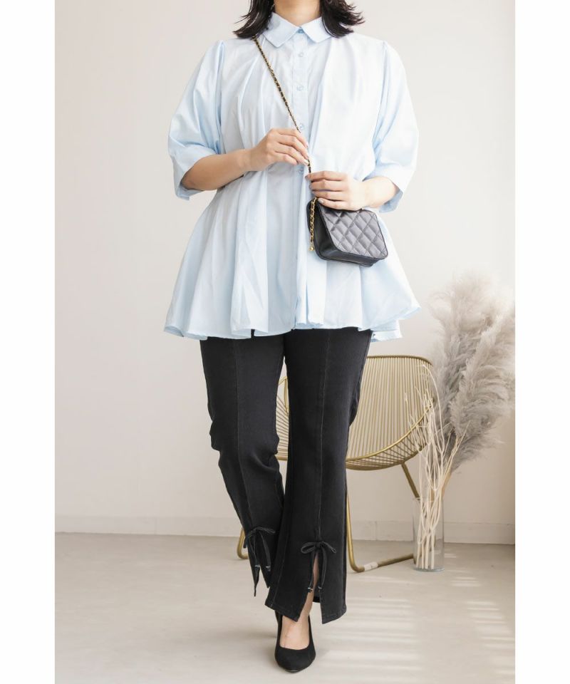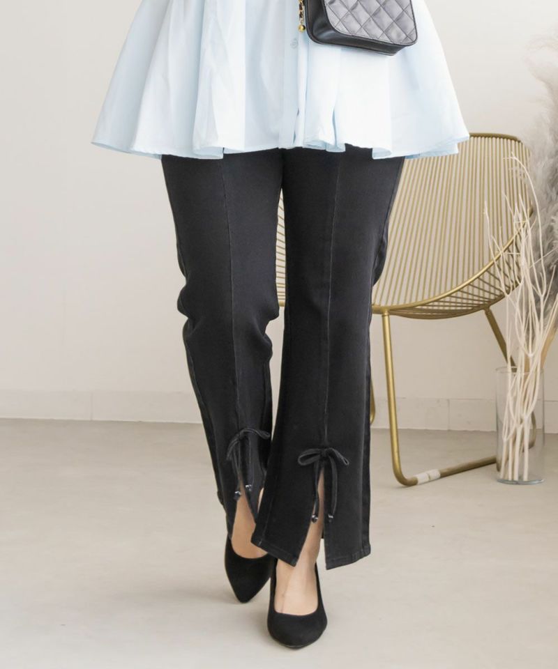 LLを着てちょうどいいサイズでした。股上が浅くなくしっかりとあって、ウエストゴムで生地自体の伸縮性もあるので安心感のある履き心地◎足部分もしっかりストレッチがあるので動きやすいです◎リボンとスリットがポイントのデザインで、デニムでもカジュアルになりすぎずに女性らしい印象になれます。太もも周りすっきりで裾がフレアになっていて、穿くだけで美脚になれちゃいます!オールシーズン使えるので、1本あると便利なデニムパンツです。