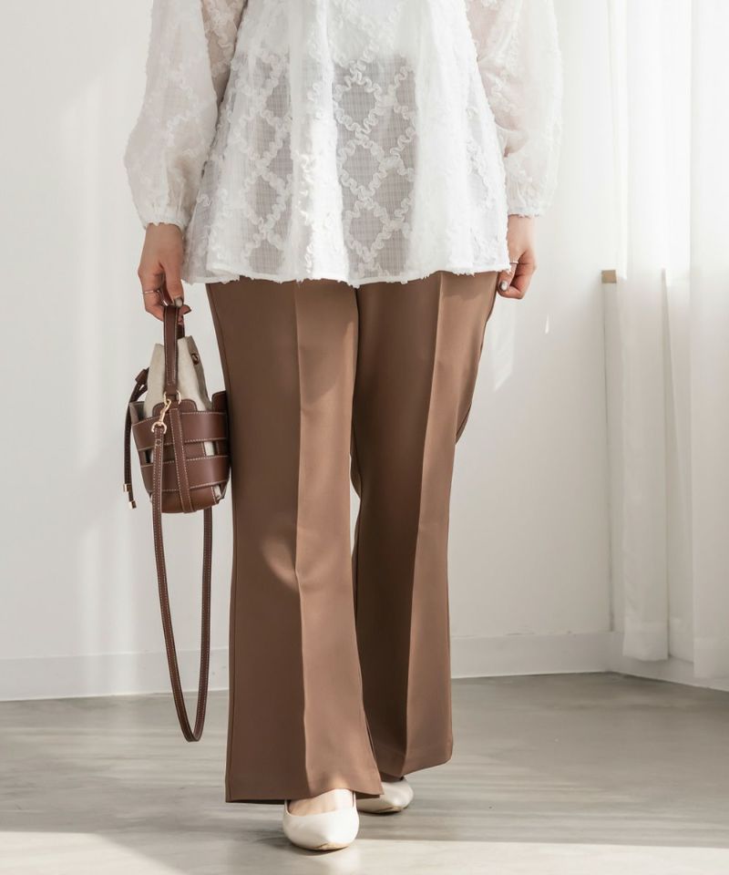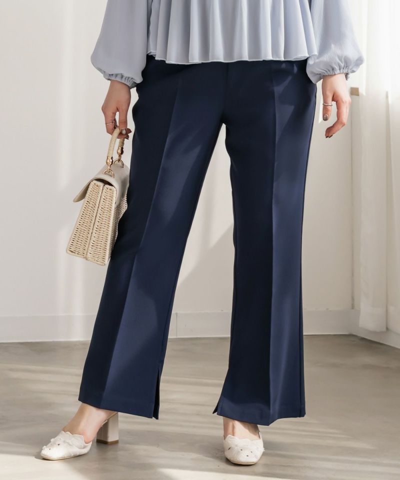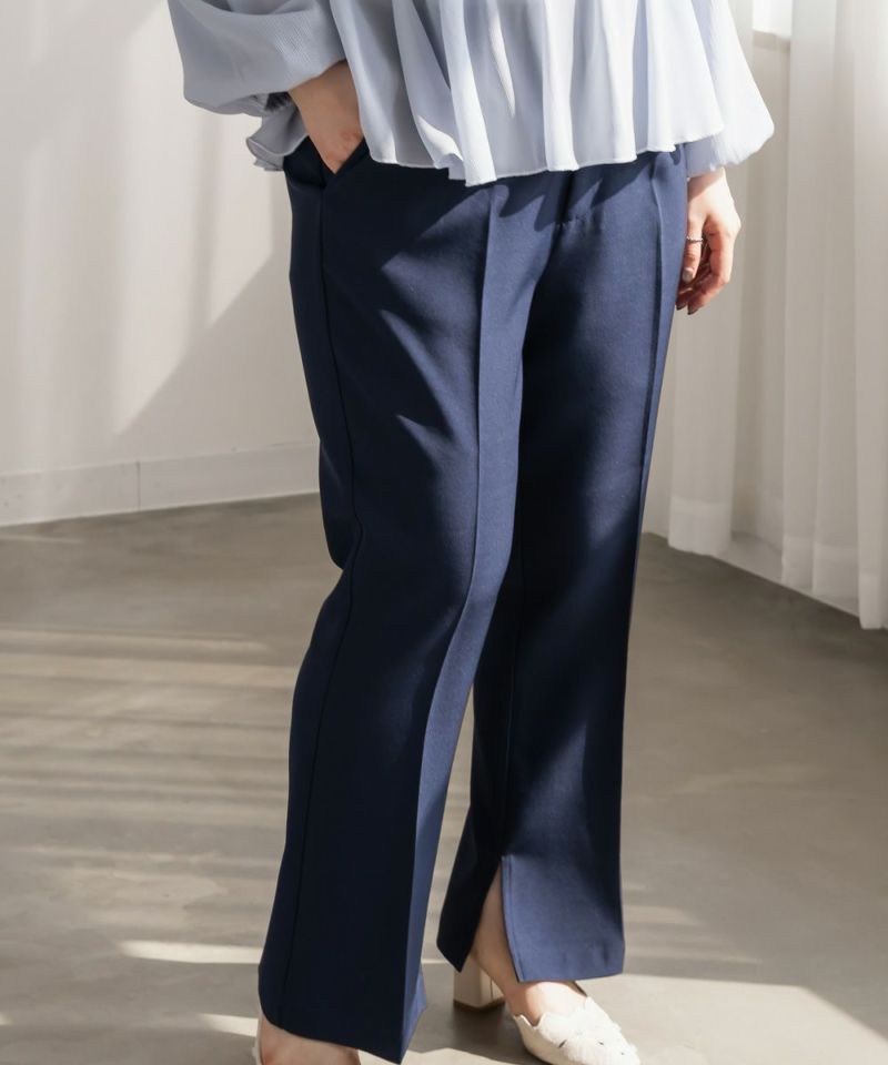 【design】センタープレスラインにフレアシルエットが美脚効果を発揮。裾スリットが程よい抜け感を出し、きれいに魅せるのに履きやすい前開きデザインと、後ろウエストがゴム仕様でラクチン。着回し万能なベーシックカラー。【material】程よい厚みできれいめな布帛素材。オールシーズン着用可能。【styling】トップスをインしてもアウトしてもバランスよく着こなせます。カジュアルにもきれいめにも対応でき、幅広いシーンで活躍するアイテムです。ヒールやボリューム感のある靴と合わせることでさらに美脚効果アップ。