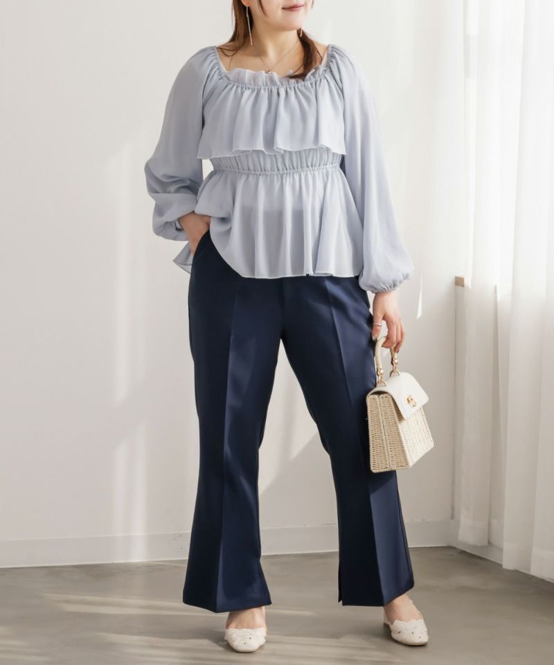 3Lサイズを着用してぴったりのサイズ感でした。ハリのあるきれいめな生地でカジュアルになりすぎずに女性らしい印象になれる1本です。ストレッチ性もあって窮屈感無くノンストレスに着用出来ました。フレアシルエットが美脚に見えるパンツでどんなトップスでも合わせやすい形なのが嬉しいです♪使いやすいカラバリで、オールシーズン・シーン問わず使えてあると便利なパンツです。