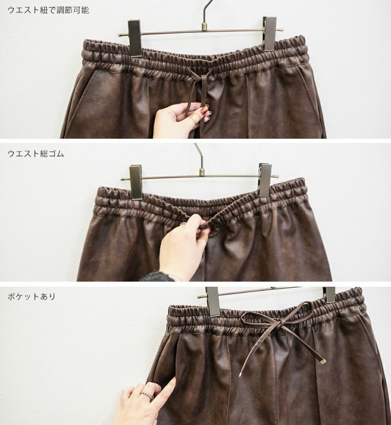 3Lを着てゆとりのある着心地でした。太ももやお尻まわりを拾わない程よくゆとりのあるシルエットで作られているので、ボディラインを拾わずすっきり着用出来ました◎ゴムなのとウエストは紐で調節可能なのでウエストは好きなサイズ感で着用できました。ハリのあるフェイクレザー生地で大人っぽい着こなしにも使いやすいです!