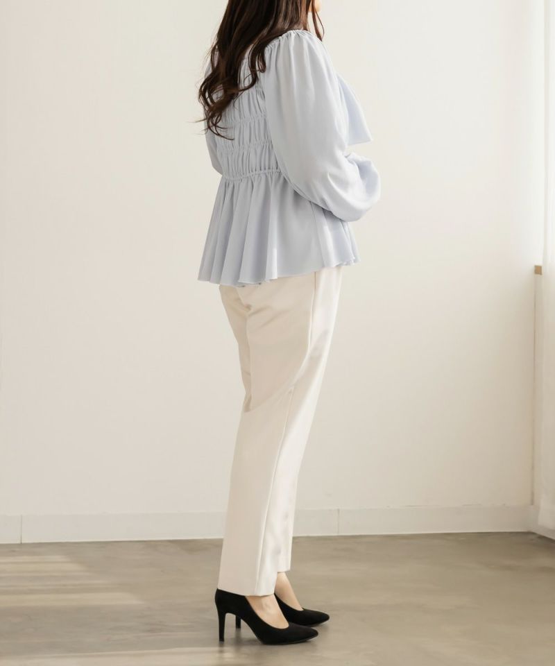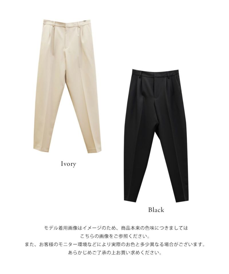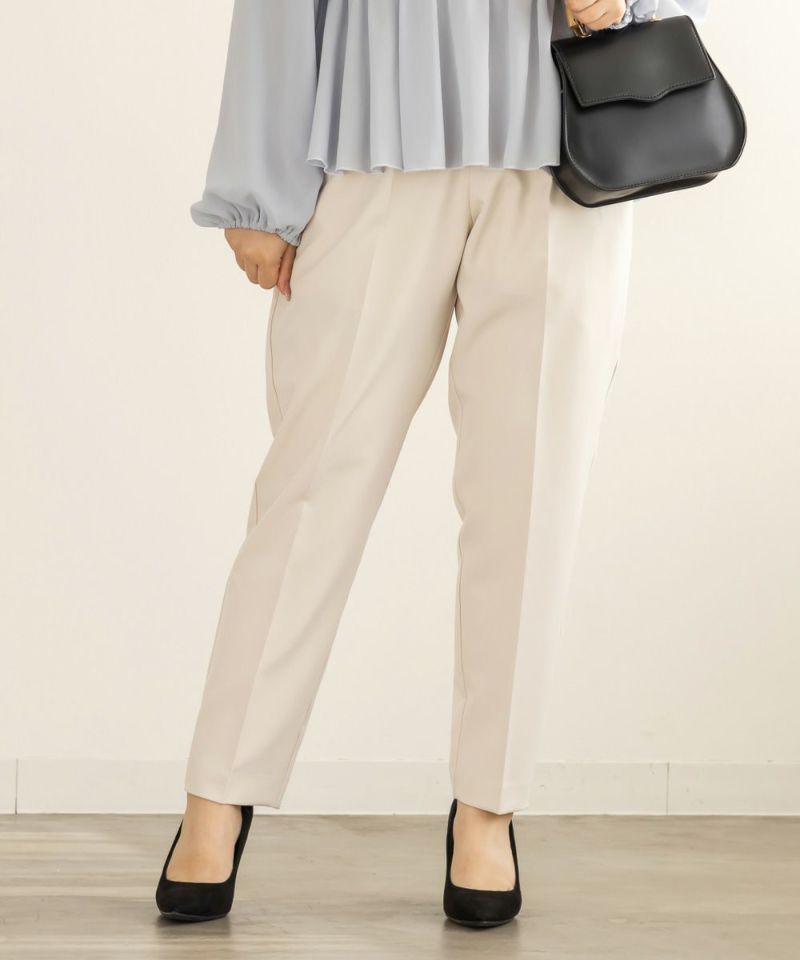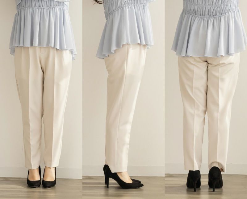 LLサイズを着用してジャストな着心地でした。後ろゴムで窮屈感無くちょうどよく着られました。綺麗なテーパードシルエットのパンツで、普段使いからお仕事・簡単なセレモニーシーンなどいろいろな着回しが可能な1枚です。足首が綺麗に見える丈感で、長めのブラウスやジャケットと合わせてもバランスよく見えます♪