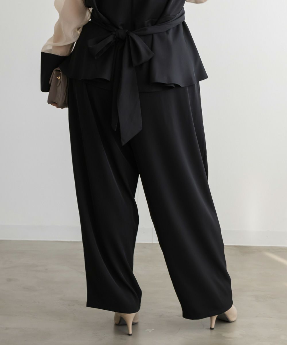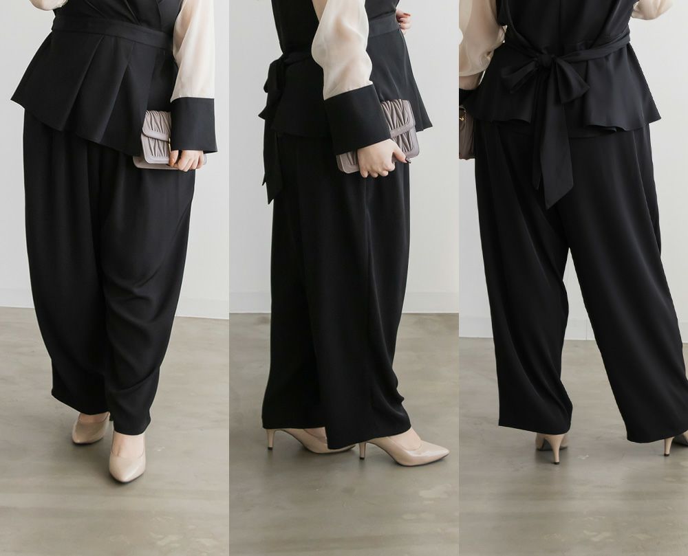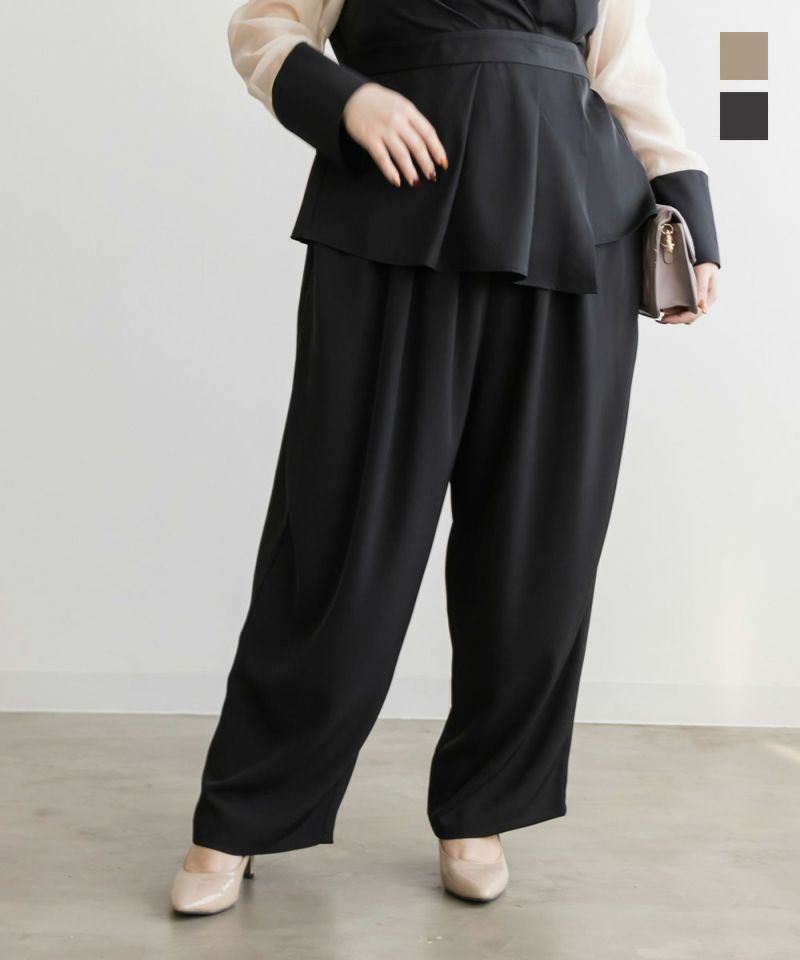 3Lサイズを着用してゆとりのあるサイズ感でした。いつもより大きめのサイズ感だったので、ウエストなどのサイズ確認をお勧めします!タックがたくさん入っているので、さらっとした生地感でもボディラインを拾いにくいデザインです◎カーブシルエットになっていてトレンド感もたっぷりです!セットで着用できるブラウスと合わせて、オケージョンシーンにもおすすめです♪