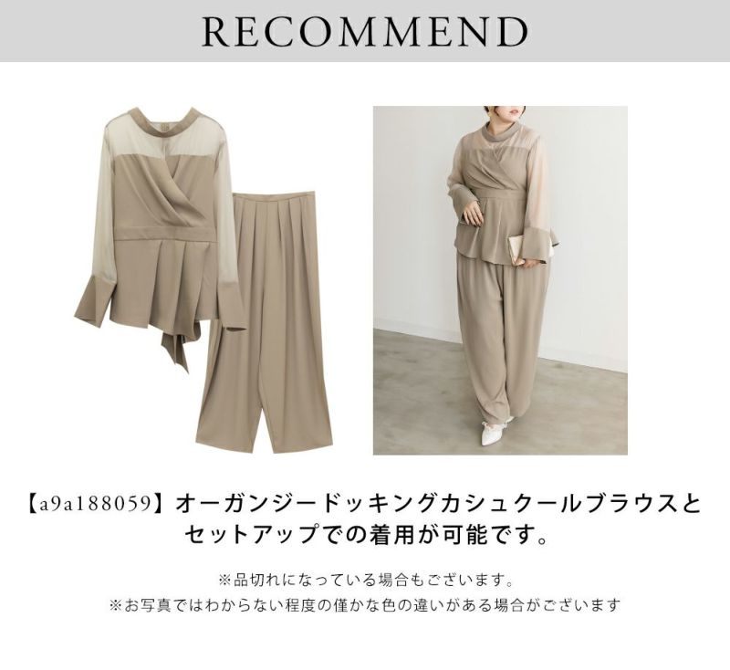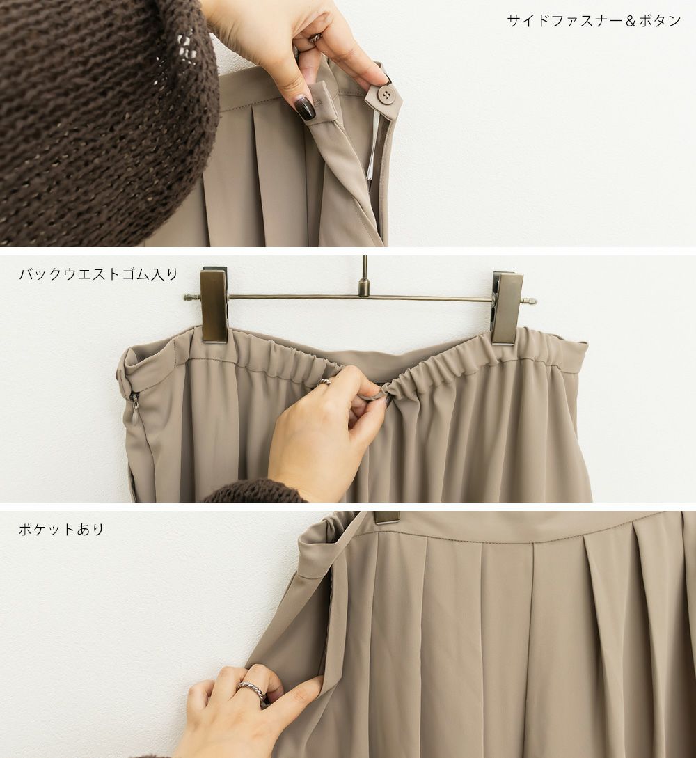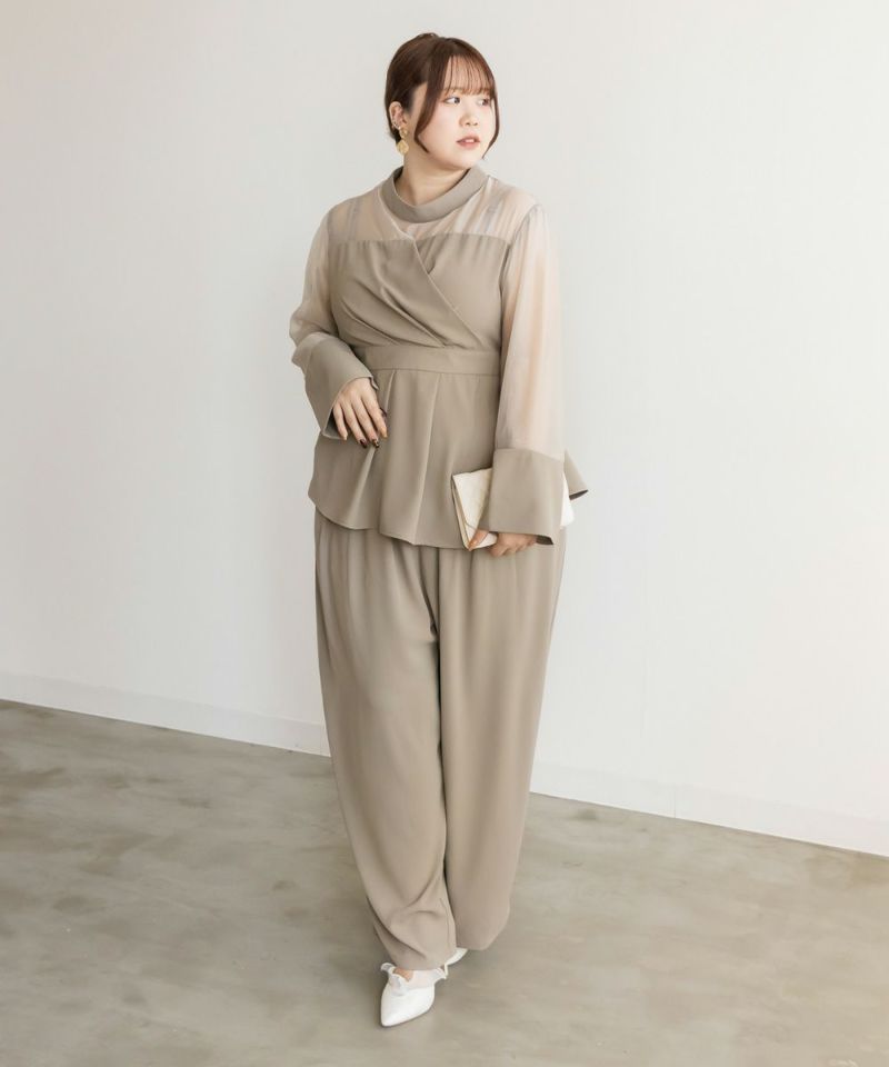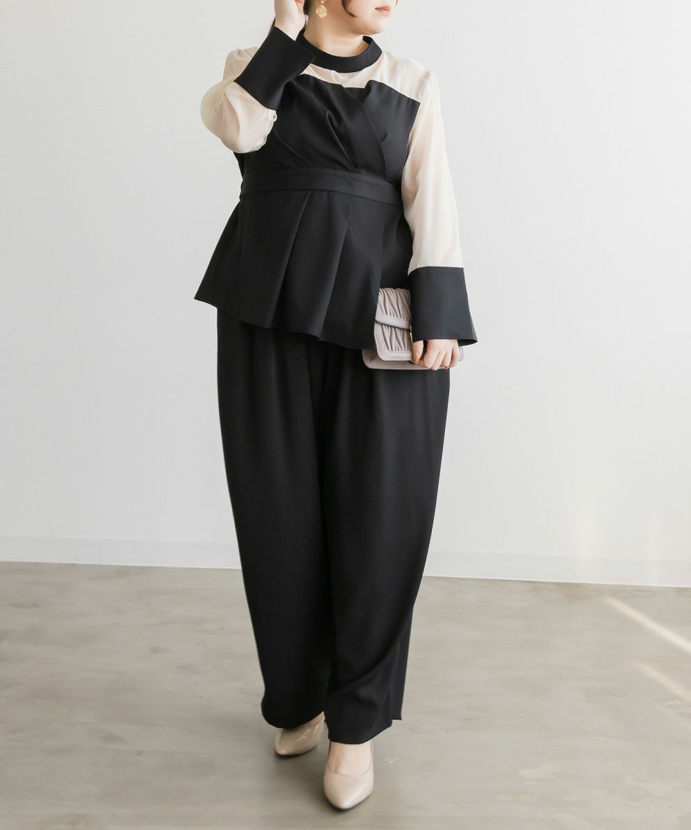 3Lサイズを着用してゆとりのあるサイズ感でした。いつもより大きめのサイズ感だったので、ウエストなどのサイズ確認をお勧めします!タックがたくさん入っているので、さらっとした生地感でもボディラインを拾いにくいデザインです◎カーブシルエットになっていてトレンド感もたっぷりです!セットで着用できるブラウスと合わせて、オケージョンシーンにもおすすめです♪