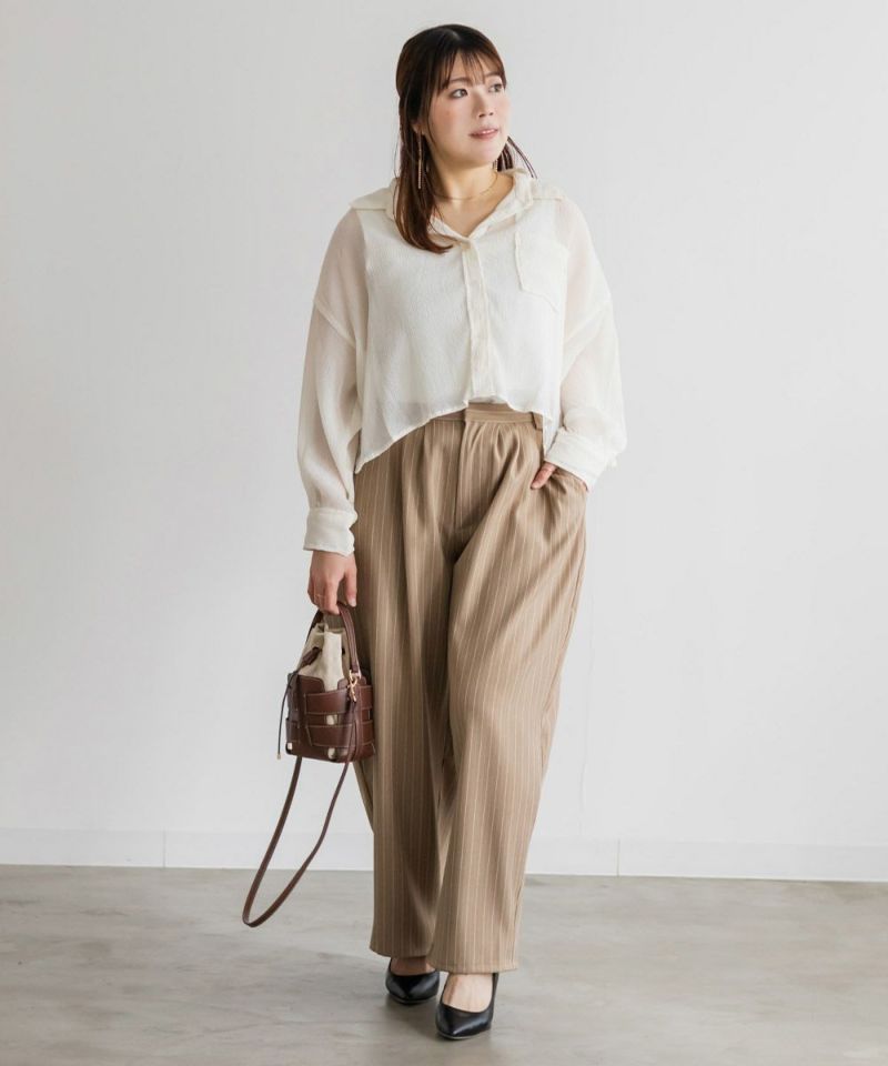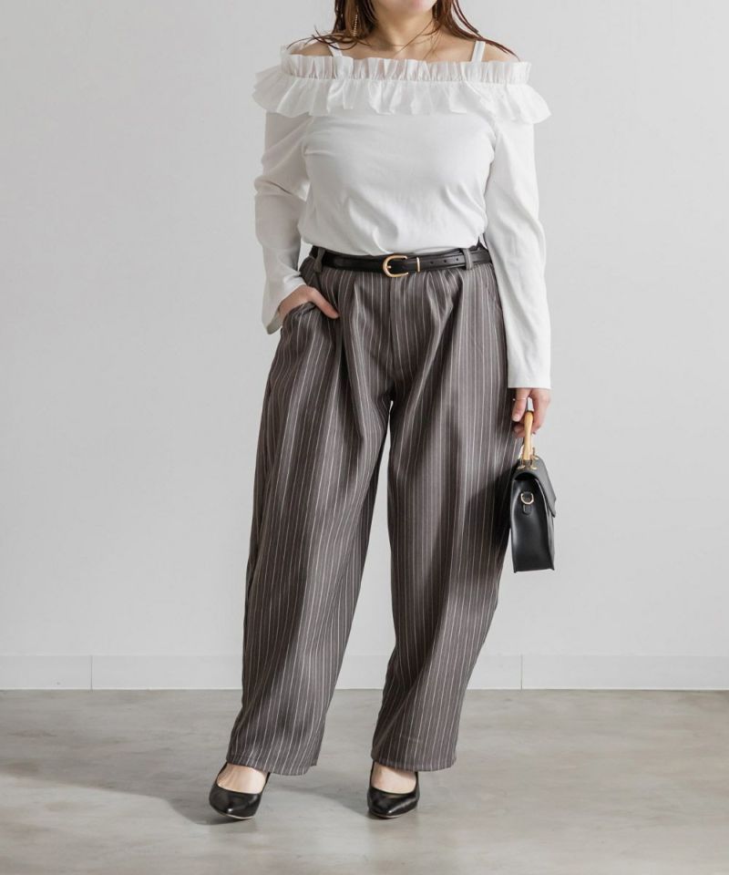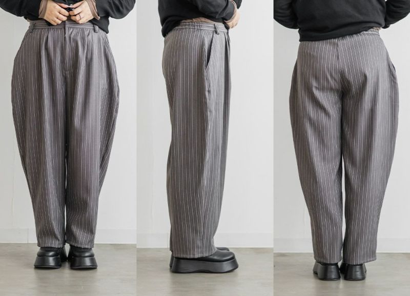 3Lサイズを着用しました。ウエストはちょうどいい着用感で、ツータック入りなのでお腹まわりに余裕があり、長時間穿いても楽でした。バレルシルエットが太ももからヒップラインを自然にカバーしてくれて、ストライプ柄の縦ライン効果ですっきり見えするのが嬉しいです。 ハリ感のある素材でラインを拾いにくく、きれいめにもカジュアルにも合わせやすい印象。シンプルなトップスと合わせるだけでコーデが決まるので、デイリー使いしやすいパンツだと思いました◎