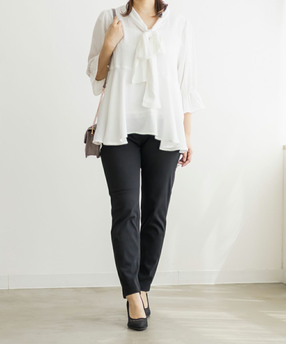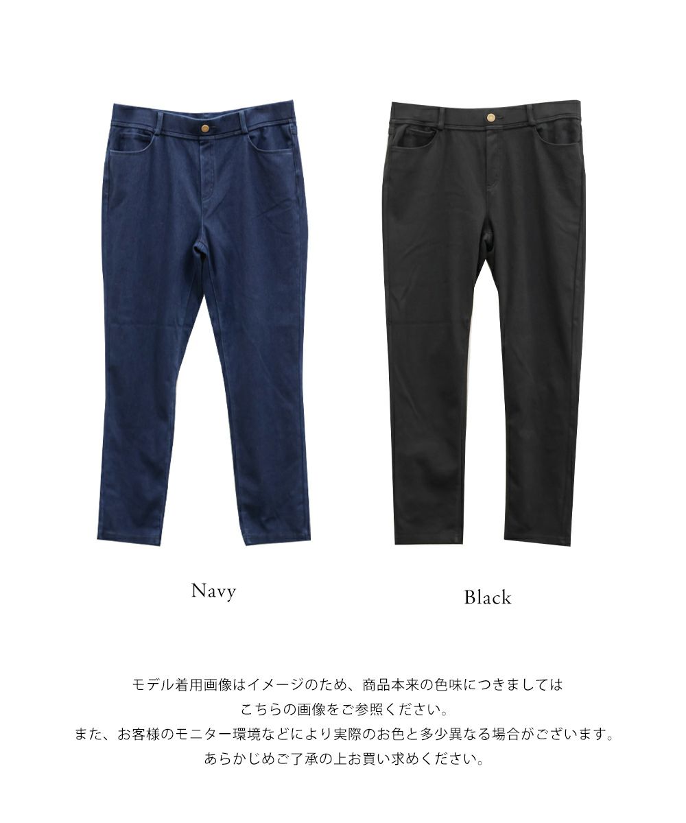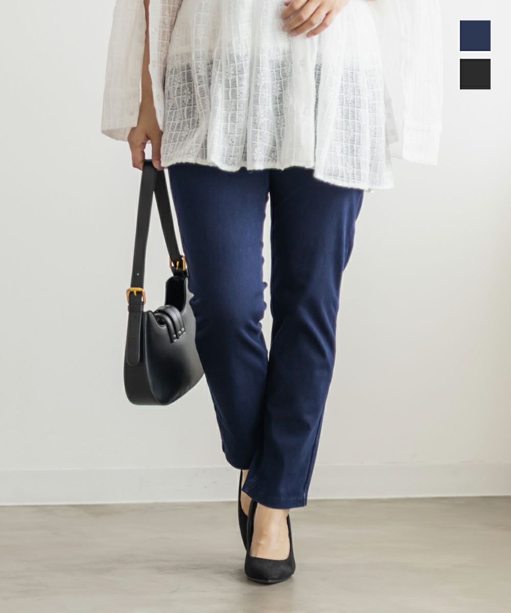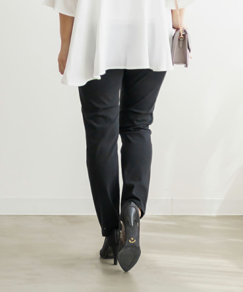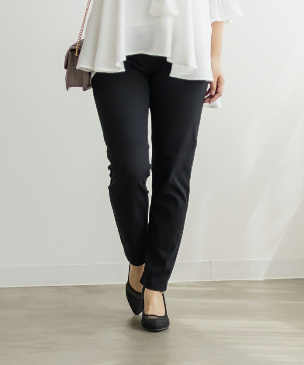 LLサイズを着用して丁度良いサイズ感でした。ウエストゴム仕様と伸びの良いストレッチ素材が動きやすく、ノンストレスな着心地でした!フィットしたシルエットのパンツはスタイルアップ効果があり、華奢見えします◎らくちんな生地感なのに、すっきりして見える美脚アイテムです!定番カラーで合わせやすく、オールシーズン着用できます。