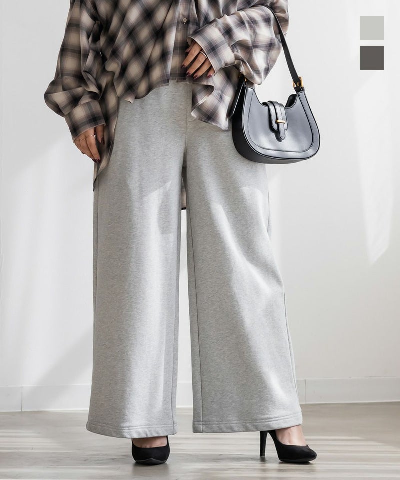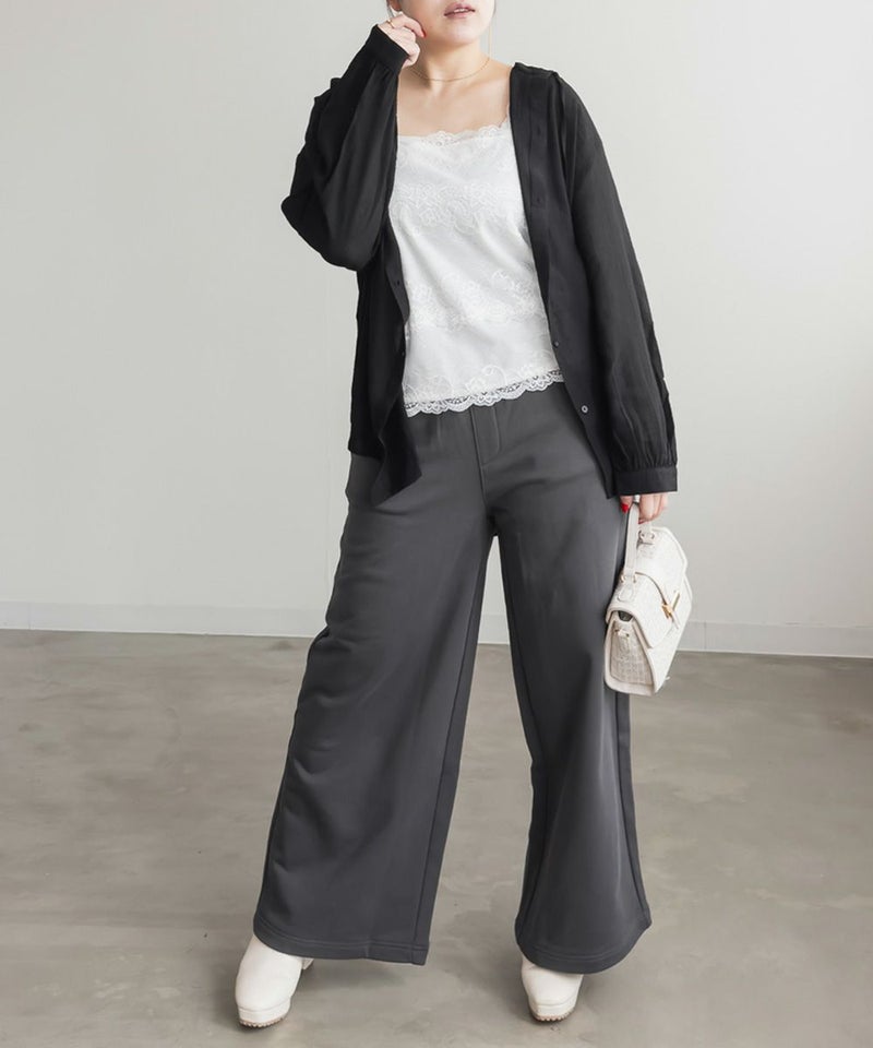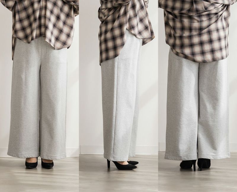 3Lサイズを着て、程よくゆとりを持って着られるシルエットでした!らくちんなスエット生地とワイドなシルエットでトレンド感と動きやすさを両立した1本です!ウエストは紐で調節できるのも嬉しいです。程よくルーズなフォルムで足のラインを拾いにくく、スタイルアップ効果も抜群です!オールシーズン着回しできる裏毛素材なので、着回しがたくさんできそう◎今年らしくシャツ・カーディガンと合わせたり、短丈のトップスとも相性良く着ていただけます♪