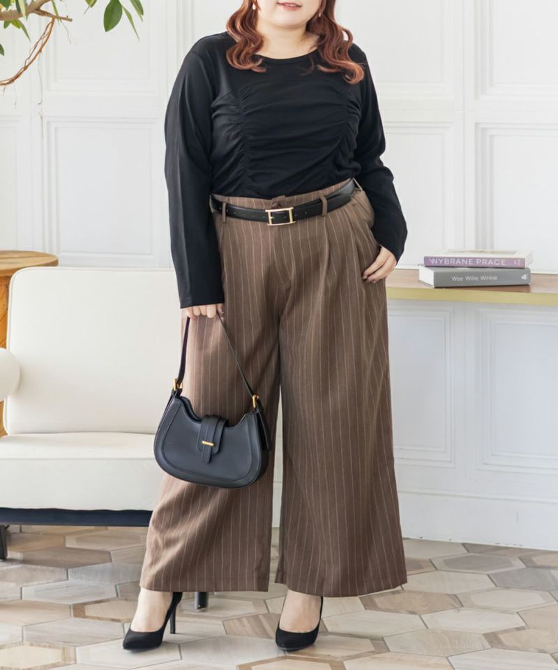 3Lを着用してちょうどいいサイズでした。程よくゆとりがありつつすっきり見えるシルエットで、楽ちんな着心地です!今っぽいストライプ柄がポイントで、トレンドっぽい可愛い系のトップスとも、シンプルなトップスとも相性がいいのでおすすめです。オールシーズン使える便利なワイドパンツです!さらっとした落ち感素材にストライプ柄をのせたワイドパンツは、脚のラインを拾わずリラックスして着られるのに、きちんと見えするのも嬉しい!後ろウエストゴムでストレスフリーに穿けて、長時間のお出かけにも快適です◎