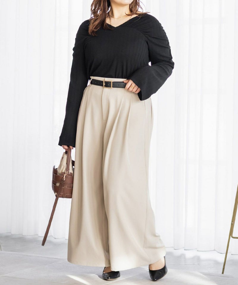 3Lを着用してちょうどいいサイズでした。しっかりゆとりがありつつすっきり見えるシルエットで、楽ちんな着心地です◎ワイドパンツだけどフェミニンなスタイルになれるアイテムで、可愛い系のトップスとも、シンプルなトップスとも相性がいいのでおすすめです。オールシーズン使える便利なワイドパンツです!