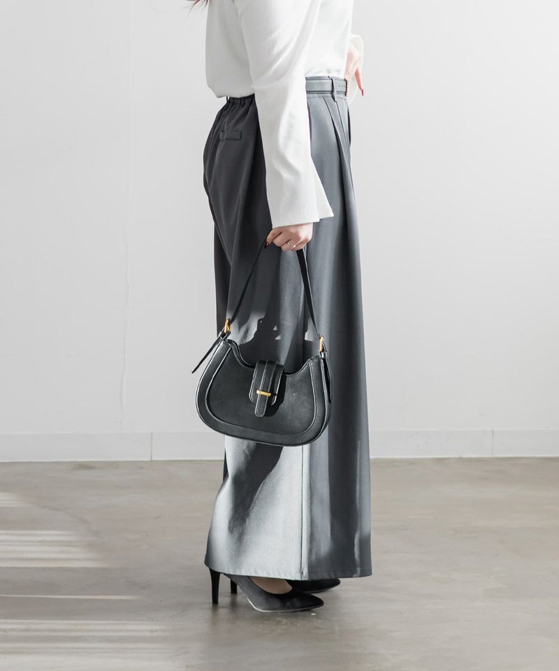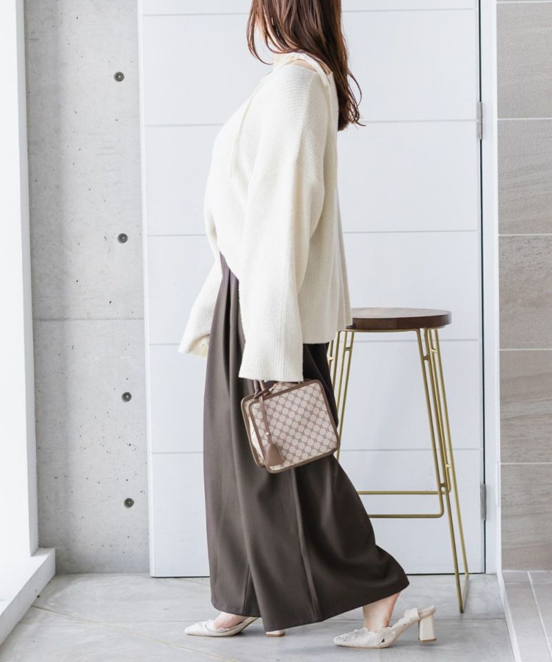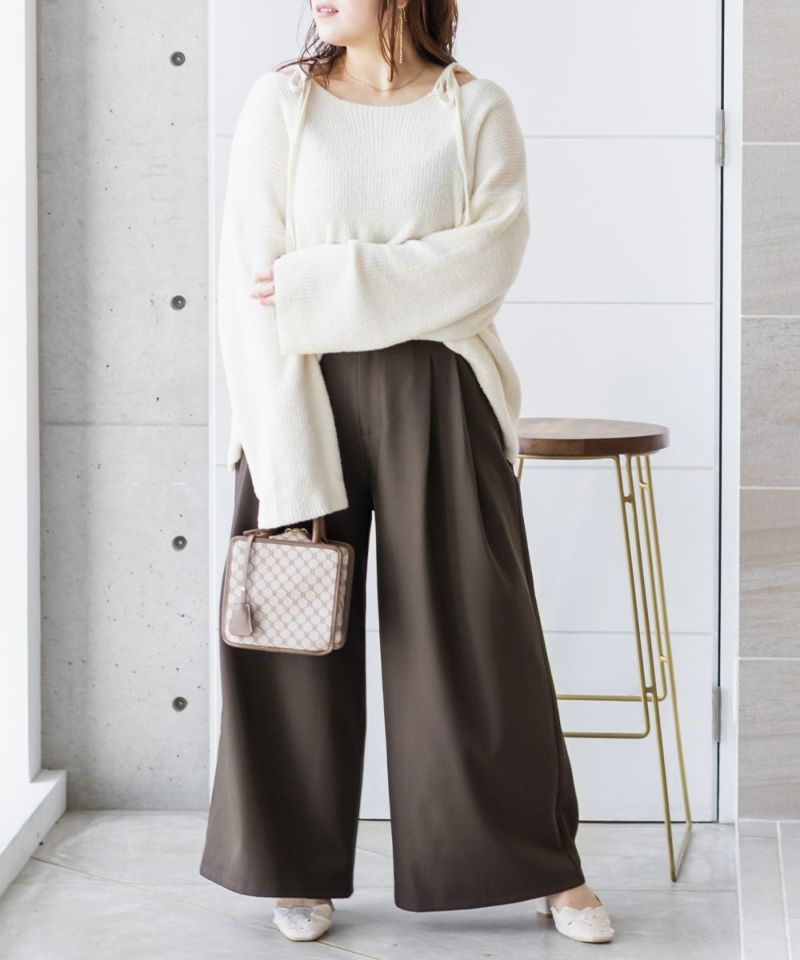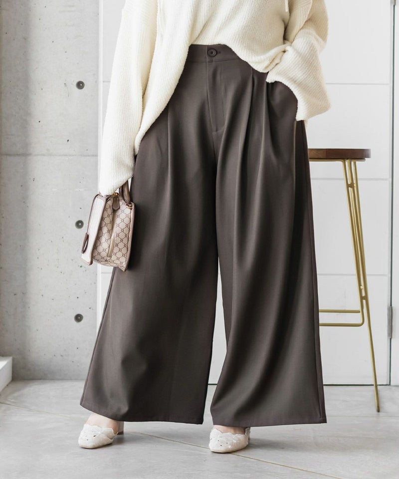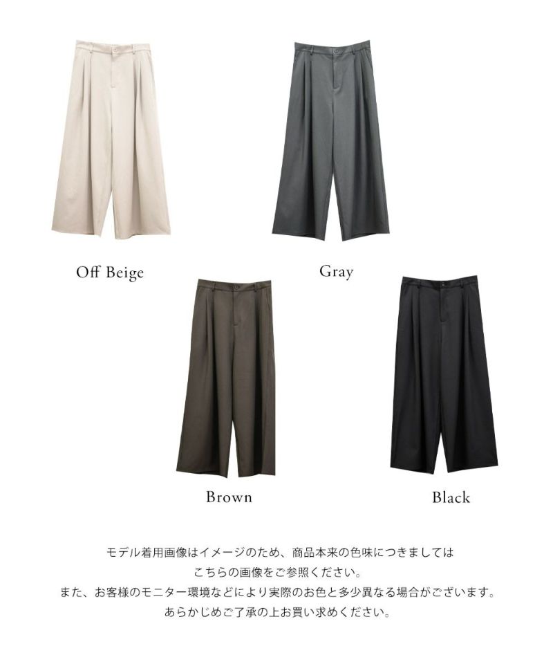 【design】お腹や腰回りをすっきりとさせて、足を長く見せるタックデザインがポイントのワイドパンツ。前にも後にもタックを入れる事で、気になる部分をカバーしつつ縦長効果をプラスしてスタイルアップできるデザイン。【material】シワになりづらい特性の布帛素材。ケアしやすくてオールシーズン使える素材感。程よくしっかりとした生地感だからボディラインも拾いづらい。【styling】普段使いはもちろん、お仕事やちょっとしたフォーマルシーンにも使えます。パンプスともスニーカーとも相性のいい、1枚あればコーディネートの幅が広がるアイテムです。