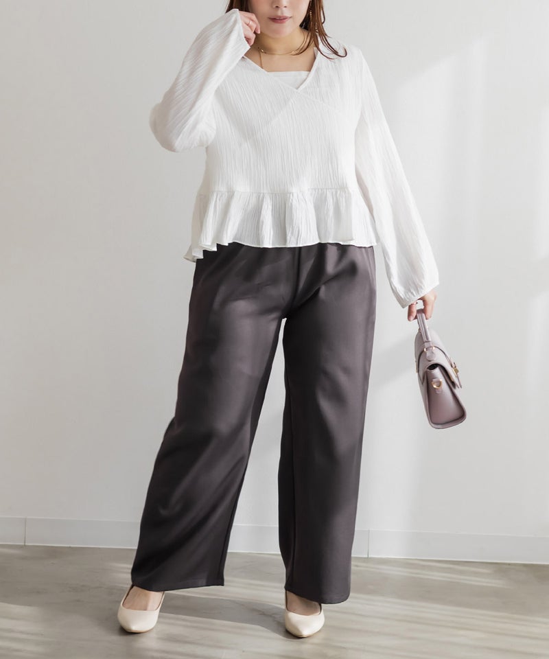 3Lサイズを着て、程よくゆとりを持って着られるシルエットでした!程よくルーズなフォルムで足のラインを拾いにくく、スタイルアップ効果も抜群です!シャツ・カーディガンと合わせたり、短丈のトップスとも相性良く着ていただけます♪