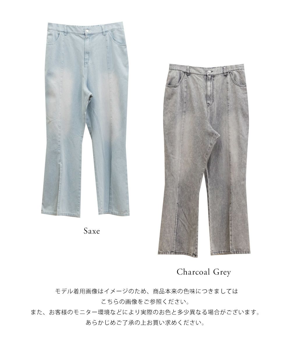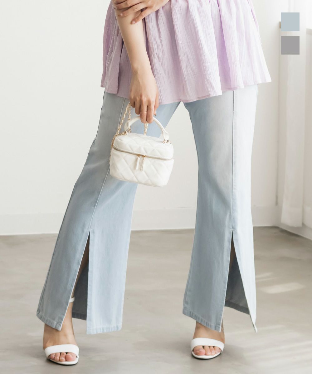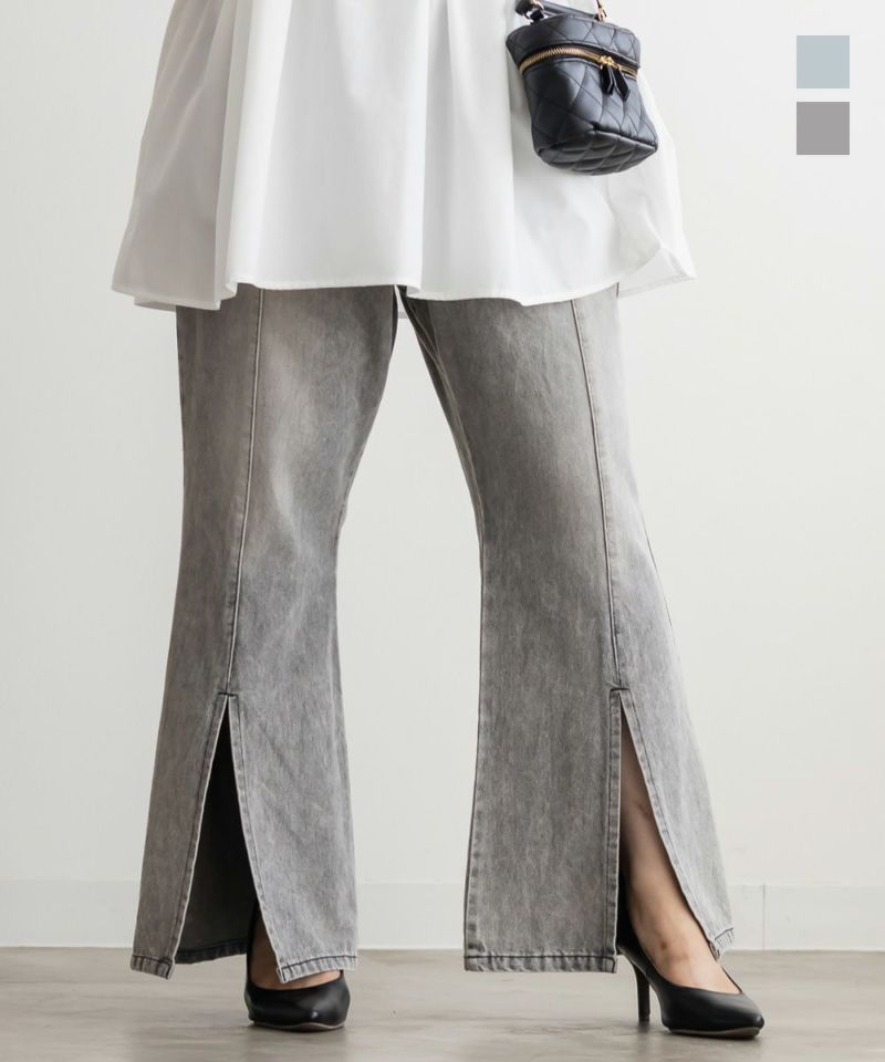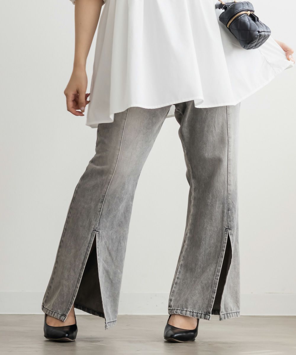 3Lサイズでジャストな着心地で、後ろゴムもありラクに過ごせました◎安定感もあり、トップスインもしやすいデザインです。フレアシルエットとフロントスリットの効果で、脚がすっきり見えてスタイルアップして見えました!少し薄手のデニム素材で、フィット感がありながらも窮屈さはなく、快適な穿き心地です。シンプルながらトレンド感のある1本で、カジュアルコーデにも大人きれいめコーデにも合わせやすい万能パンツです♪