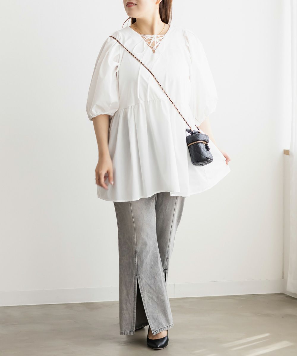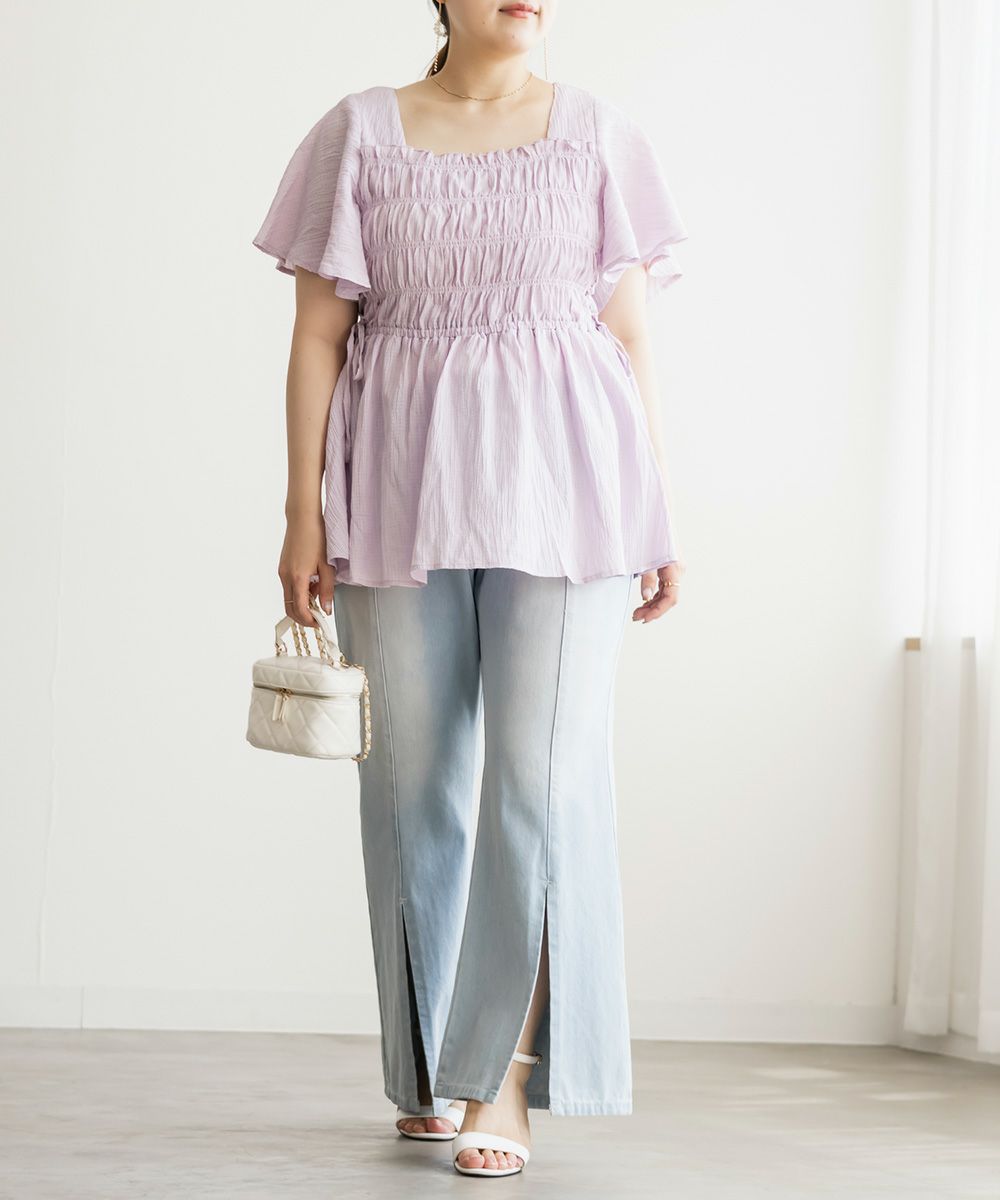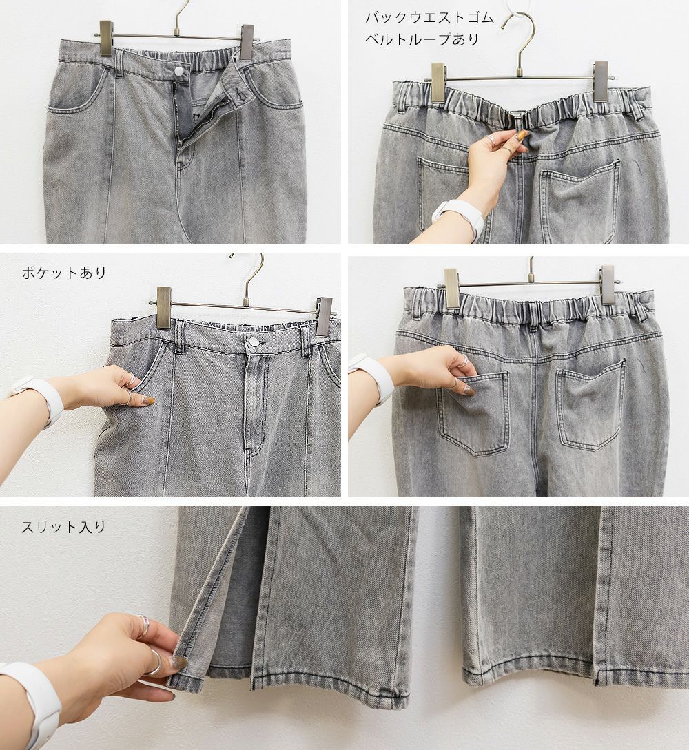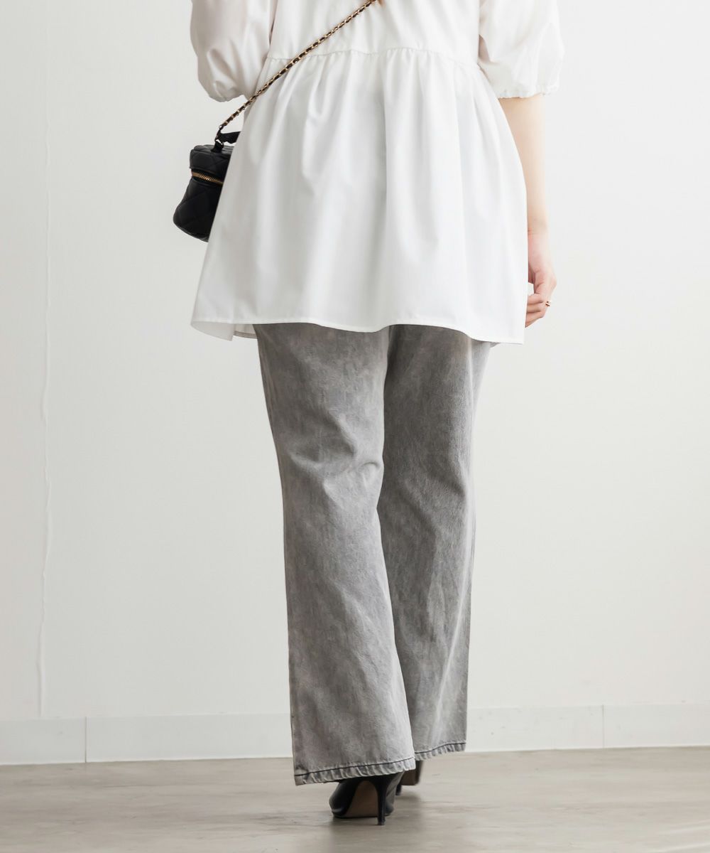 3Lサイズでジャストな着心地で、後ろゴムもありラクに過ごせました◎安定感もあり、トップスインもしやすいデザインです。フレアシルエットとフロントスリットの効果で、脚がすっきり見えてスタイルアップして見えました!少し薄手のデニム素材で、フィット感がありながらも窮屈さはなく、快適な穿き心地です。シンプルながらトレンド感のある1本で、カジュアルコーデにも大人きれいめコーデにも合わせやすい万能パンツです♪