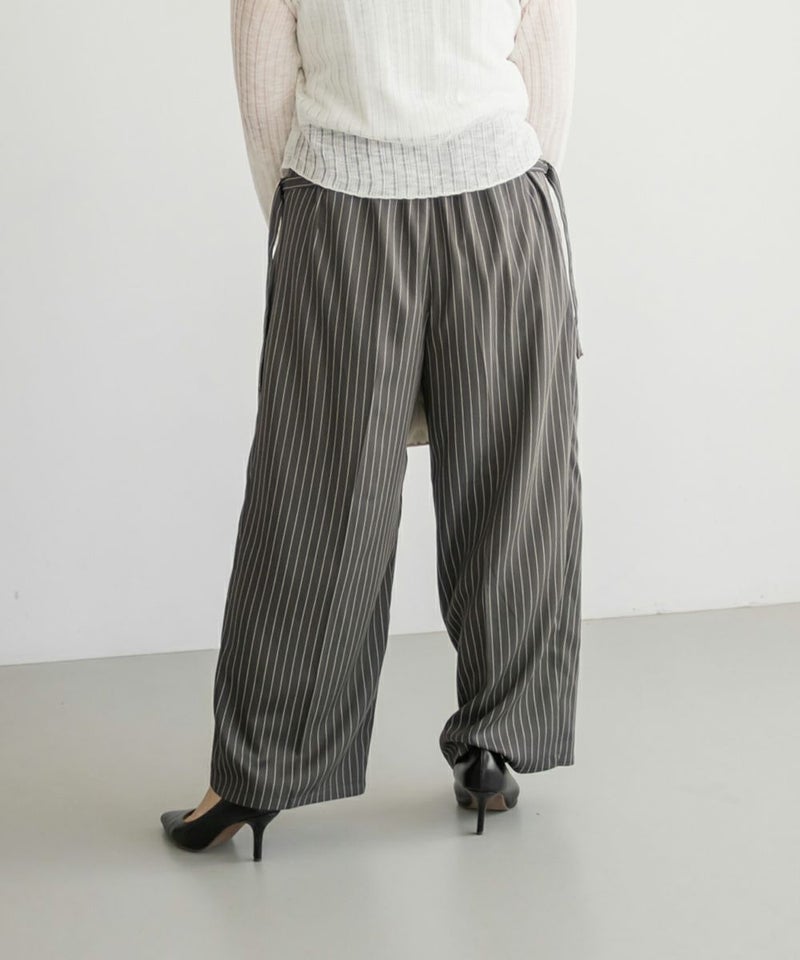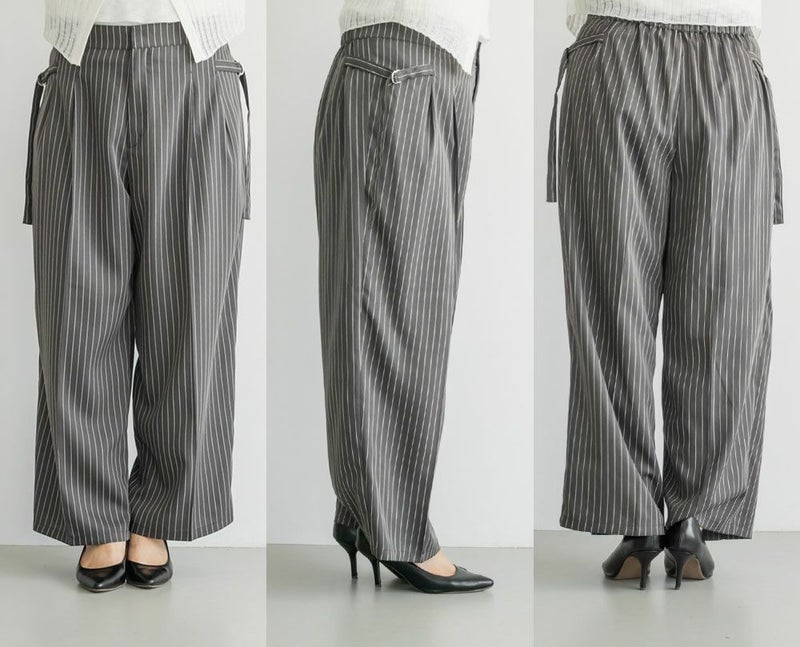 3Lを着用してちょうどいいサイズでした。程よくゆとりがありつつすっきり見えるシルエットで、楽ちんな着心地です!今っぽいストライプ柄がポイントで、シンプルなトップスとも相性がいいのでおすすめです。さらっとした落ち感素材で、程よくワイドなので脚のラインを拾わずリラックスして着られます!きちんと見えするのも嬉しい!後ろウエストゴムでストレスフリーに穿けて、長時間のお出かけにも快適です◎サイドにタブデザインがあって紐の垂れた感じもかわいい!オールシーズン着られて着回しも抜群です!