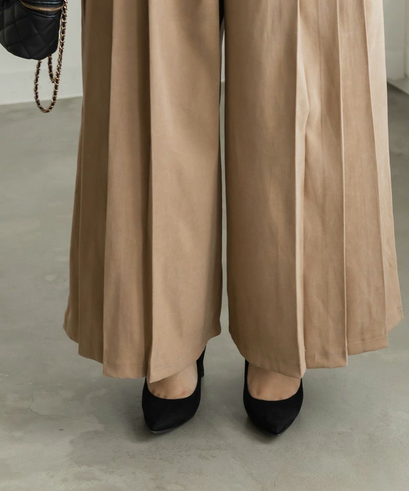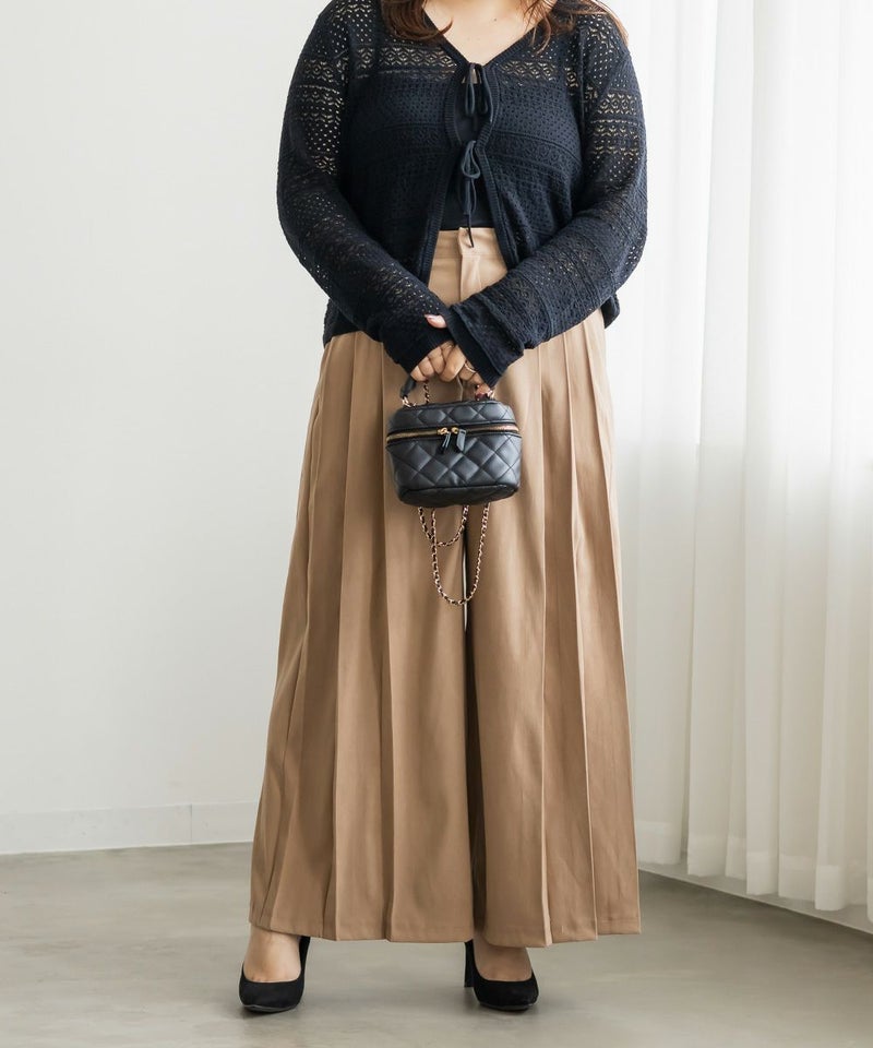3Lを着用してちょうどいいサイズでした。程よくゆとりがありつつすっきり見えるシルエットで、楽ちんな着心地です!後ろウエストゴムでストレスフリーに穿けて、長時間のお出かけにも快適です◎季節感のあるスエードっぽい生地ですが、薄手で軽いので、動きやすさもありました。プリーツデザインがお洒落でシンプルなトップスとも相性がいいのでスタイリングに悩まず着回しが出来ます。オールシーズン使える便利なワイドパンツは脚のラインを拾いずらくリラックスして着られるのに、きちんと見えするのも嬉しいです。デイリーからお仕事までつかえる万能な1本です。