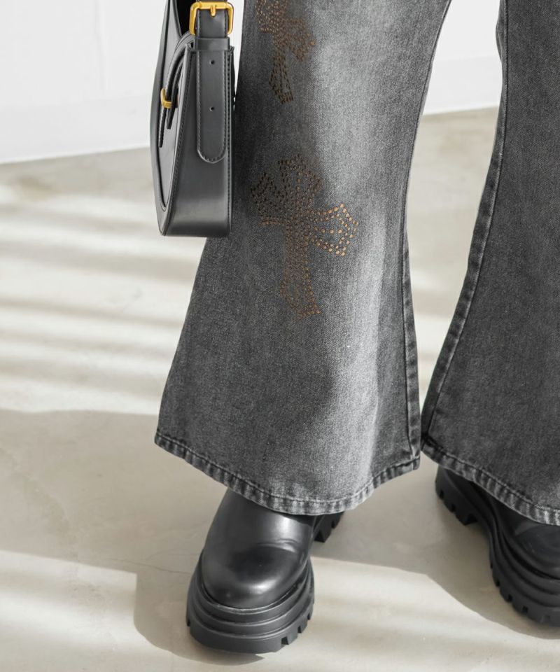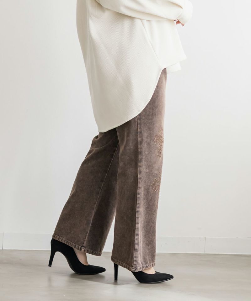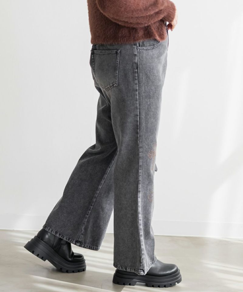 3Lサイズを着用して、ちょうどいいサイズ感でした! フレアシルエットが脚のラインをきれいに見せてくれて、スタイルアップ効果も抜群です!今っぽいスタッズのデザインがアクセントになっていて、シンプルトップス合わせでもおしゃれ見えが叶います◎ 生地は軽めのデニムで、動きやすさもあります。デニムの色味・加工感が可愛くて、スタイリングを格上げしてくれる1本です!