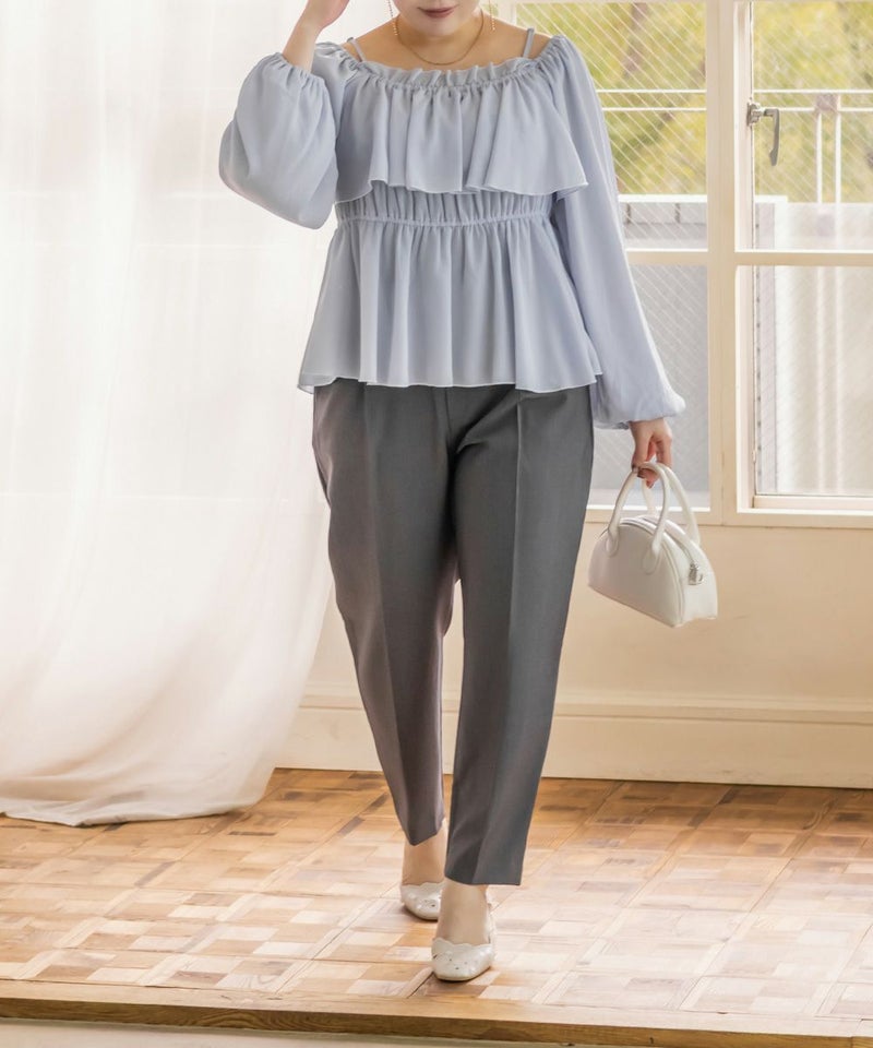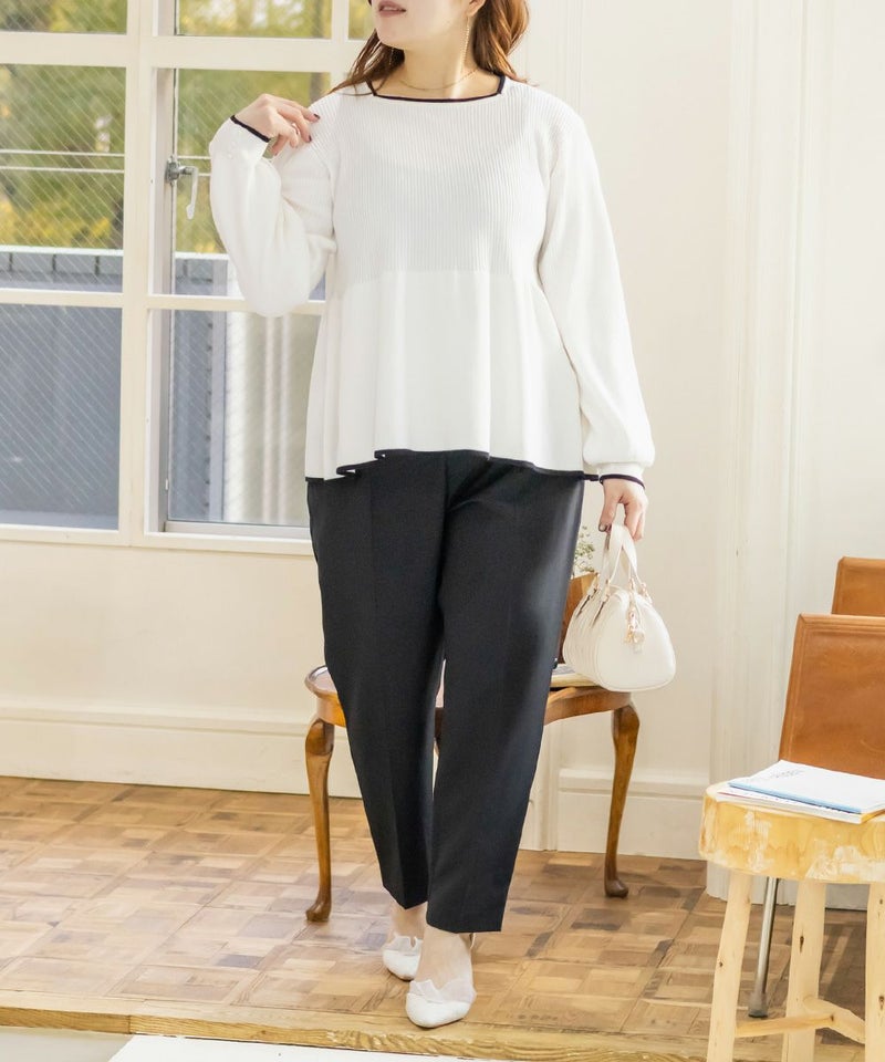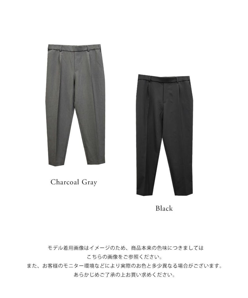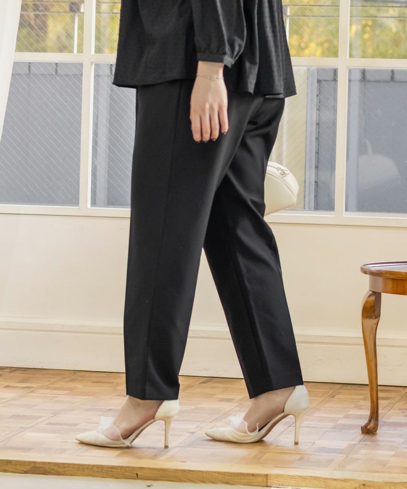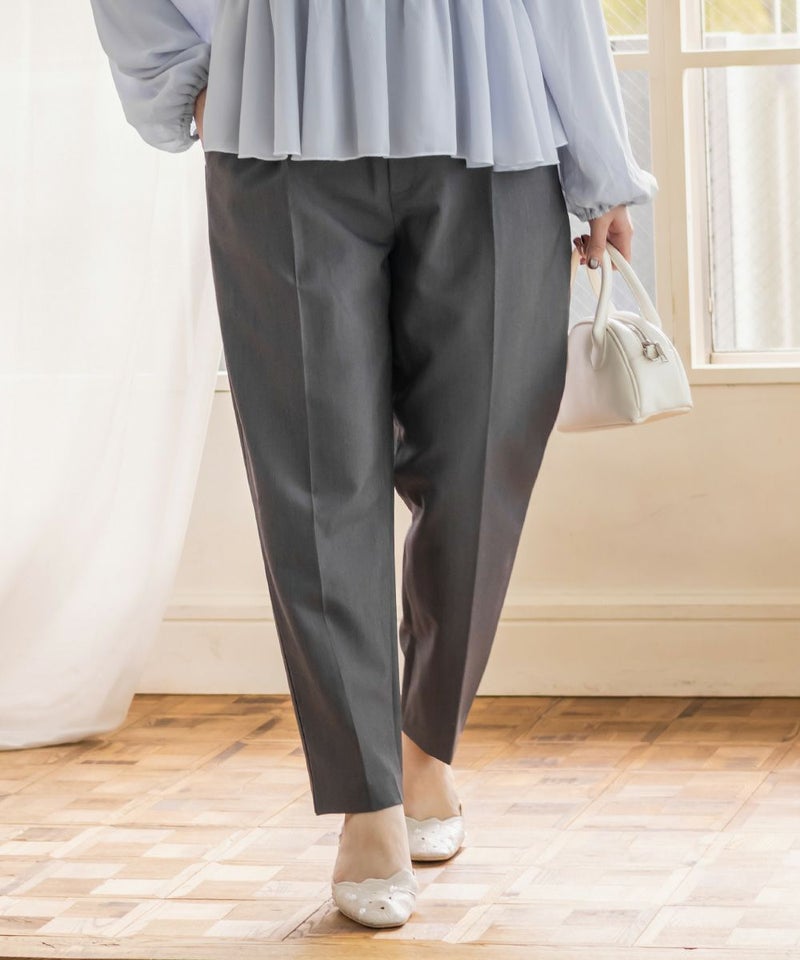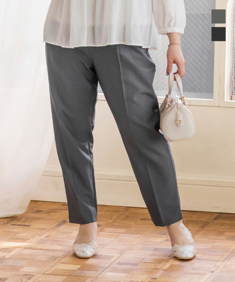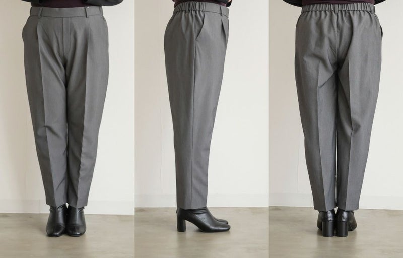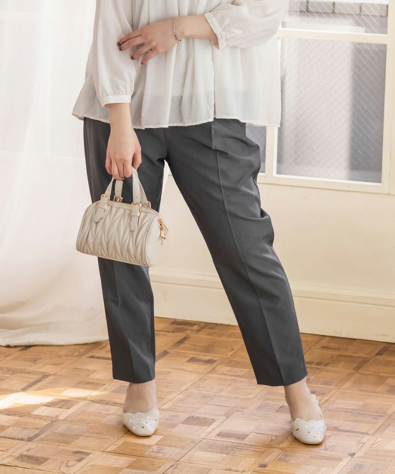 3Lサイズを着用してぴったりのサイズ感でした。足元に向かってすっきり細くなるシルエットで美脚効果のある1本です。後ろウエストゴム仕様で窮屈感のない着心地で、さらりとした程よくしっかりとした生地なのでオールシーズン着まわせます◎普段使いはもちろん、お仕事や綺麗目な服装が必要なシーンでも活躍しそうです!
