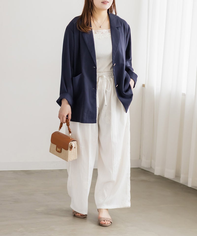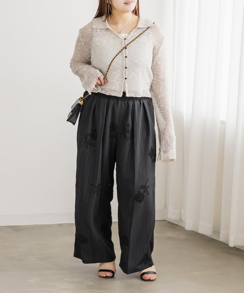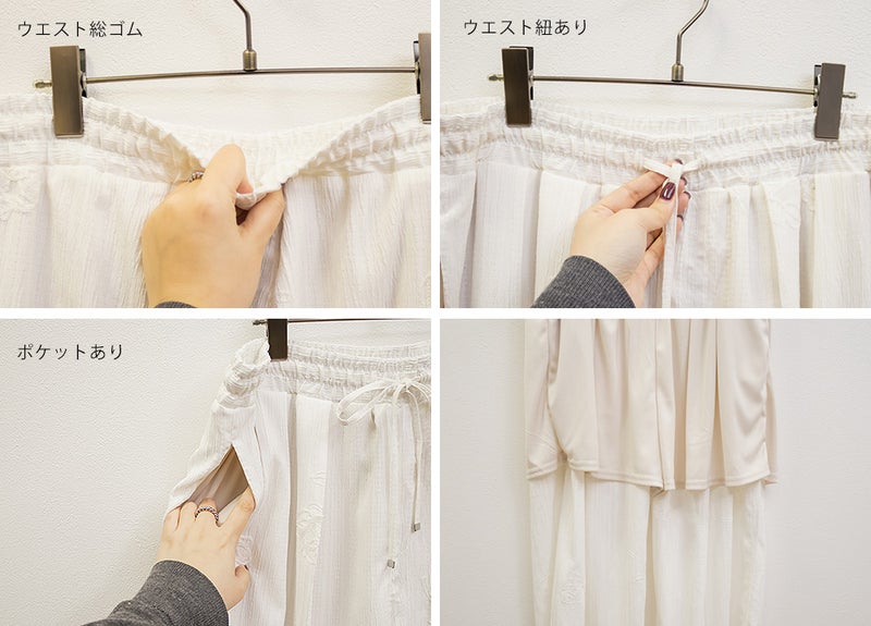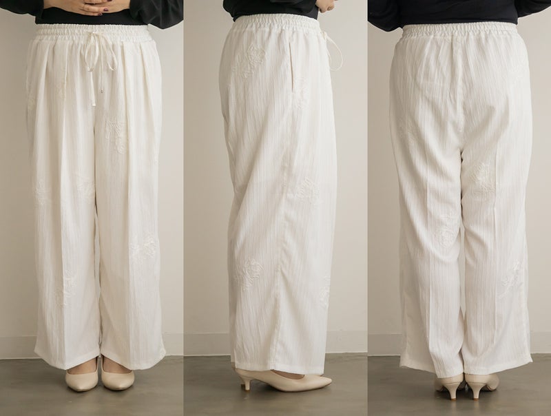 3Lサイズを着用しました。ウエスト総ゴムなのと紐で調節可能なので、全体的にちょうどいい着心地でした。立体感のあるモチーフコード刺繍が華やかで、シンプルなトップスと合わせるだけでもしっかり着映えしてくれるのが嬉しいポイント♪ シルエットはすとんと落ちるラインで、脚のラインを拾いにくく安心感があります。楊柳っぽい凹凸がある生地が縦の流れを作ってくれるので、さりげなくすっきり見えする印象でした◎ ブラウス合わせできれいめに、カットソー合わせで抜け感のあるスタイルにもおすすめです。コーデの主役になる一本だと思いました。