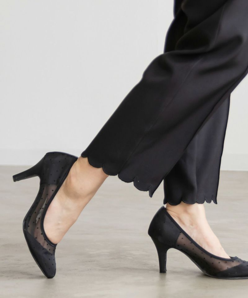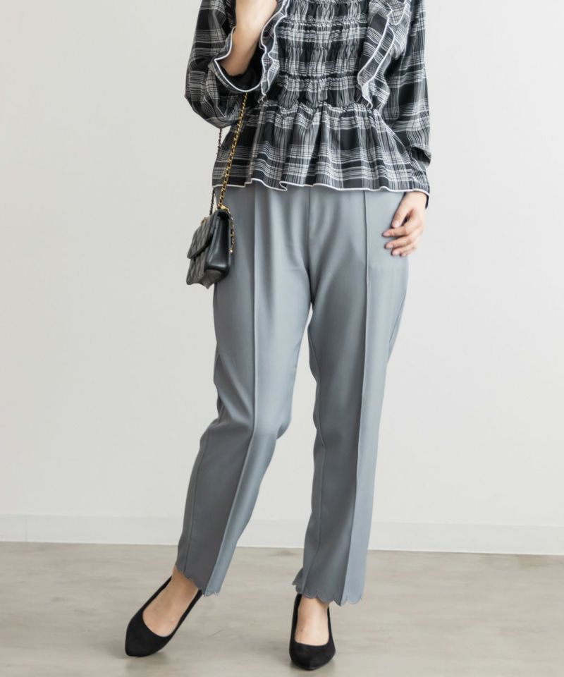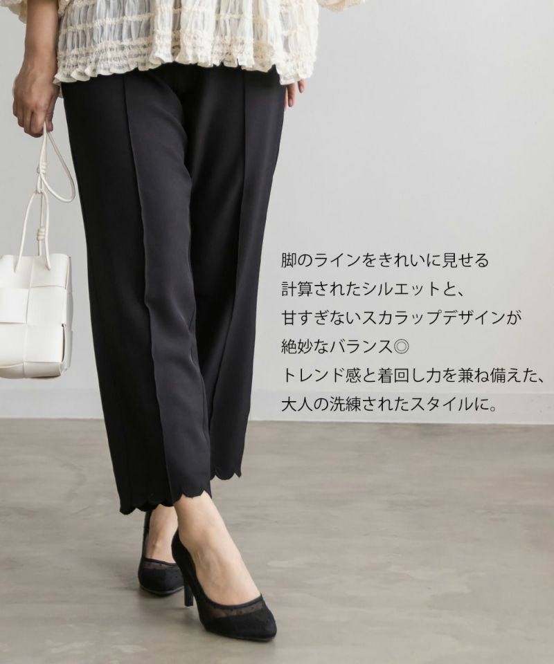 LLサイズを着用して、ちょうどいい着心地でした。すっきりとしたシルエットが美脚効果抜群です◎裾のスカラップデザインが女性らしいアクセントになっていて、シンプルながらも華やかさをプラスしてくれます! ウエストは後ろゴム仕様で、リラクシーな履き心地も魅力♪ きれいめにもカジュアルにも着回しやすく、オンオフ問わず活躍する万能パンツです◎