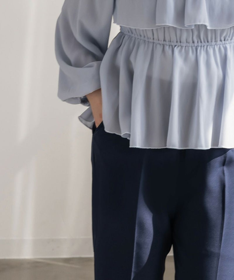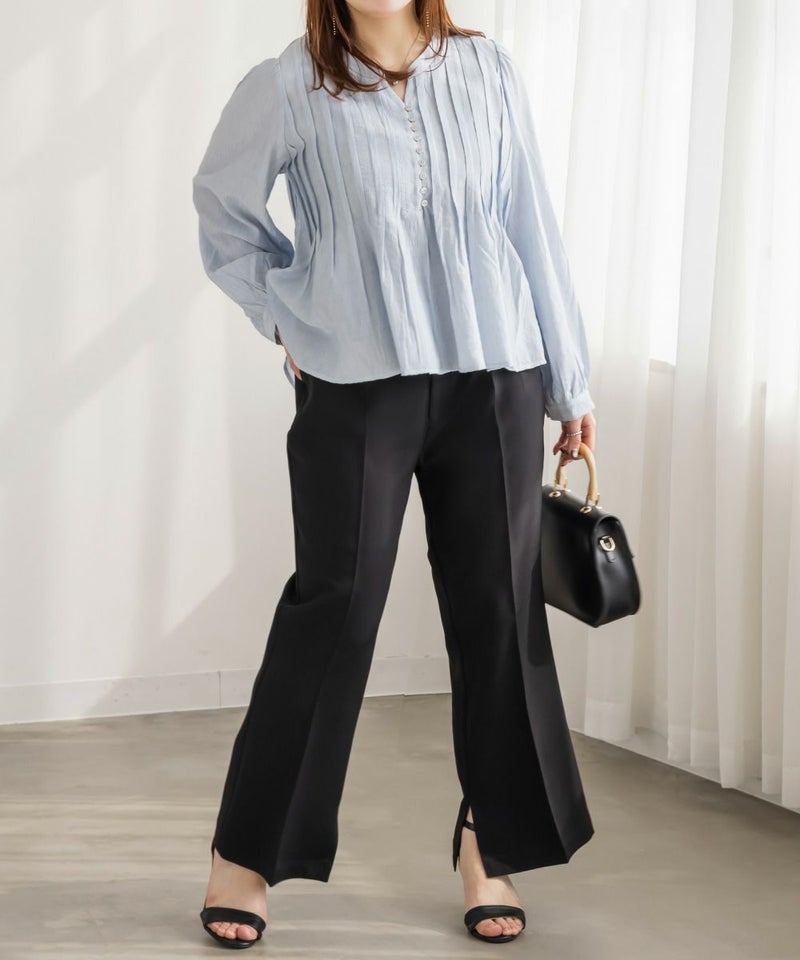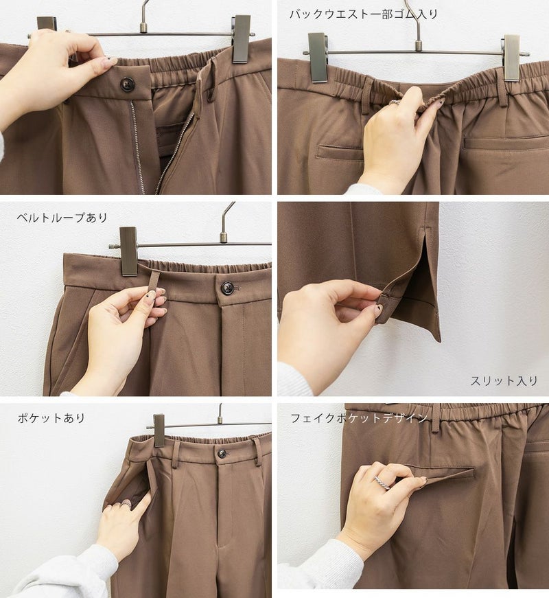 【design】センタープレスラインにフレアシルエットが美脚効果を発揮。裾スリットが程よい抜け感を出し、きれいに魅せるのに履きやすい前開きデザインと、後ろウエストがゴム仕様でラクチン。着回し万能なベーシックカラー。【material】程よい厚みできれいめな布帛素材。オールシーズン着用可能。【styling】トップスをインしてもアウトしてもバランスよく着こなせます。カジュアルにもきれいめにも対応でき、幅広いシーンで活躍するアイテムです。ヒールやボリューム感のある靴と合わせることでさらに美脚効果アップ。