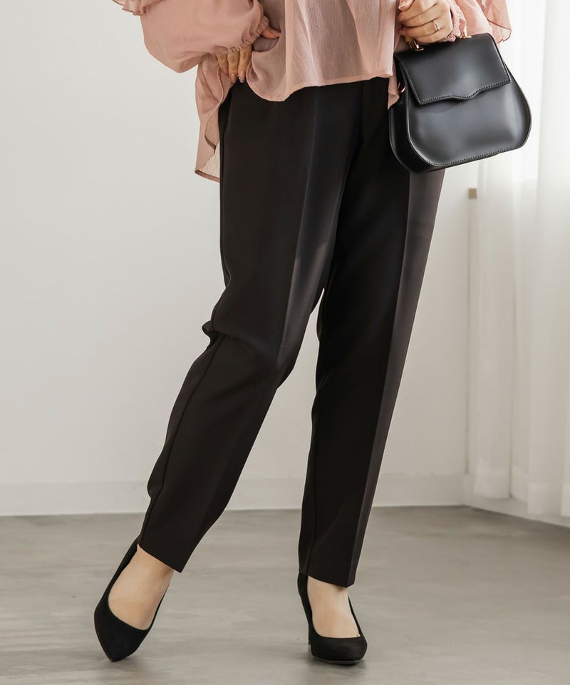 LLサイズを着用してジャストな着心地でした。後ろゴムで窮屈感無くちょうどよく着られました。綺麗なテーパードシルエットのパンツで、普段使いからお仕事・簡単なセレモニーシーンなどいろいろな着回しが可能な1枚です。足首が綺麗に見える丈感で、長めのブラウスやジャケットと合わせてもバランスよく見えます♪