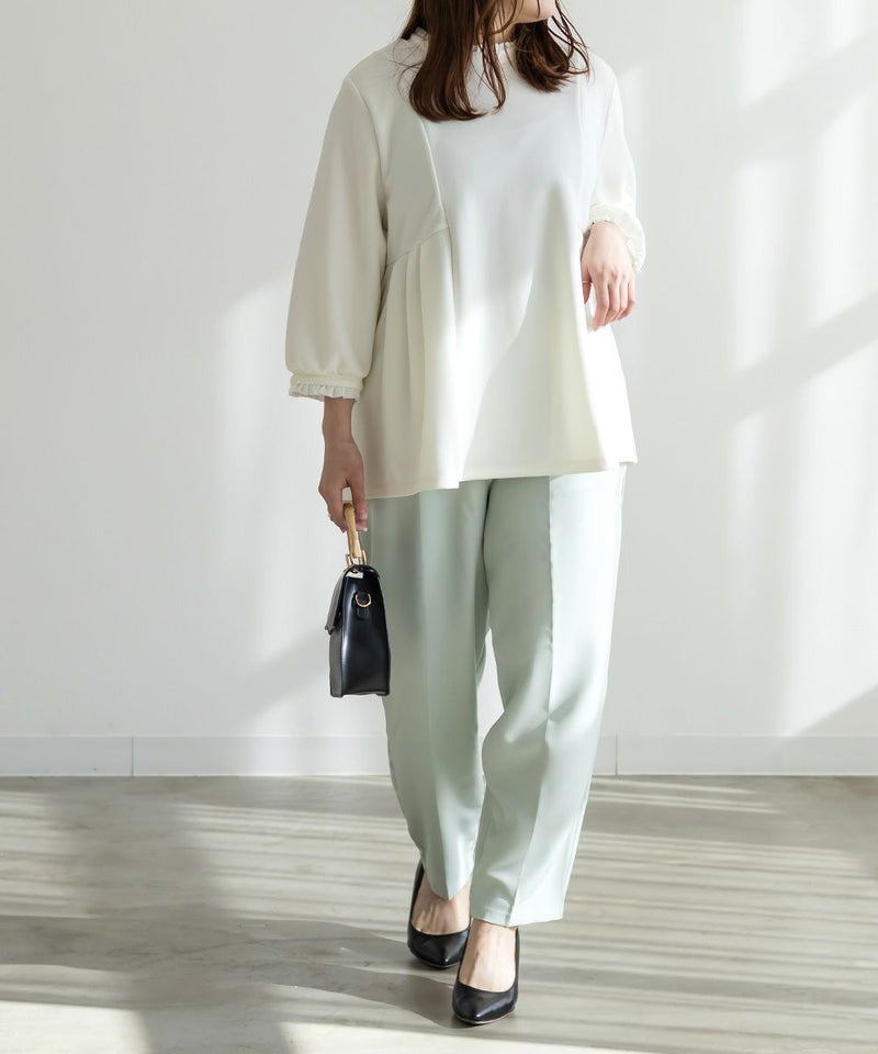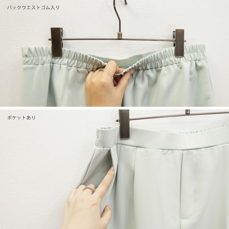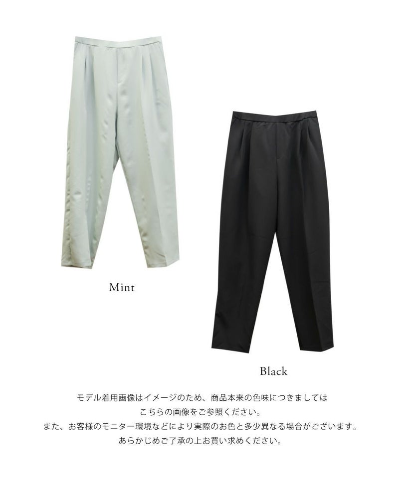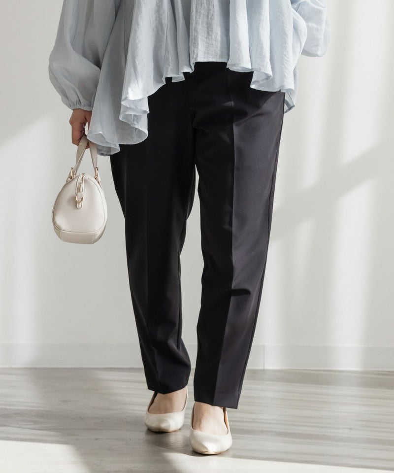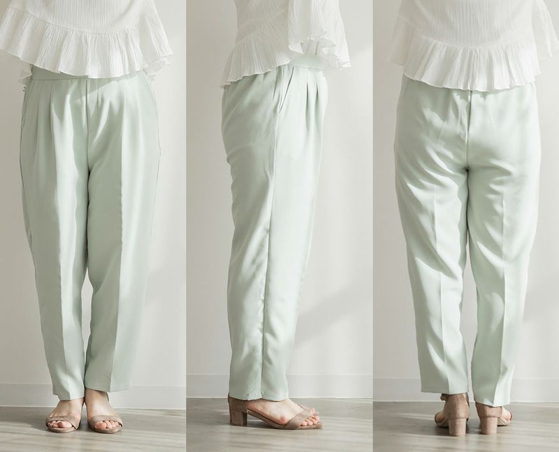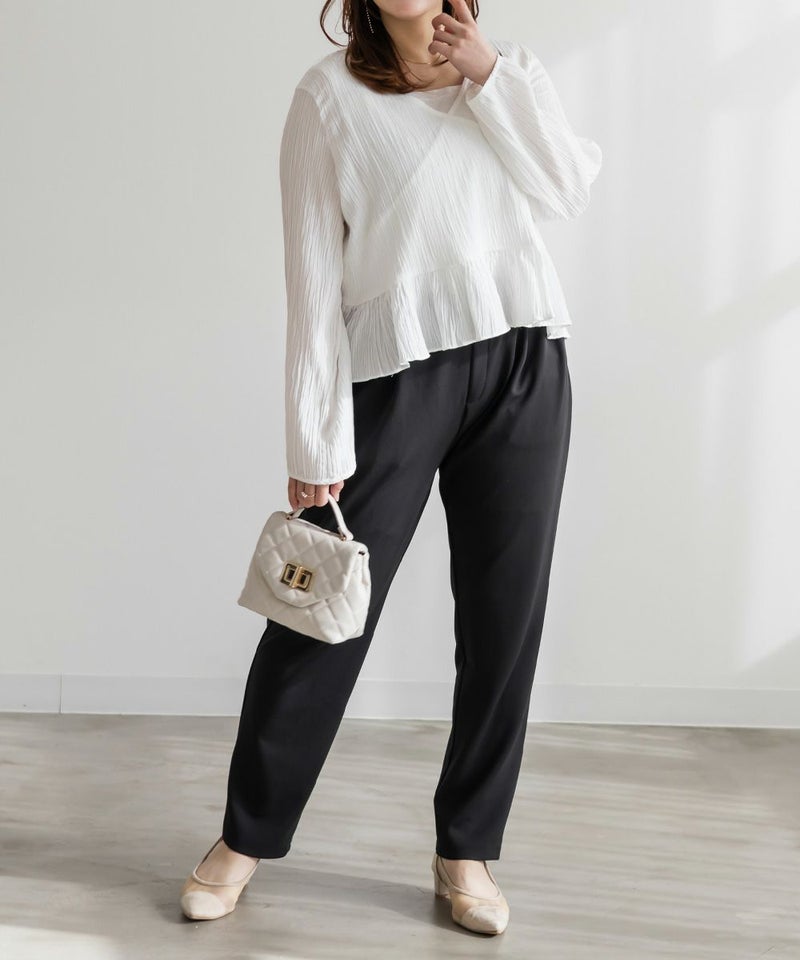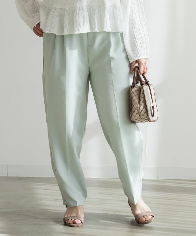 3Lサイズを着用してちょうどいい着心地でした!足元に向かってすっきり細くなるテーパードシルエットで美脚効果のある1枚です◎後ろウエストゴム仕様で窮屈感のない着心地で、さらりとした程よくしっかりとした生地なのでオールシーズン着まわせます!普段使いはもちろん、お仕事や綺麗目な服装が必要なシーンでも活躍しそうです♪