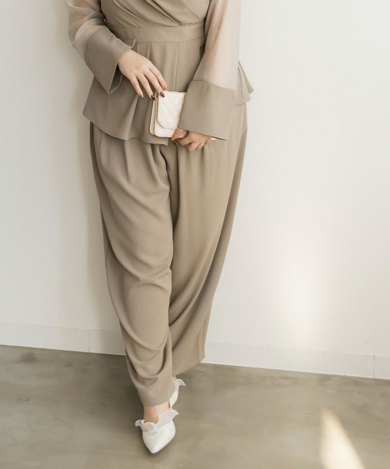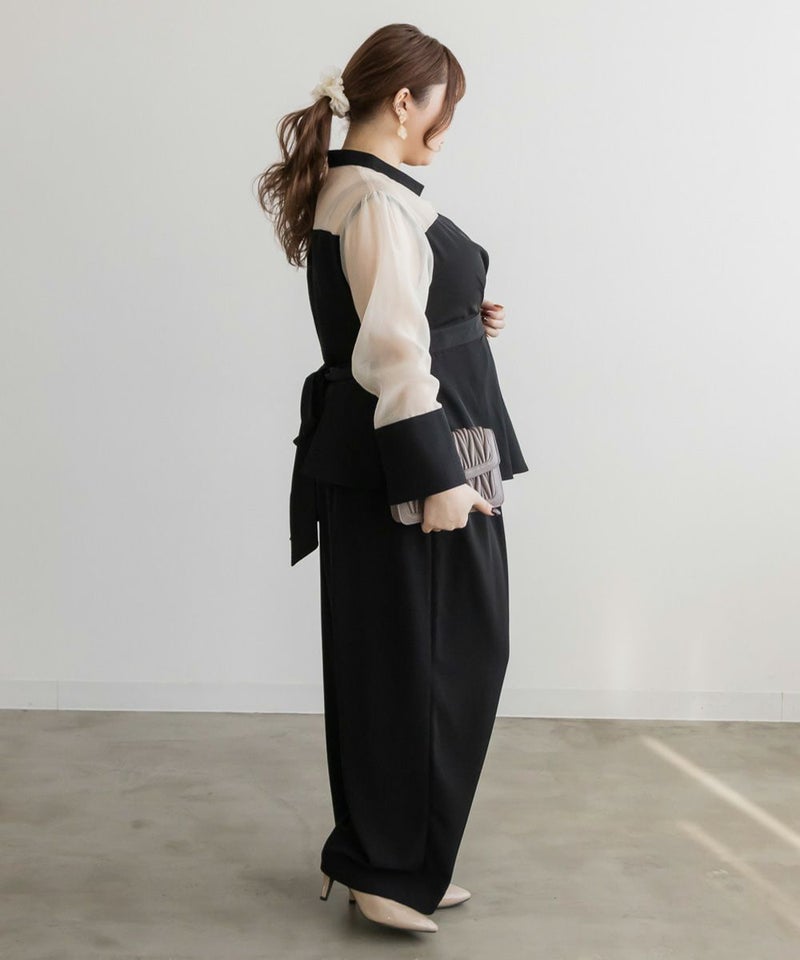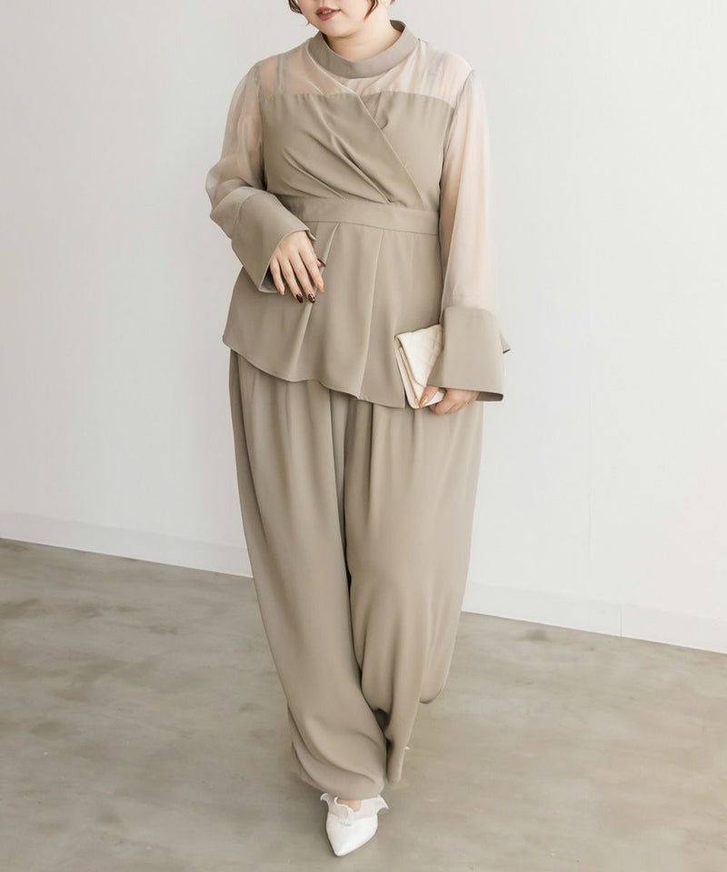 3Lサイズを着用してゆとりのあるサイズ感でした。いつもより大きめのサイズ感だったので、ウエストなどのサイズ確認をお勧めします!タックがたくさん入っているので、さらっとした生地感でもボディラインを拾いにくいデザインです◎カーブシルエットになっていてトレンド感もたっぷりです!セットで着用できるブラウスと合わせて、オケージョンシーンにもおすすめです♪