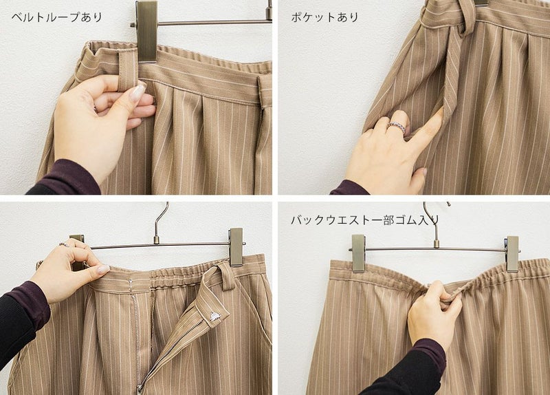 3Lサイズを着用しました。ウエストはちょうどいい着用感で、ツータック入りなのでお腹まわりに余裕があり、長時間穿いても楽でした。バレルシルエットが太ももからヒップラインを自然にカバーしてくれて、ストライプ柄の縦ライン効果ですっきり見えするのが嬉しいです。 ハリ感のある素材でラインを拾いにくく、きれいめにもカジュアルにも合わせやすい印象。シンプルなトップスと合わせるだけでコーデが決まるので、デイリー使いしやすいパンツだと思いました◎