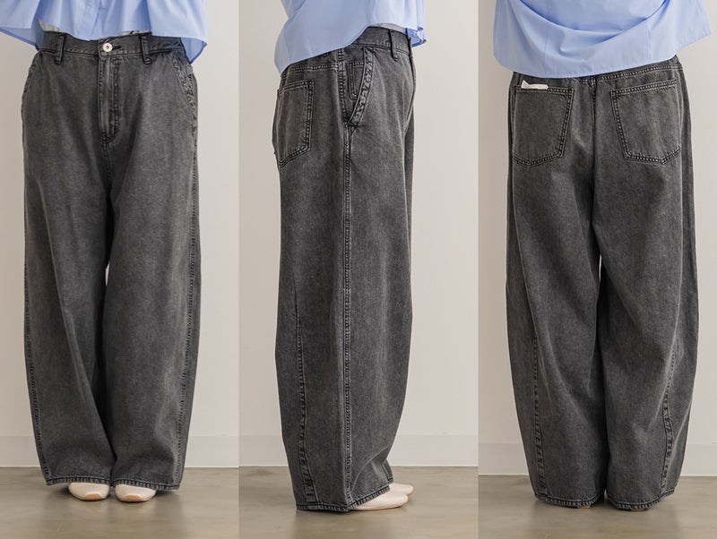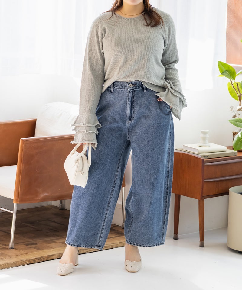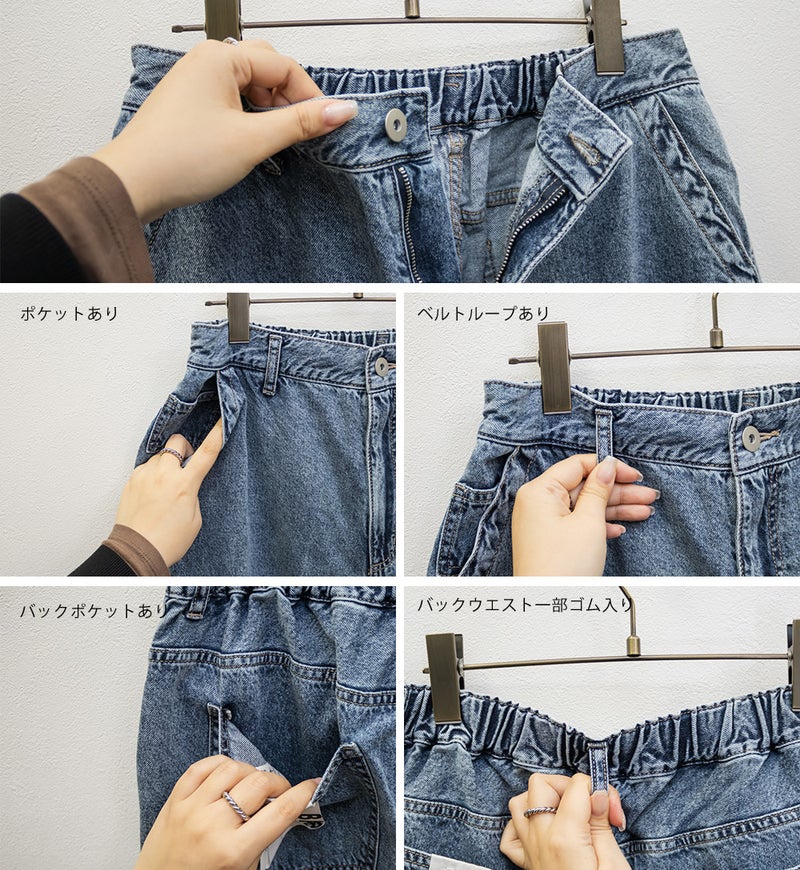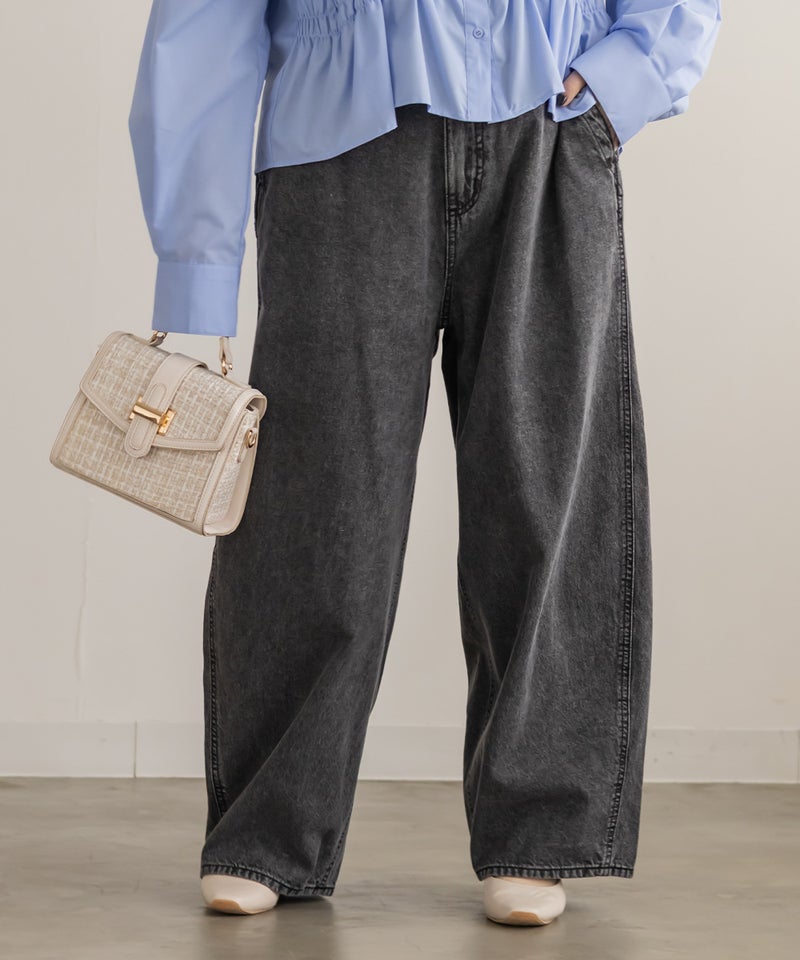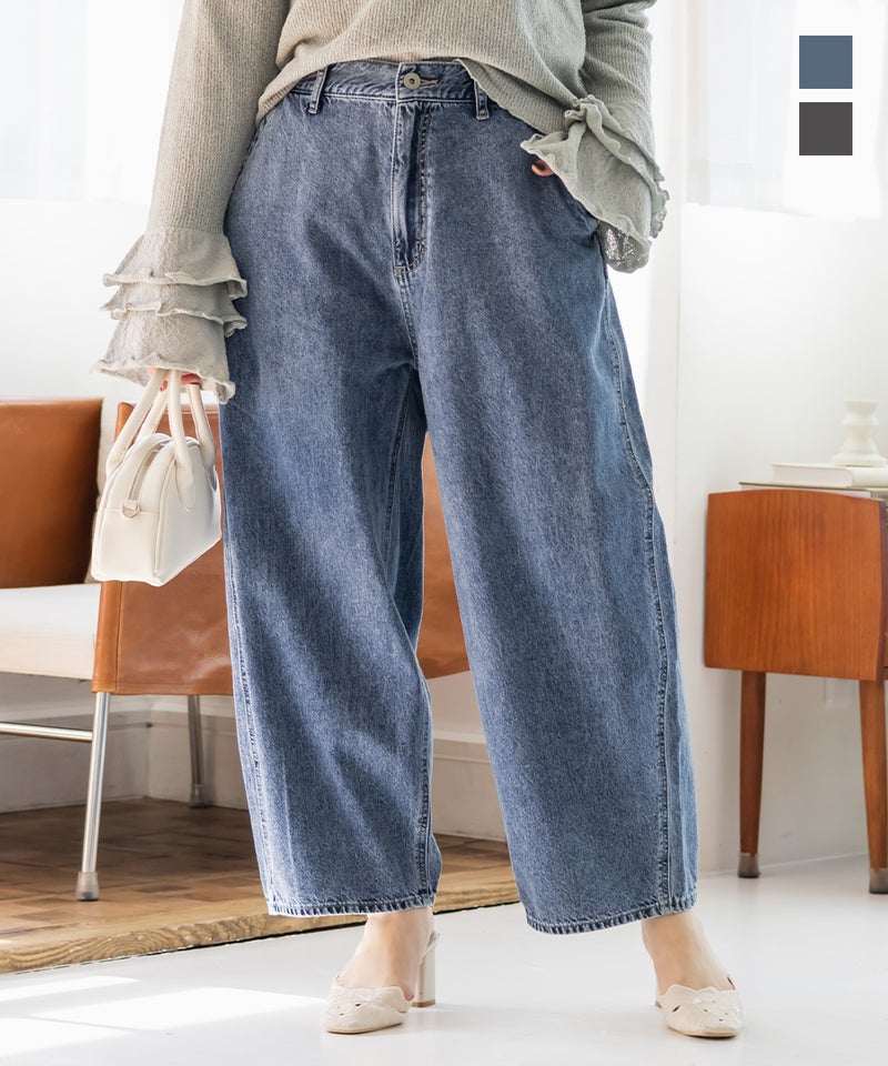 LLを着てちょうどいいサイズでした。ウエストは後ろゴムなのでらくちんに着脱できました!トレンド感たっぷりのバレルレッグのワイドめなデニムパンツで、着るだけでお洒落な印象です♪カジュアルな素材だけどキレイめにも合わせやすいシルエットでジャケットやシャツ・ブラウスと相性良くコーデできます◎