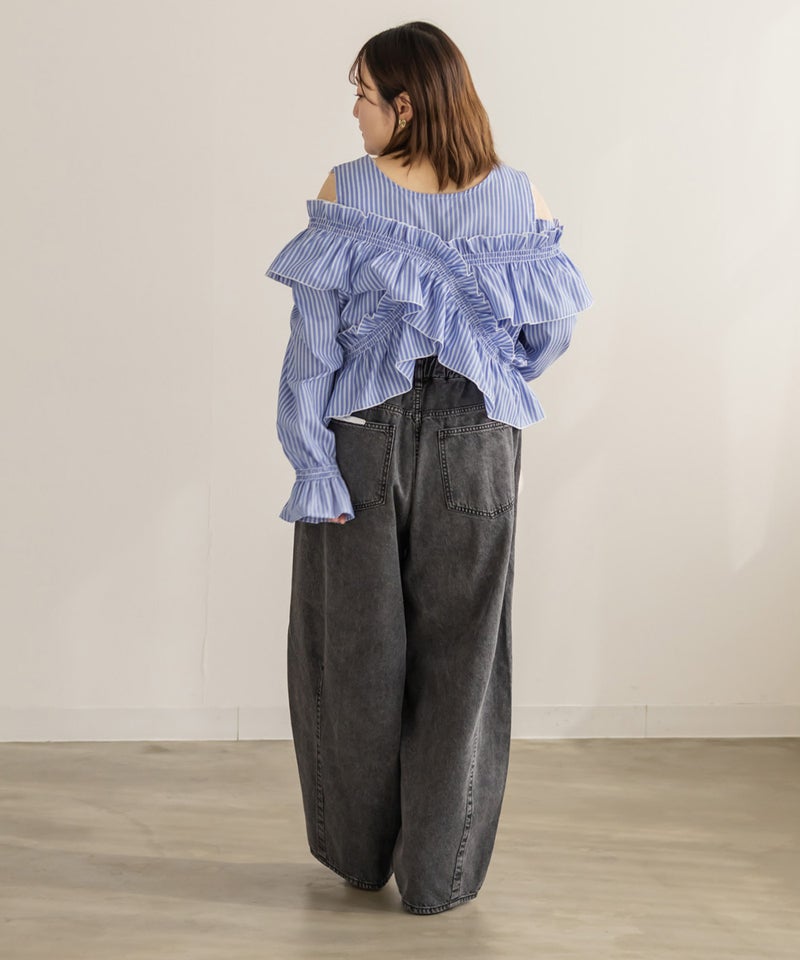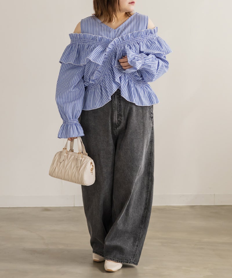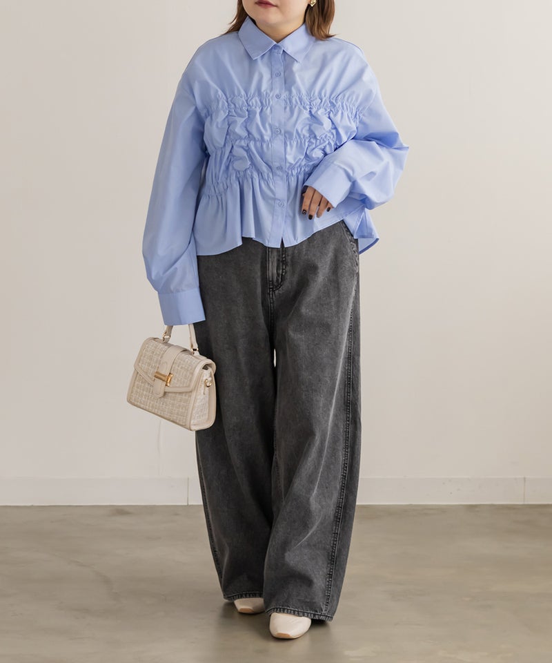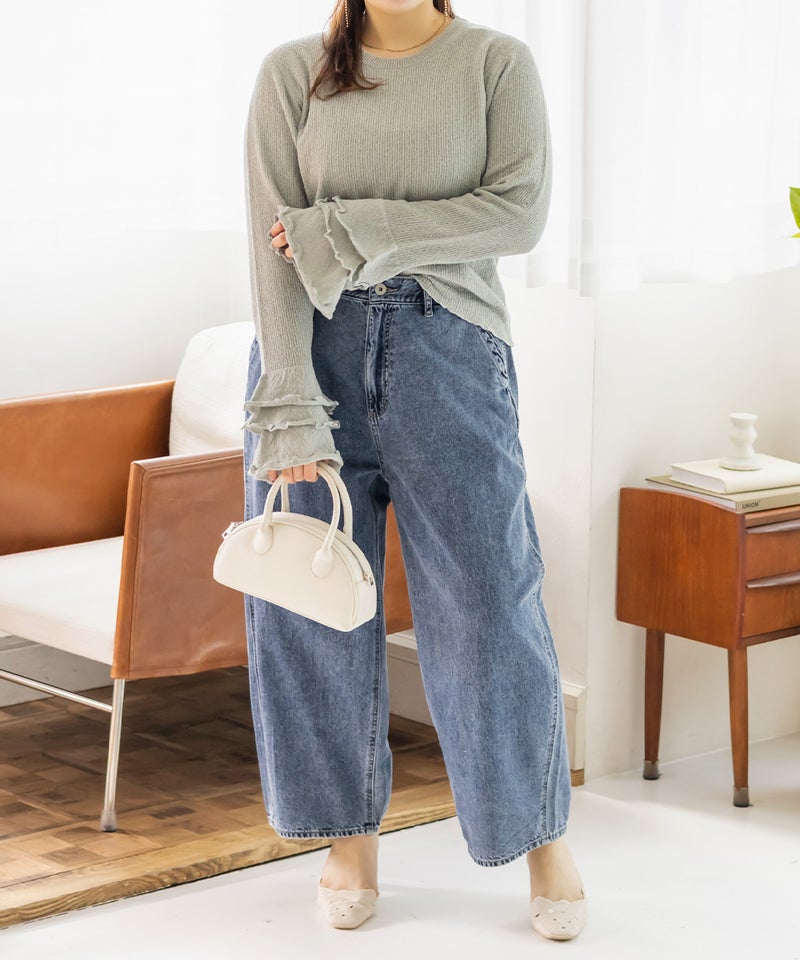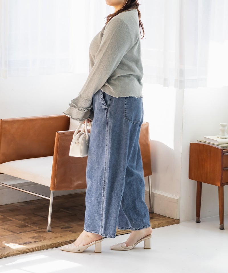LLを着てちょうどいいサイズでした。ウエストは後ろゴムなのでらくちんに着脱できました!トレンド感たっぷりのバレルレッグのワイドめなデニムパンツで、着るだけでお洒落な印象です♪カジュアルな素材だけどキレイめにも合わせやすいシルエットでジャケットやシャツ・ブラウスと相性良くコーデできます◎