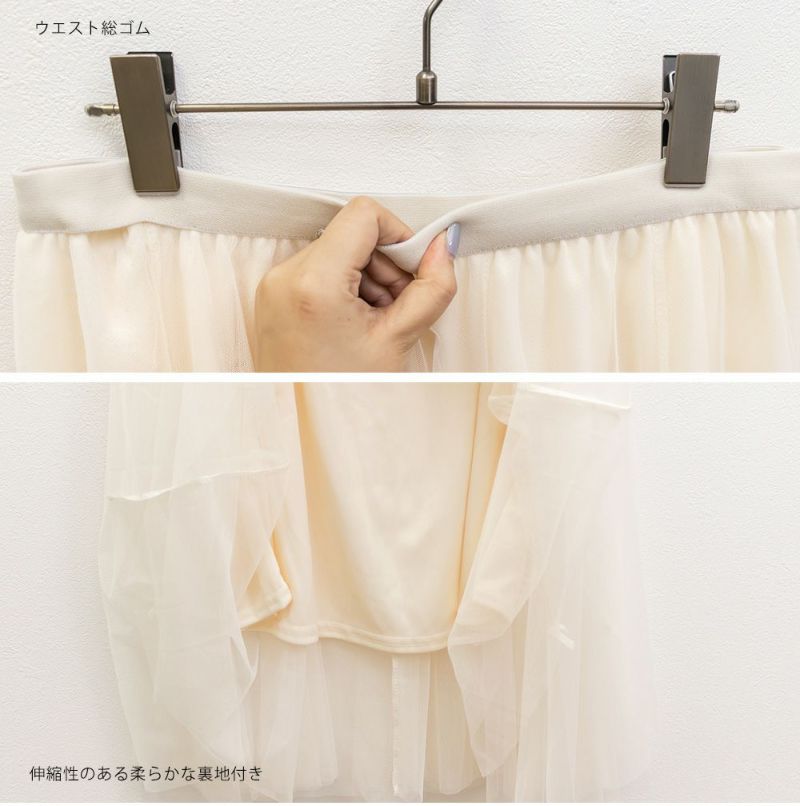 3Lを着てちょうどいいサイズ感でした。ウエストはゴムになっていて着心地ラクチン◎ひらひら軽い着心地のチュールにリボンあしらわれていて、ガーリーな1枚です♪フレアシルエットで広がりすぎないのでトップスを選ばずにすっきりと着用出来ます!オールシーズン着られるのでデートやお出かけにたくさん着回ししたいスカートです。
