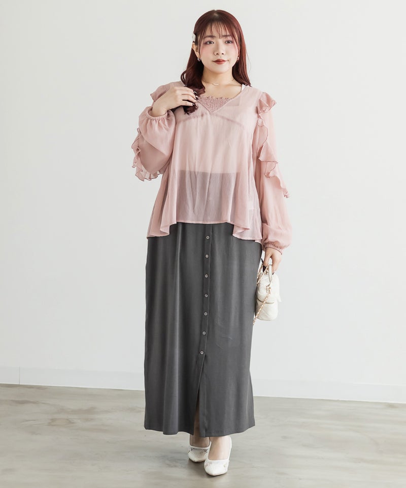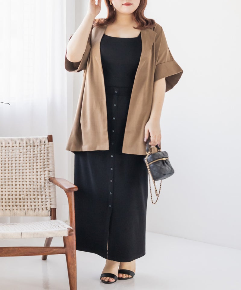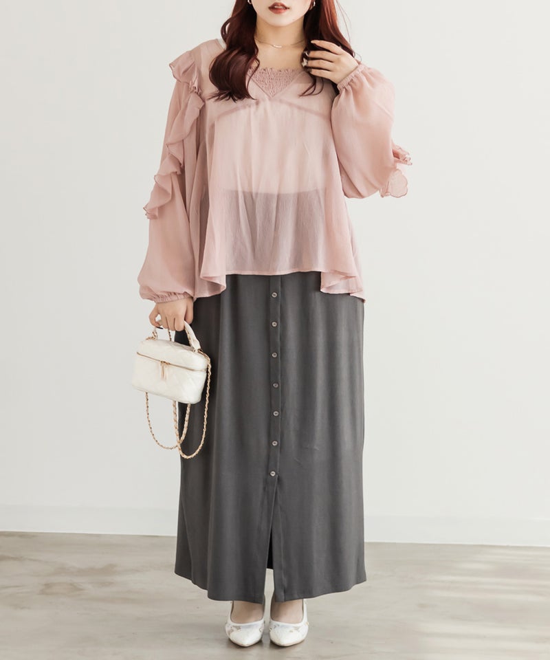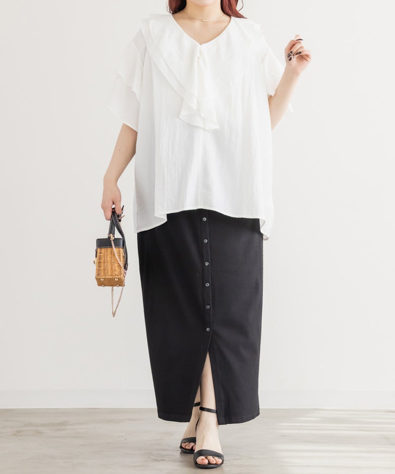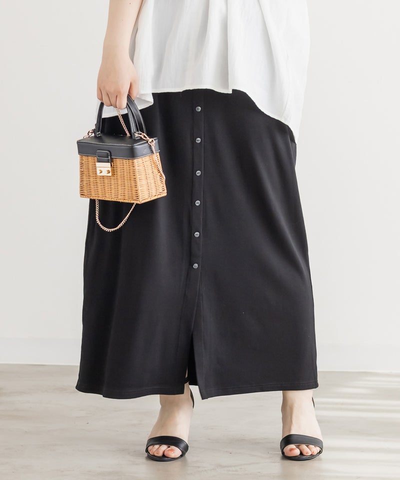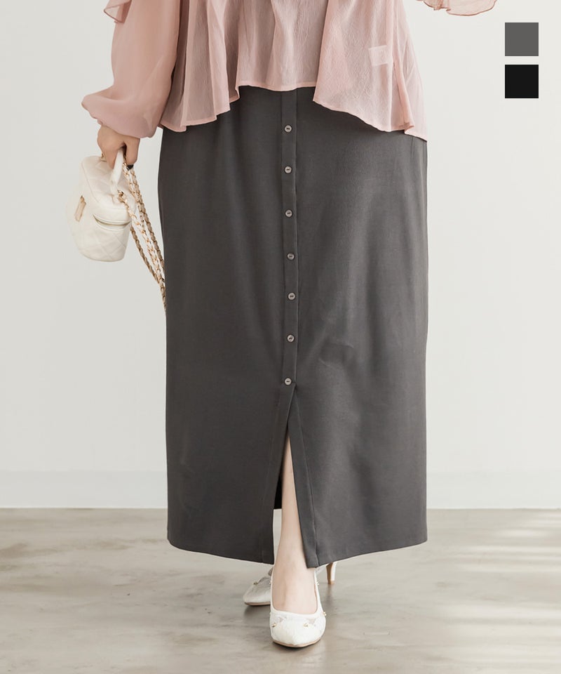 3Lサイズを着用しました。ウエストは程よくフィットし、全体的にちょうどいい着心地でした。リブ素材で伸縮性があり、動きやすく楽に着られるのが嬉しいポイントです♪ フロントボタンのデザインがさりげないアクセントになり、縦のラインを強調してくれるので、すっきりとした印象に見えました。