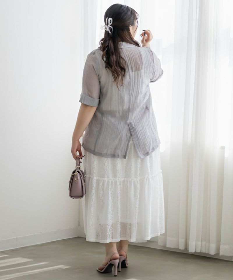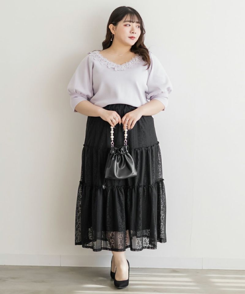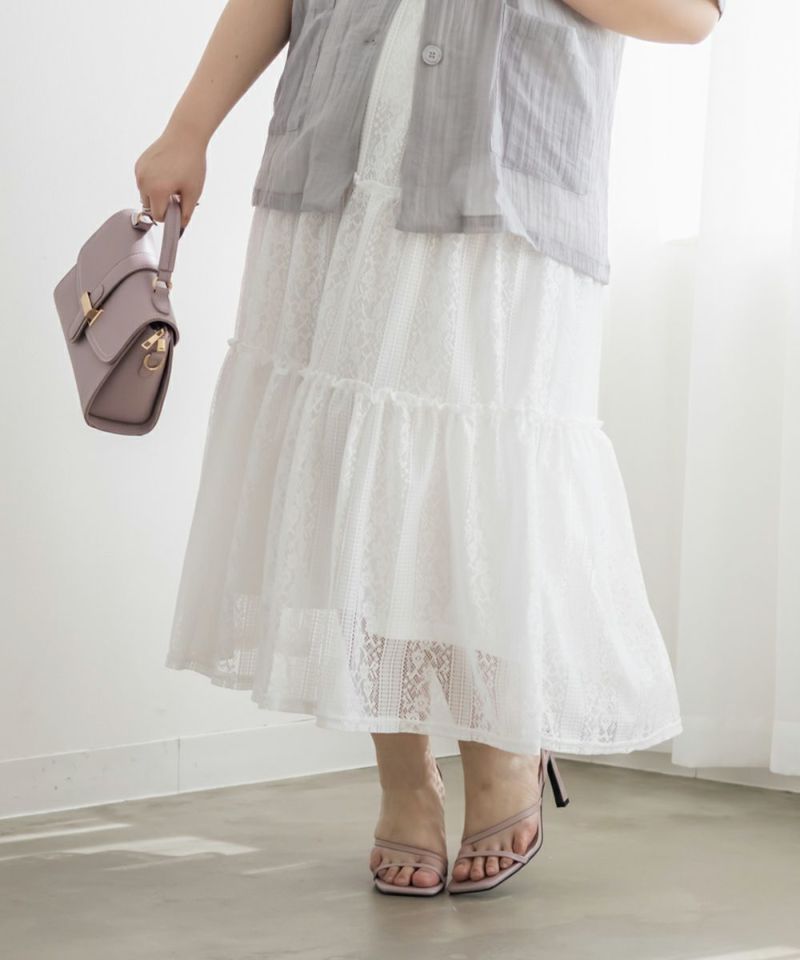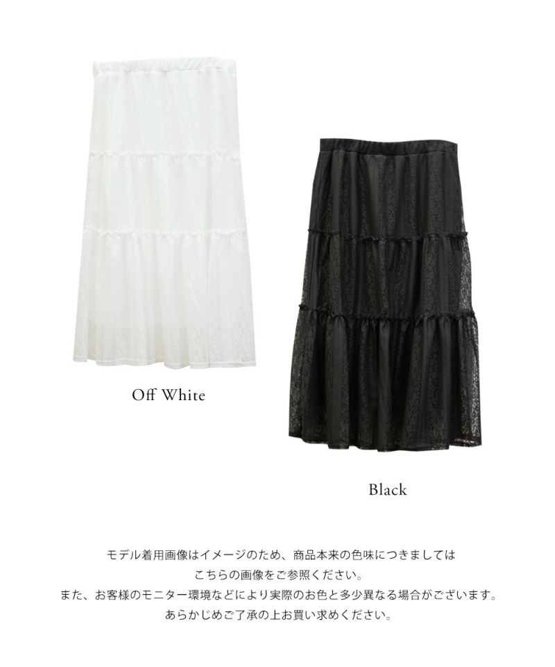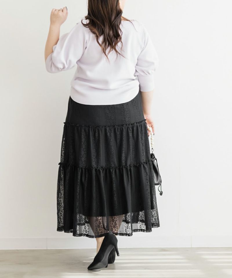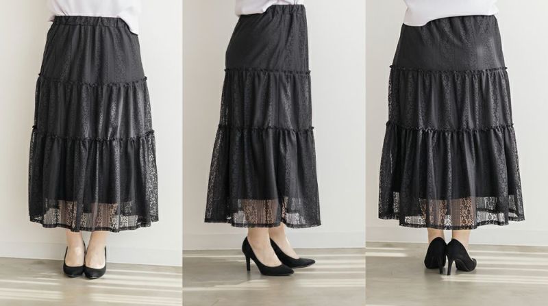 3Lサイズを着てちょうどいい着心地でした。ウエストはゴムで窮屈感も無く、フレアシルエットなので身体のラインも拾わず足さばきもしやすかったです!トレンドのレースアイテムで、今っぽい着こなしにお勧めの1枚!ティアードデザインが華やかさを引き立てるて、軽やかな印象で女性らしさをプラスしてくれるアイテムです♪ふんわりとしたシルエットが特徴的で、動きが出るたびに美しく揺れます♪カジュアルなトップスと合わせても、レースが引き立ってエレガントな雰囲気に仕上がり、普段使いにもぴったりです◎