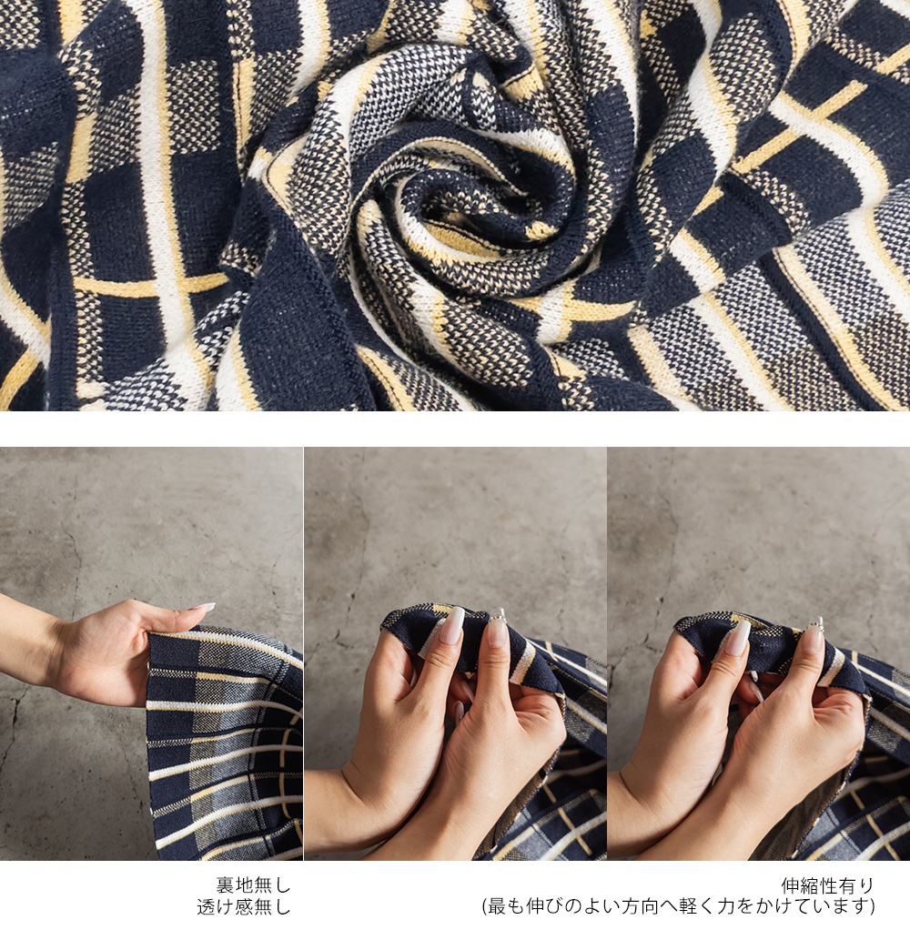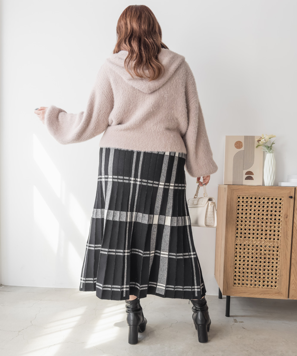 3Lサイズを着用して、ぴったりのサイズ感でした。伸縮性の良いニットなので動きやすく着用もらくに出来ました。ニット×チェック柄が秋冬ムード満載でかわいいです♪裾に向かってほどよく広がるフレアシルエットで、普段使いからお仕事まで活躍しそう!シンプルなトップスを合わせても映えるので1枚あるとコーデに大活躍しそうです◎