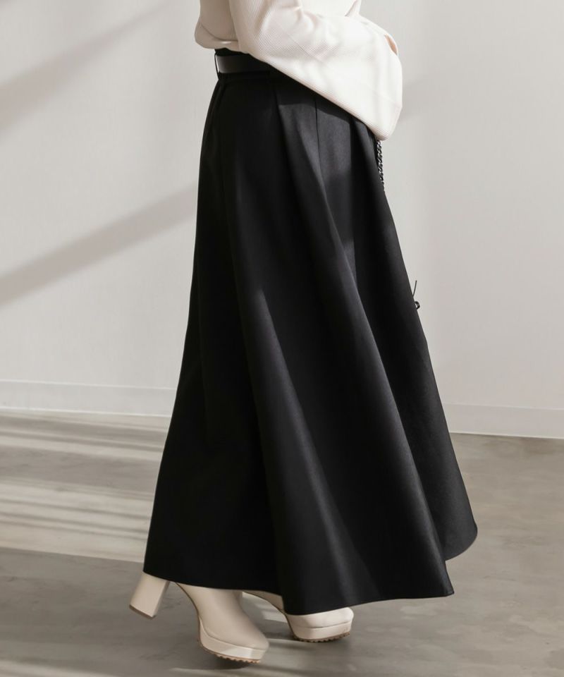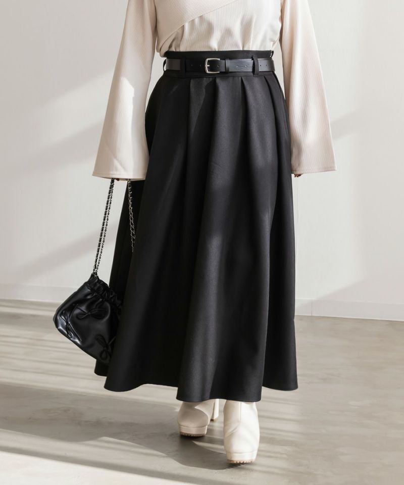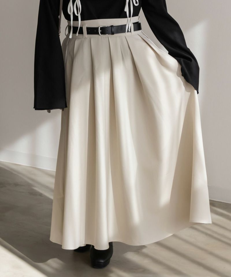 LLサイズを着用してジャストサイズでした!ウエストがしっかりしているので、サイズ感の確認をお勧めします!ウエストは巾広いゴムなので窮屈感のない着心地です◎たっぷりとしたタックがお腹やお尻をすっぽりカバーしてくれます!ウエストをしっかりキュッと引き締めてくれるデザインなのでとっても華奢見えします♪さらにベルト付きでとっても高見えな1枚です。たっぷりの生地感が歩くたびにゆれて女性らしく綺麗なシルエットです!今っぽいデザインのスカートで韓国っぽいコーデにもおすすめ!オールシーズン使えるのも高ポイントです。