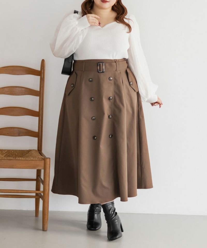 3Lを着て丁度いいサイズでした。後ろゴムなのとベルト付きでサイズ感は心配なさそうです!ハリのある生地で、Aラインのシルエットを綺麗に保ってくれます!トレンチデザインで清楚な着こなしにしてくれます♪シンプルなトップスと相性良く着られて、デートやお出かけなどにも活躍します◎