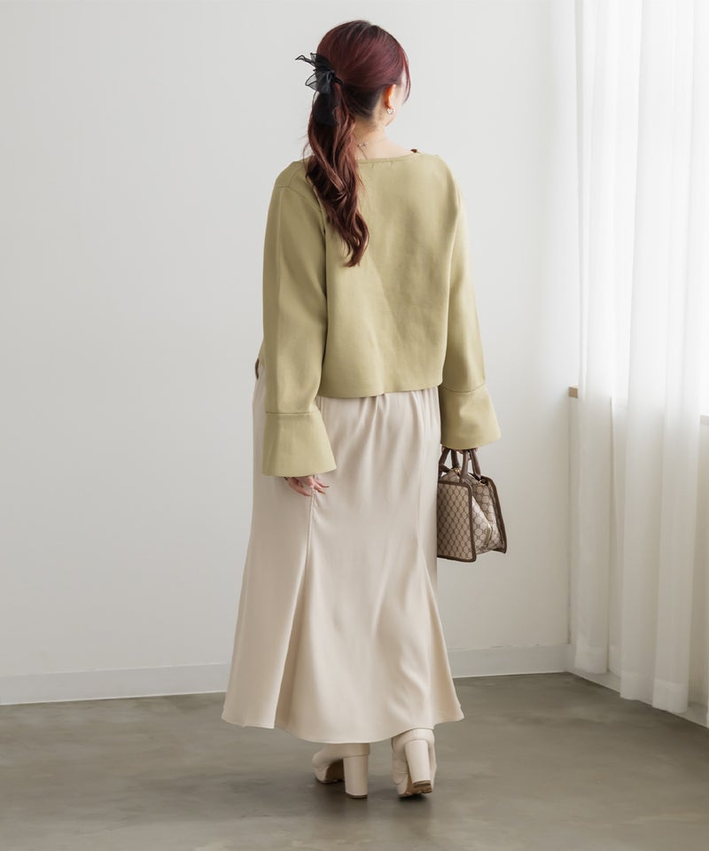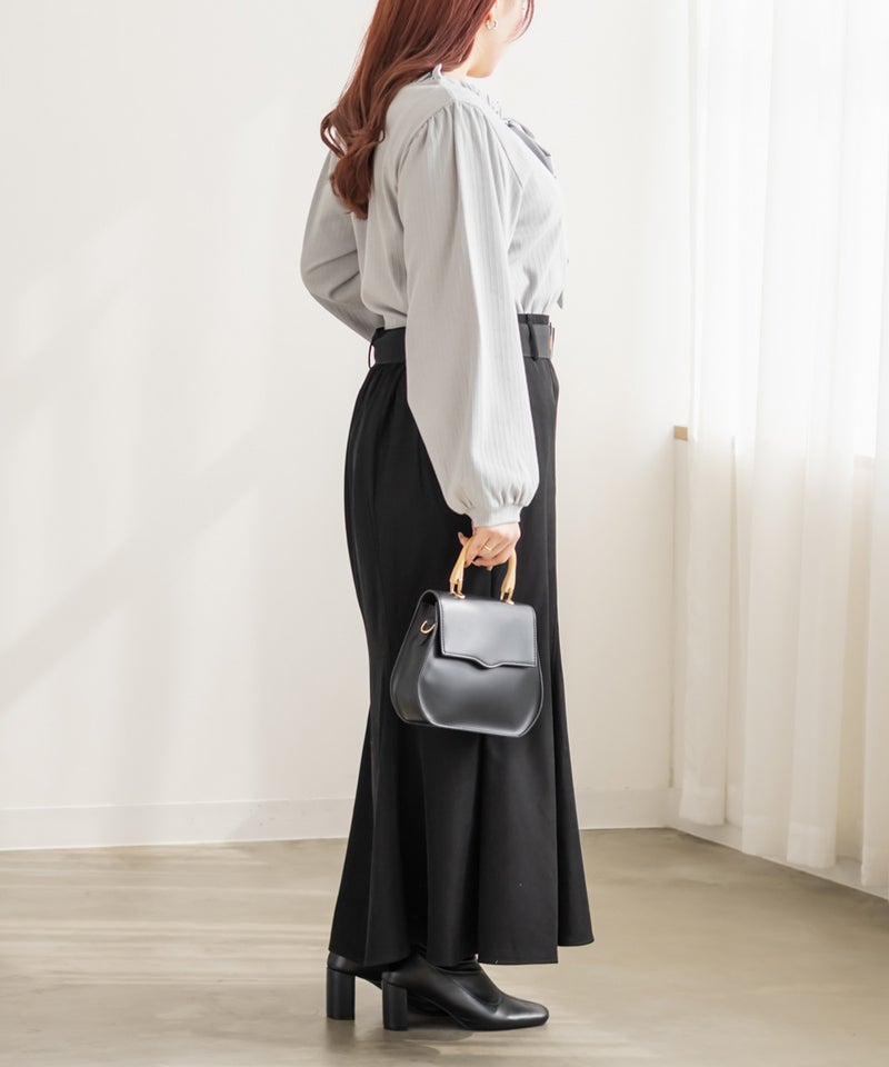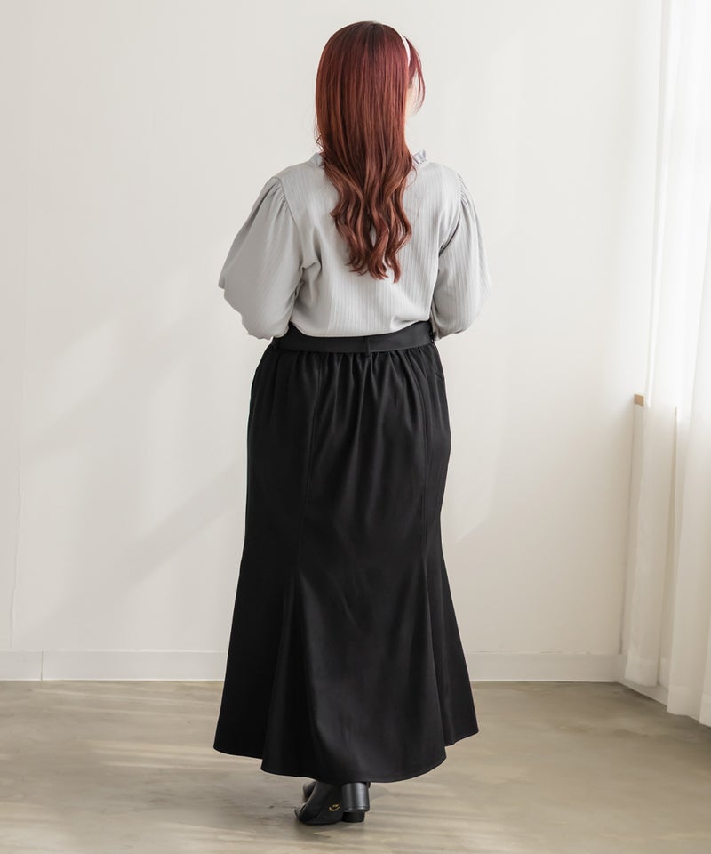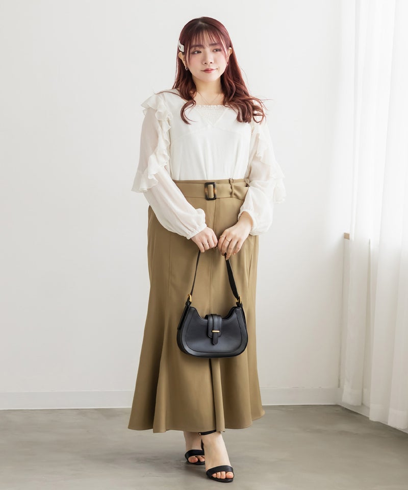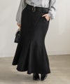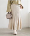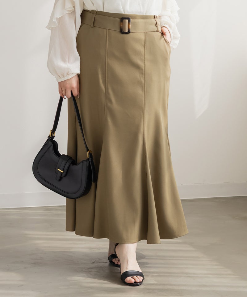 【design】女性らしく着やせできるマーメイドデザイン。お腹やヒップより足元に目が行く裾フレアにシルエットですっきりとした印象に。取り外し可能なべっ甲調のベルトがウエストを細く見せ、裾スリットが程よい抜け感を出してくれる。【material】程よくしっかりとした柔らかな素材でオールシーズン着用可能。【styling】綺麗めなブラウスと合わせてフェミニンに着こなすのもおすすめです。ロング丈で足元までカバーしてくれるから、フラットなシューズやスニーカーを履いてもバランス良くまとまります。