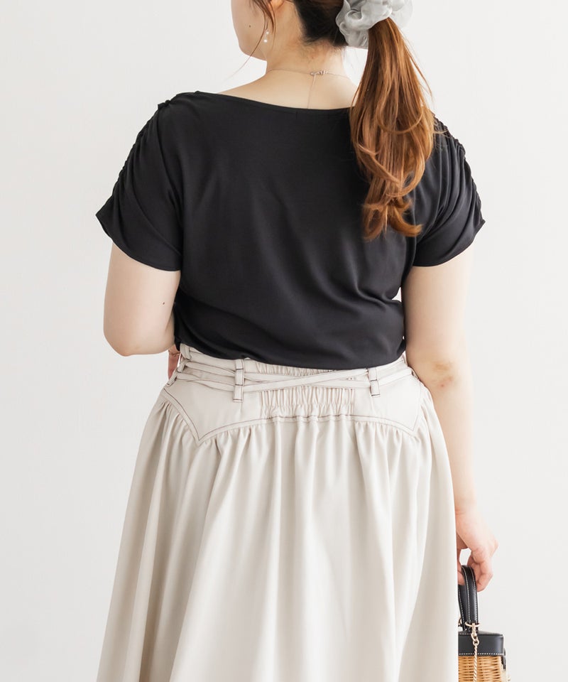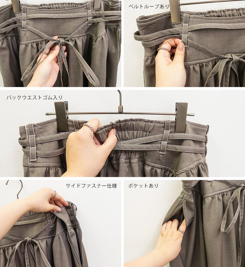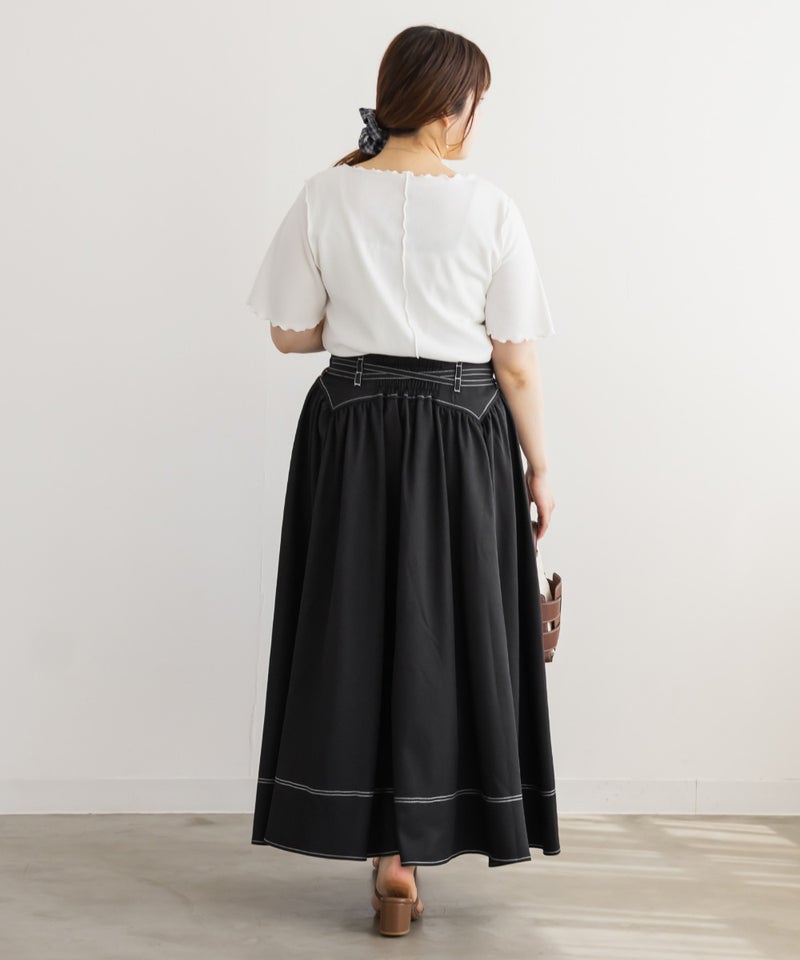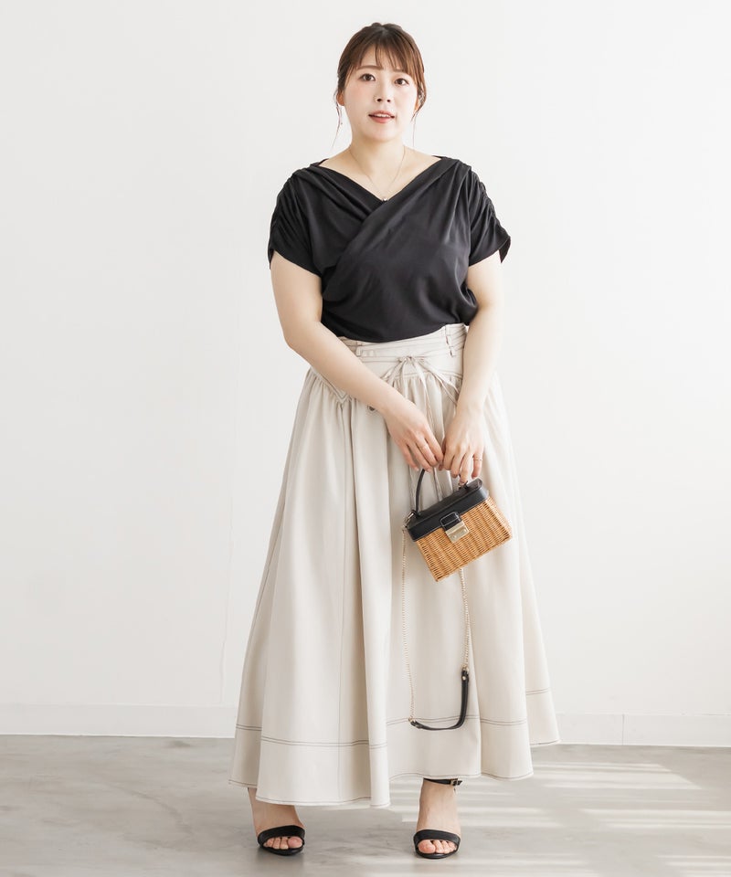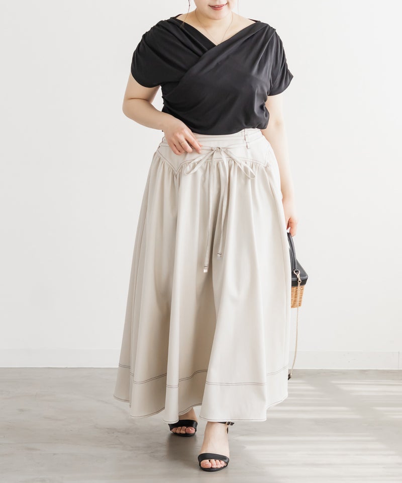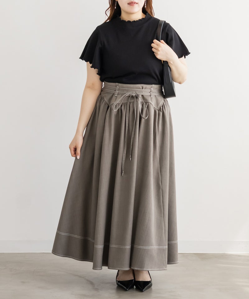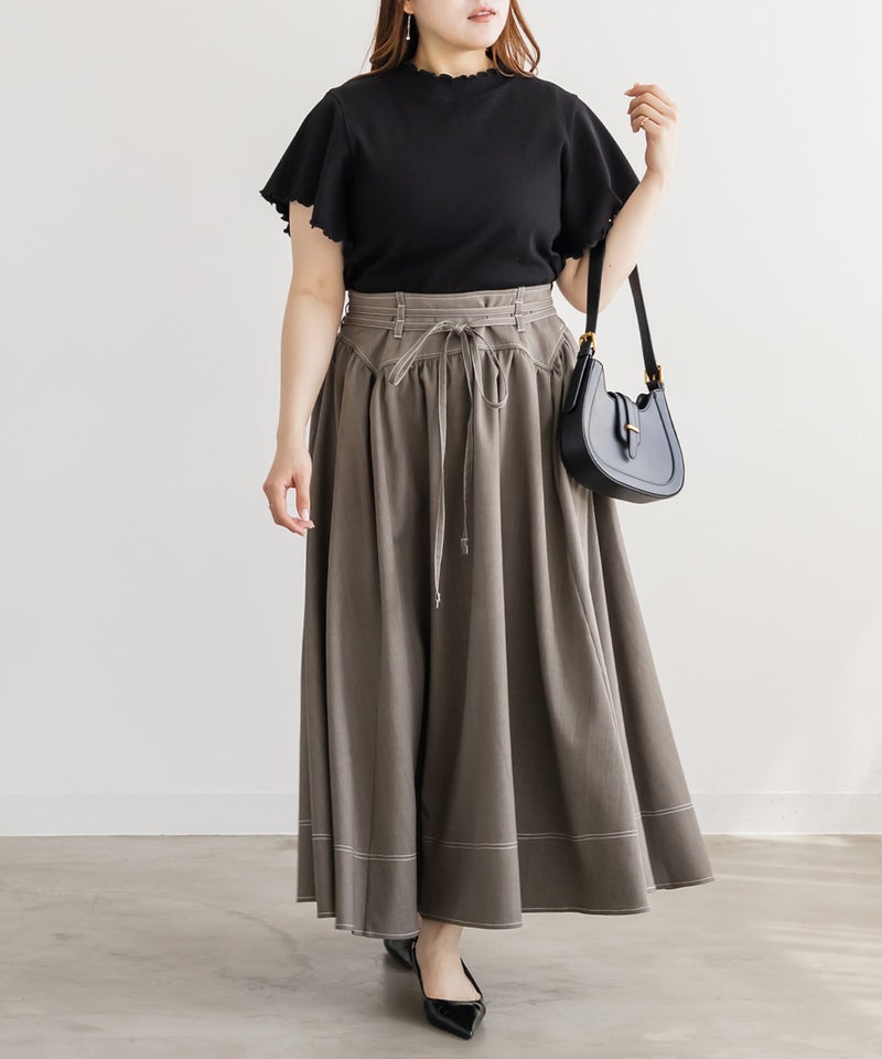 3Lサイズを着用してちょうどいいサイズ感でした!リボンベルトと切替ギャザーのデザインがしっかりポイントになっていて、シンプルなトップス合わせでもおしゃれに決まります◎配色ステッチが甘くなりすぎず、程よく大人っぽい印象で着られるのが嬉しいです♪程よくしっかりした素材感で安心感があり、シーズン問わず活躍してくれそうだなと感じました!丈感も長めで、フラットシューズやスニーカーともバランスよく合わせられます◎