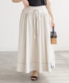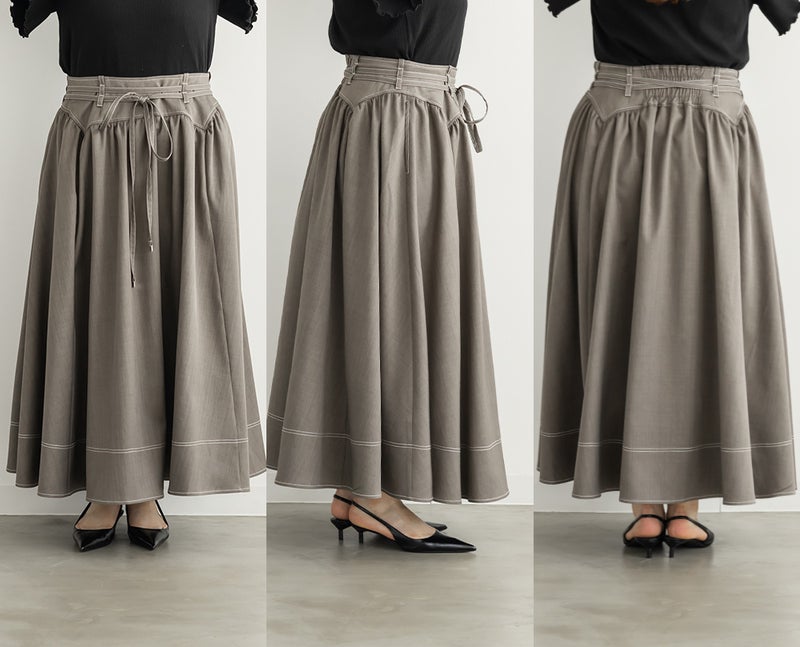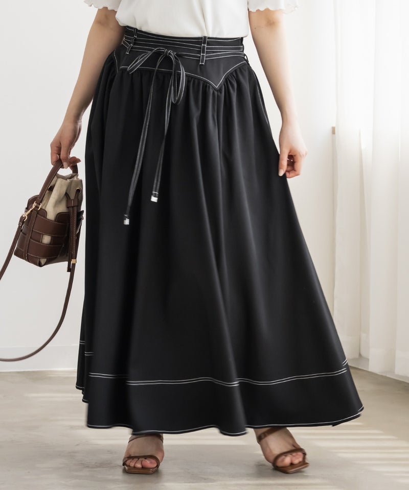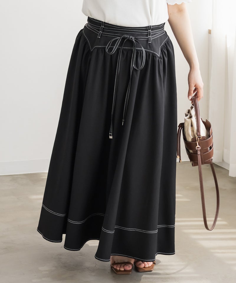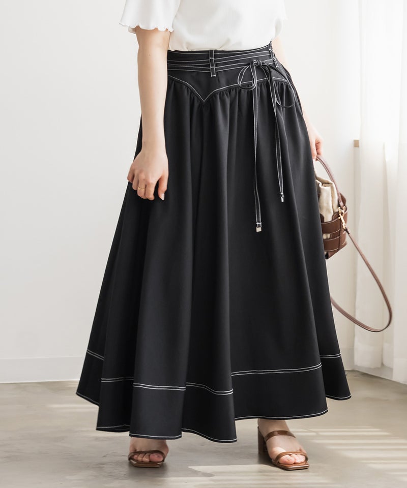 【design】リボンベルトとデザイン性たっぷりの切替ギャザーが他にはない洗練された印象のロングスカート。配色ステッチが可愛くまとまりすぎないハンサムさをプラス。【material】程よくしっかりとした布帛生地。オールシーズン着用可能な素材です。【styling】デザイン性たっぷりのスカートにはシンプルなトップスがおすすめ。無地のTシャツをインして、華奢なネックレスを合わせるれば落ち着いていながら品のある着こなしに。ロング丈だからフラットシューズやスニーカーにも合わせやすい。