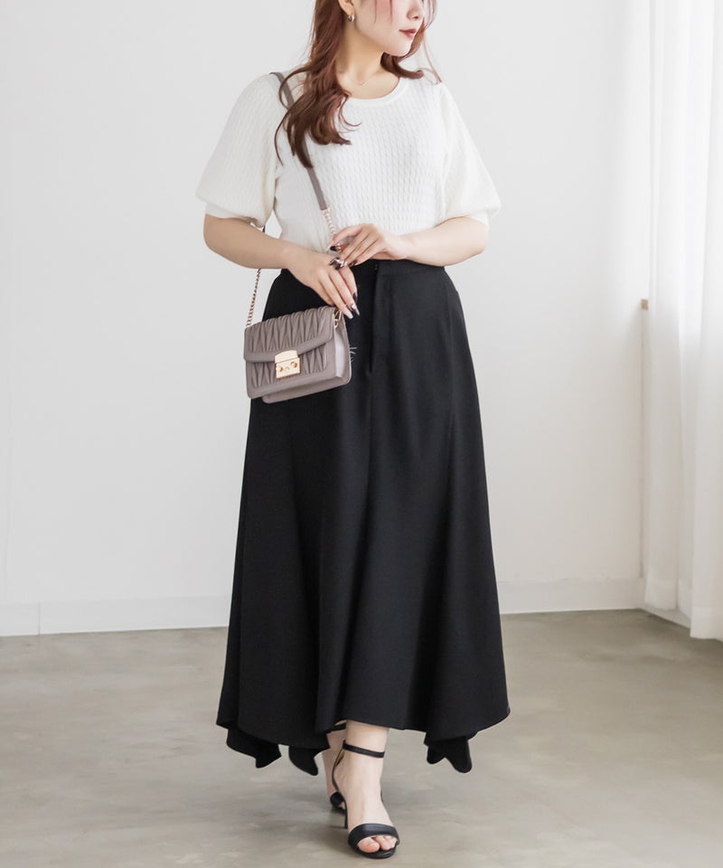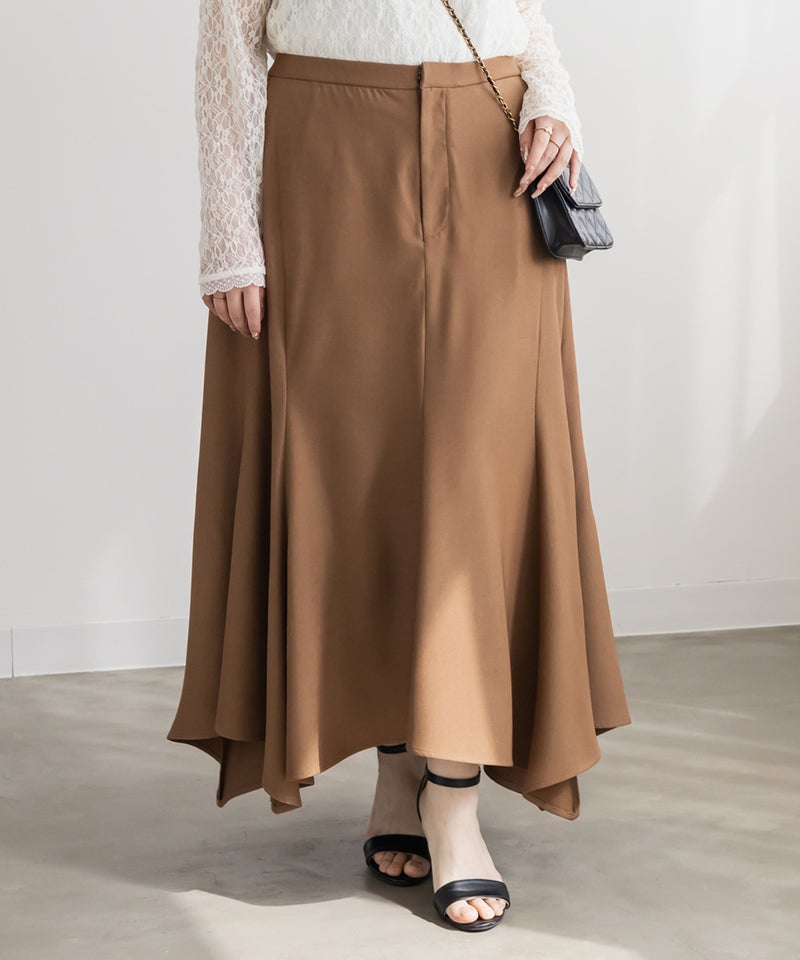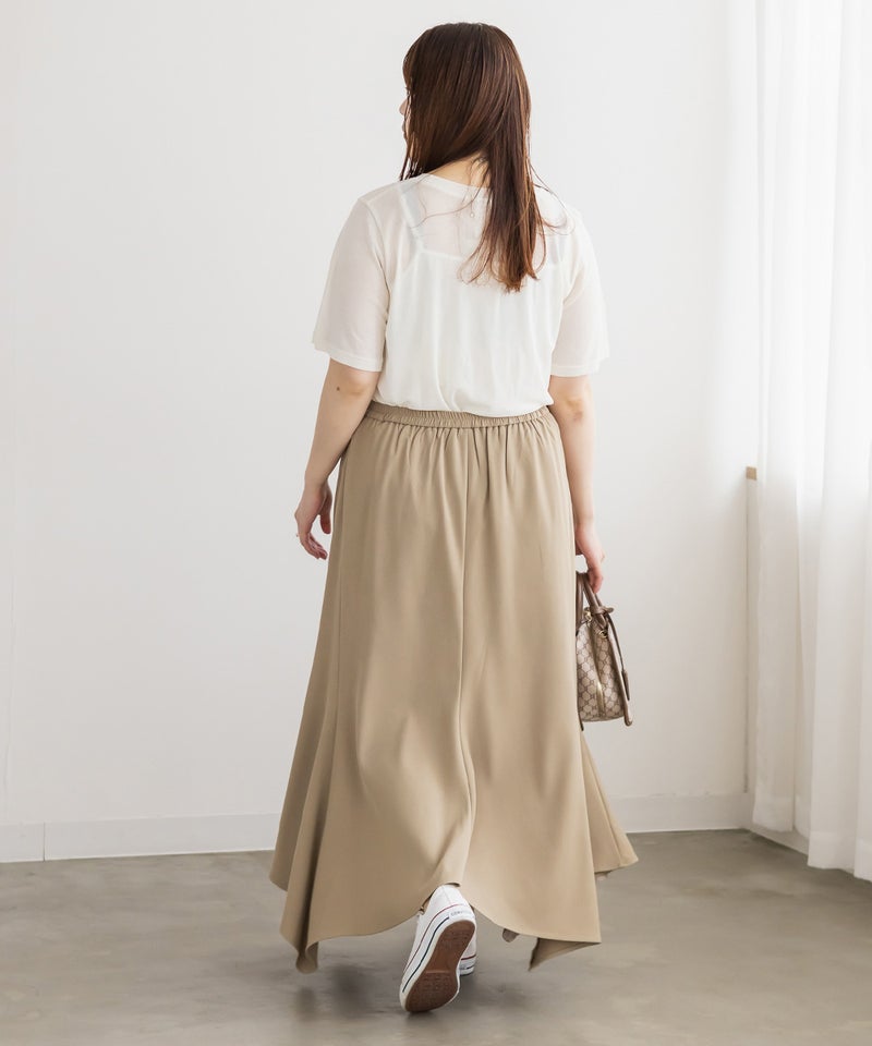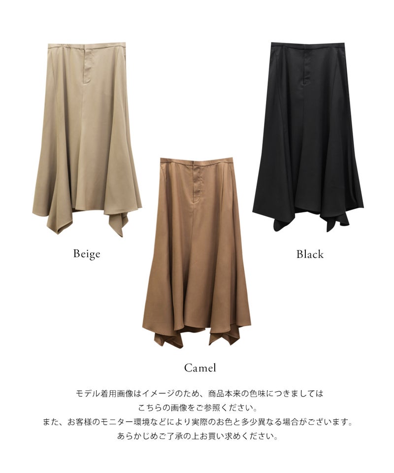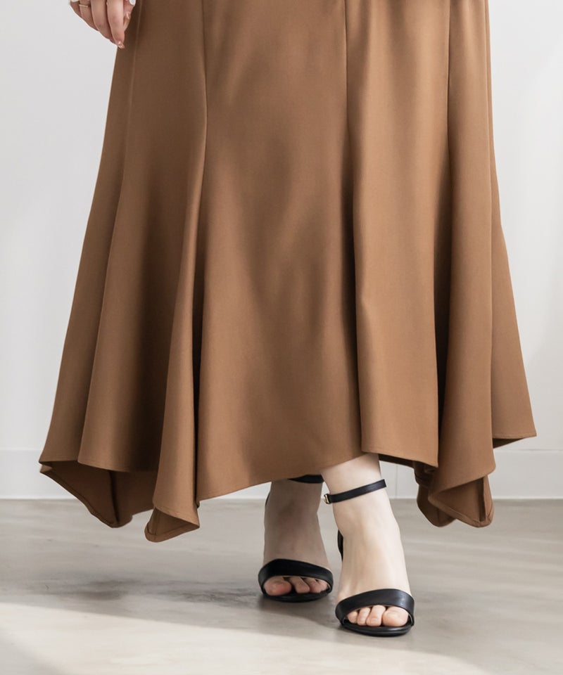 【design】イレヘムデザインで自然なフレアシルエットを表現。裾の揺れ感と落ち感のある素材で上品な印象に。オールシーズン使えて、綺麗めから大人カジュアルまで合わせやすい着回しの効く1枚。【material】落ち感のある素材【styling】トップスをインした着こなしもおすすめですが、ゆるめのトップスをあわせてシルエットの綺麗さをいかした着こなしもおすすめです。ロング丈なので足元の合わせが色々な靴で楽しめる着映えする一枚です。